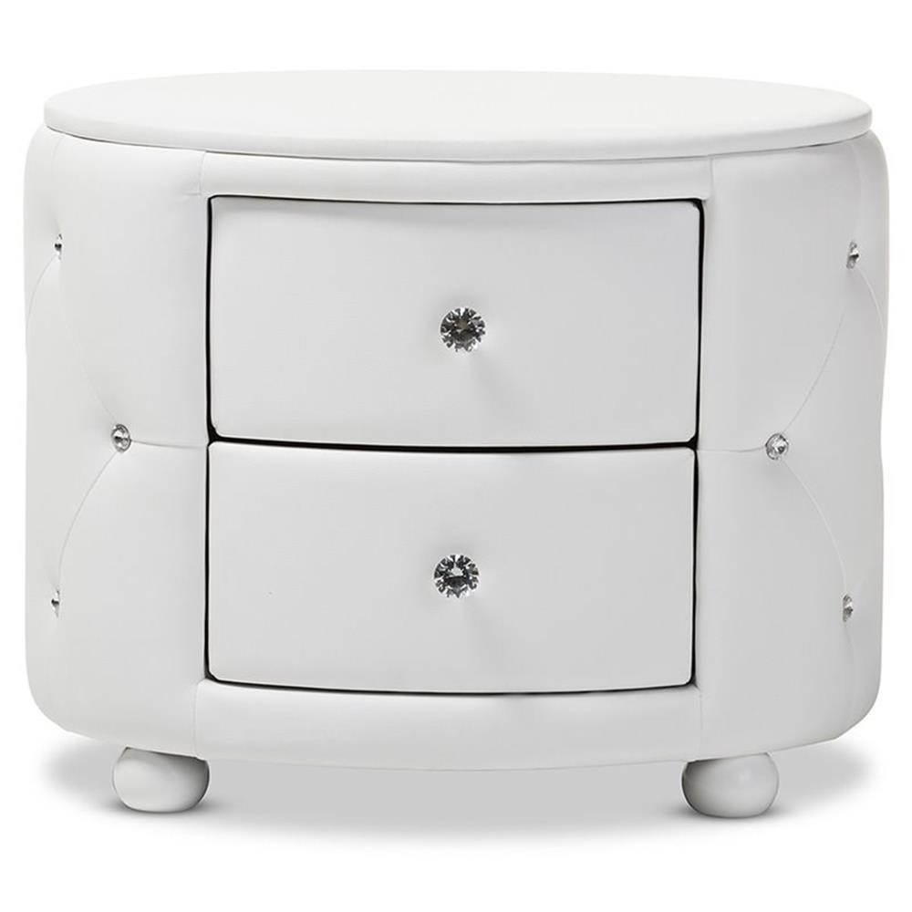 Inspired by Hollywood glamour modern design, the Davina nightstand is an icon of modernization. Constructed of solid rubberwood and plywood, this oval-shaped bed side table is fully upholstered in white faux leather for a smooth surface with a matching MDF top. Faux crystal buttons are tufted throughout to create a blink-blink visual effect. Marry style and function with this beautiful bedside table. With two spacious drawers, this will help organizing your bedroom accessories. Faux crystal knobs and the matching wooden legs will instantly attract all of your guests' attentions. Made in Malaysia, the nightstand will arrive fully assembled. Features: Hollywood glamour style upholstered nightstand Two drawers for storage and organization Faux crystal knobs for a glamour touch Rounded wooden legs Padded with foam