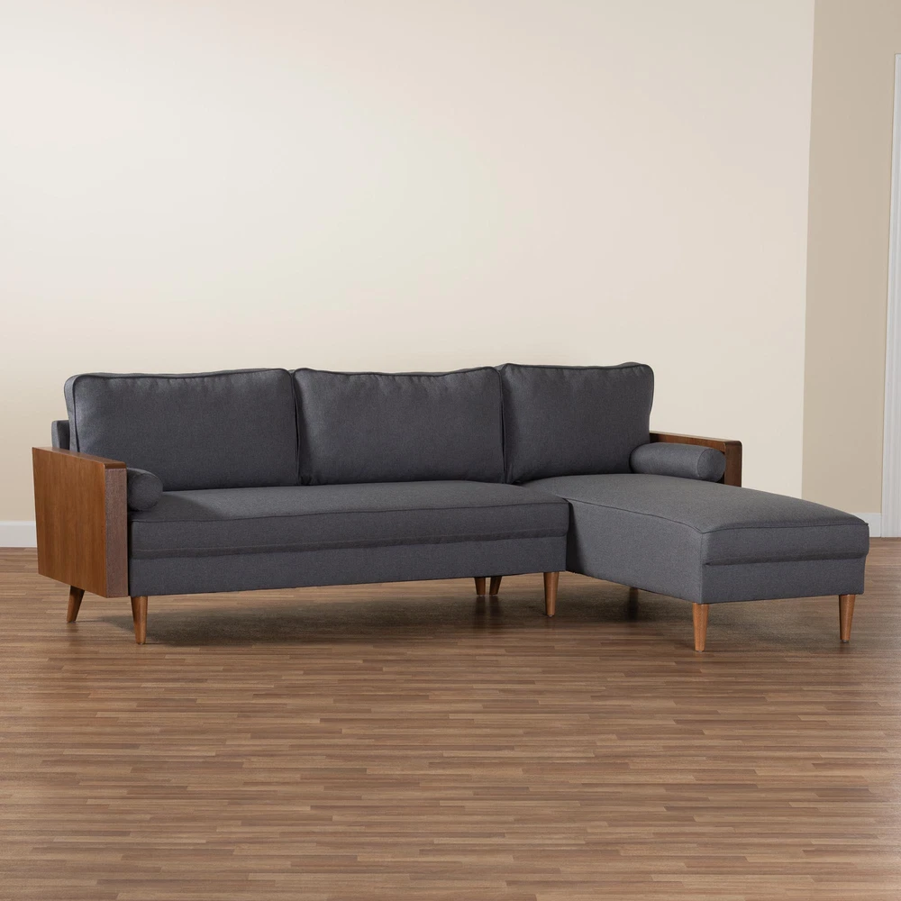 Incite an atmosphere of serene elegance in your space with the lovely Harleson sectional sofa. Made in Malaysia, this premium expression of mid-century style consists of a strong wood frame padded with luxuriously plush foam and upholstered in sumptuous fabric. Smooth armrests border the frame with flowing geometry while the seats and chair are fitted with plush cushions and pillows for superb comfort. The Harleson requires assembly and utilizes tapered legs for excellent stability and support while complementing any mid-century setting. Lending a sense of classic exuberance, the Harleson sectional sofa embellishes any space. Features: Mid-century modern sectional sofa with right facing chaise upholstered in silky smooth fabric Constructed from Rubberwood and Engineered Wood Track arms Includes removable back cushions and two (2) arm pillows Seats filled with three layers of high-density foam padding with supportive pocket coil in the middle layer Tapered legs Specifications: Product Dimensions: Overall Sofa: 97.50" W x 67.40" D x 34.30" H; Overall Sofa Seating: 90.90" W x 25.00" D (2-Seater) or 67.40" D(Chaise) x 17.00" H; Overall 2-Seater: 69.00" W x 33.00" D x 34.30" H; Overall Chaise: 28.50" W x 67.40" D x 34.30" H; Backrest: 16.00" H