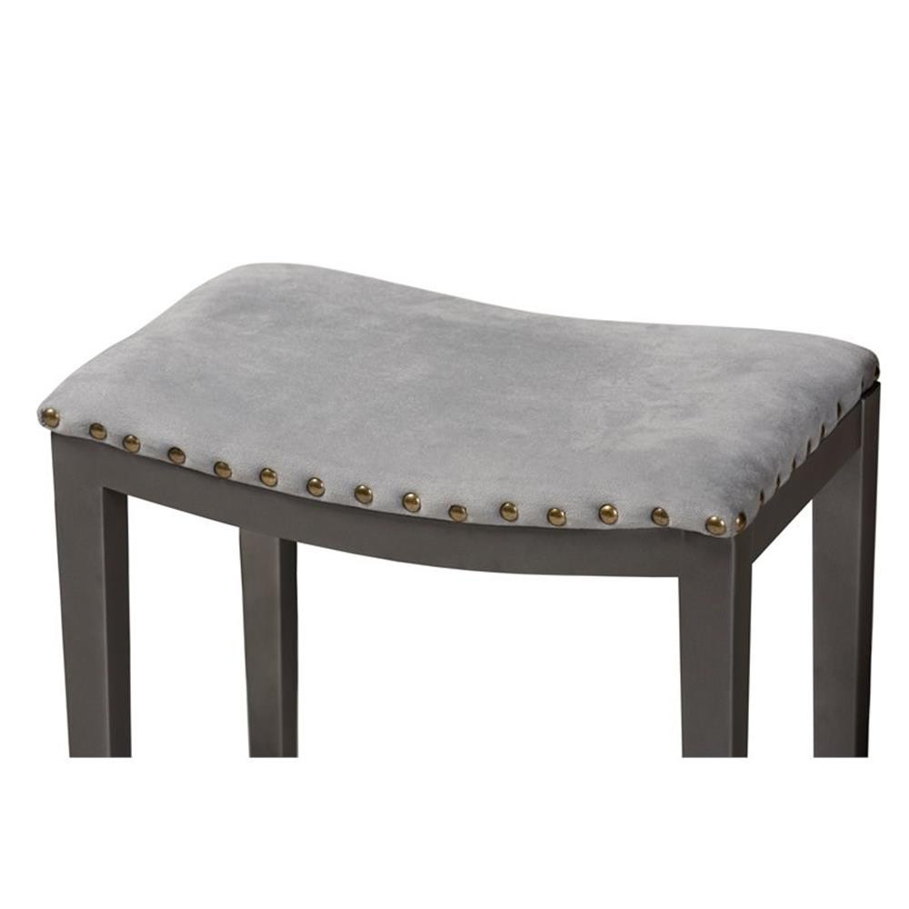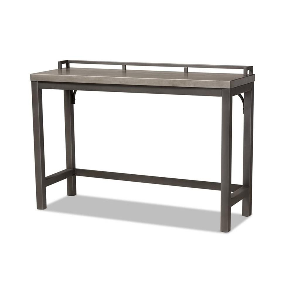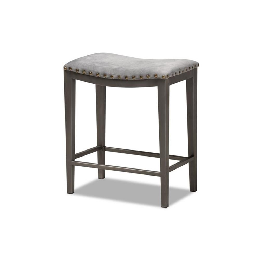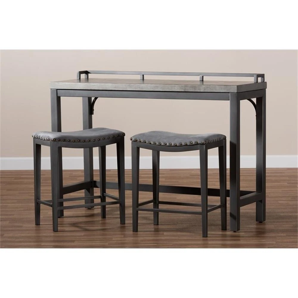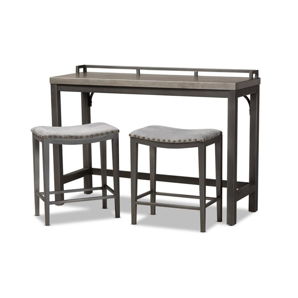 Recreate the feel of your favorite coffee shop with the Noll counter table set. Featuring a clean, modern desgin, the Noll set includes one counter height table and two counter stools. Each piece is built from sturdy metal in a Gray finish, giving the set a cool industrial look. The table offers ample surface space to use for dining or working. The stools are upholstered in a soft Gray polyester fabric and padded with foam for the utmost sitting comfort. Chic brass nailhead studs highthe curved seats. This versatile set is well suited for use as a casual dining setup in the kitchen or as a workspace in the living room. The Noll counter table set is made in China and requires assembly. Features: Modern and contemporary set includes one (1) counter height table and two (2) counter stools Table construction: metal and MDF wood; Chair construction: metal Gray finish Seats are upholstered in polyester fabric and padded with foam Brass nailhead trim Specifications: Seat Depth: 38" High x 54" Wide x 18" Deep; Legs: 34" High Stool Dimensions: 24" High x 20" Wide x 14" Deep; Seating Dimensions: 20" Wide x 14" Deep x 24" High (from Floor); Legs: 22.5" High