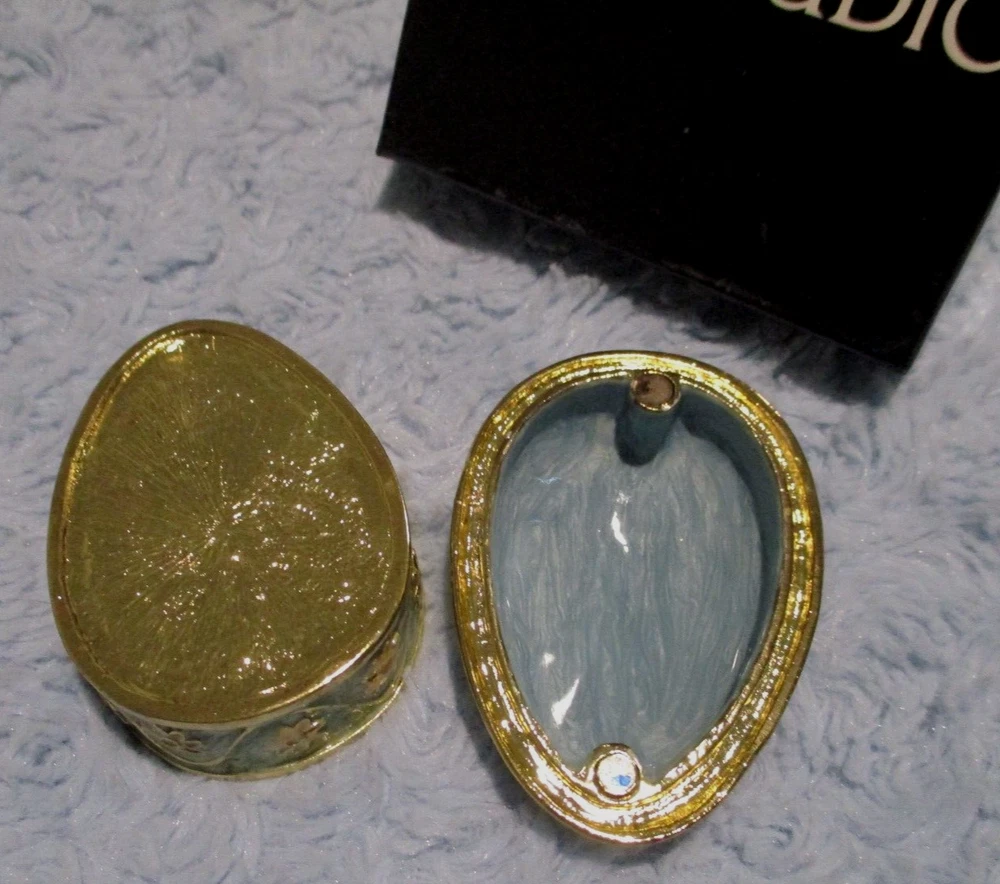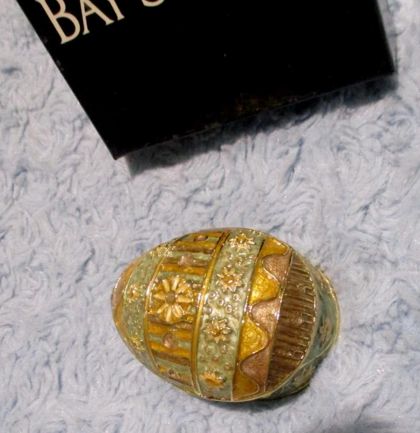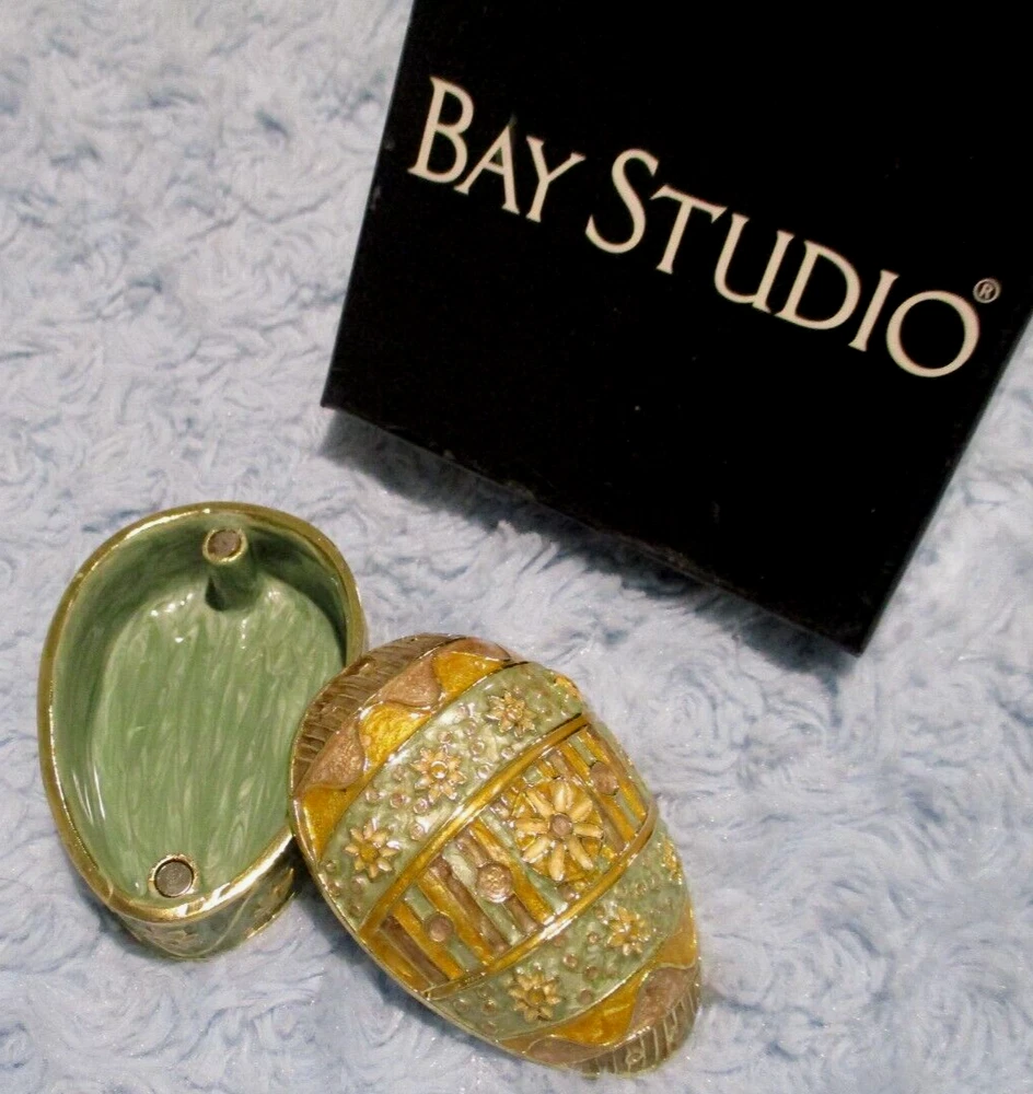 Bay Studio Enamel Gold-Tone Easter Egg Magnetic Trinket Box comes in very good p re-owned condition in original box... no defects or damage. Clean, heavy piece with raised Easter Egg design. Box has light storage and sticker wear. Measures approx. 1 1/2" tall, 3 1/4" long by 2 1/4" at widest point. Sorry, I do not take returns for size or color so please email questions. Thank you! S moke & pet free environment. I always try to combine shipping... please don't hesitate to ask. US shipping reminder: Should an item arrive damaged, please note: IT IS INSURED. Contact immediately with photos, will give options regarding insurance filing. I will gladly file the claim but you must pay to ship the item back. You may file the claim yourself at your local Post Office or online without any cost of return shipping. Filing claims may take up to 6 weeks or longer, depending on the USPS. Outside US shipping may be done by eBay International. If you have any questions, please contact me. Thank you!