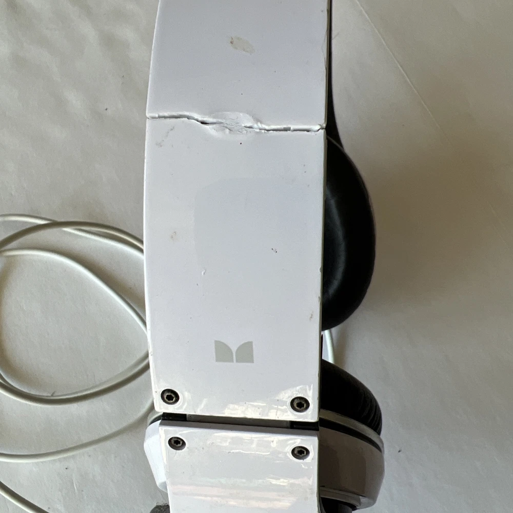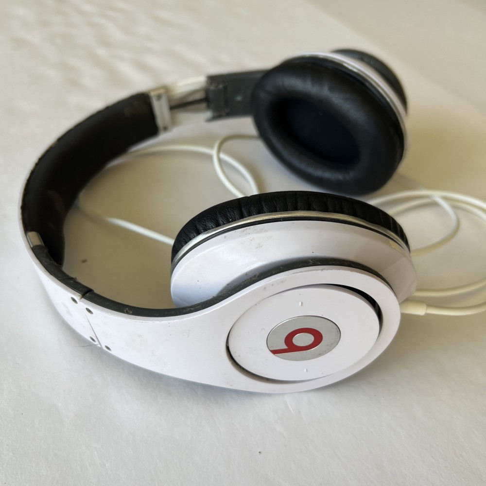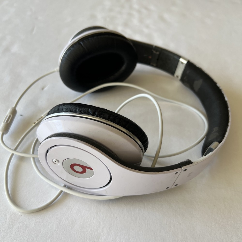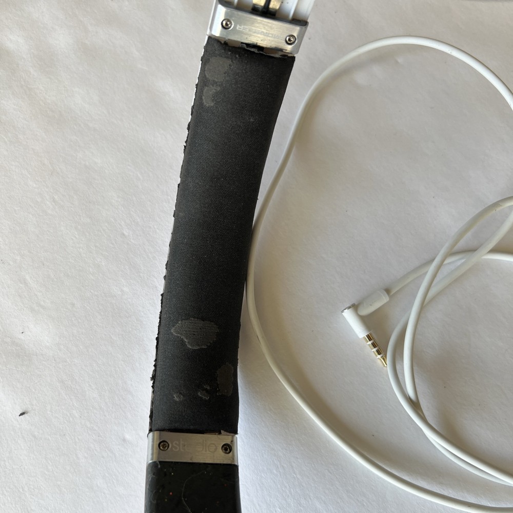 Beats By Dre - STUDIO Headphones - Over Ear - White - Working, Needs Repair Working and sounds great, but there is a plastic piece on the headset chipped off. Earpad foam is in very good condition, but headband is peeling off and disintegrating a bit. See pics for exact details. Ships out same day or next day via USPS in most cases Thanks for looking!
