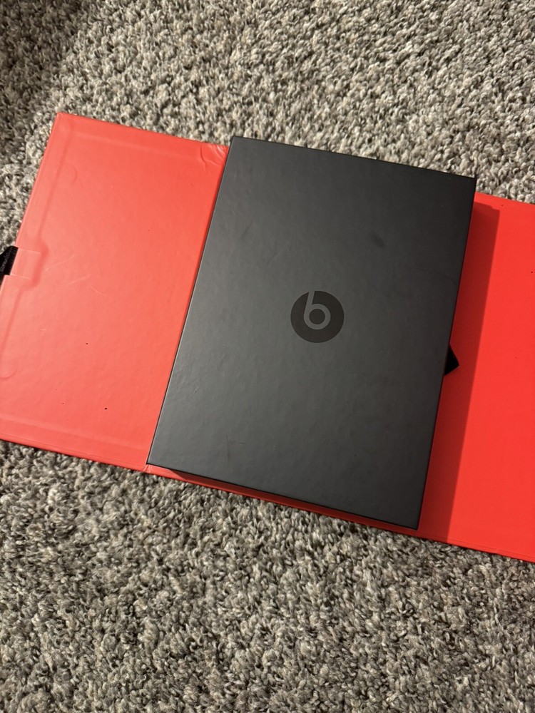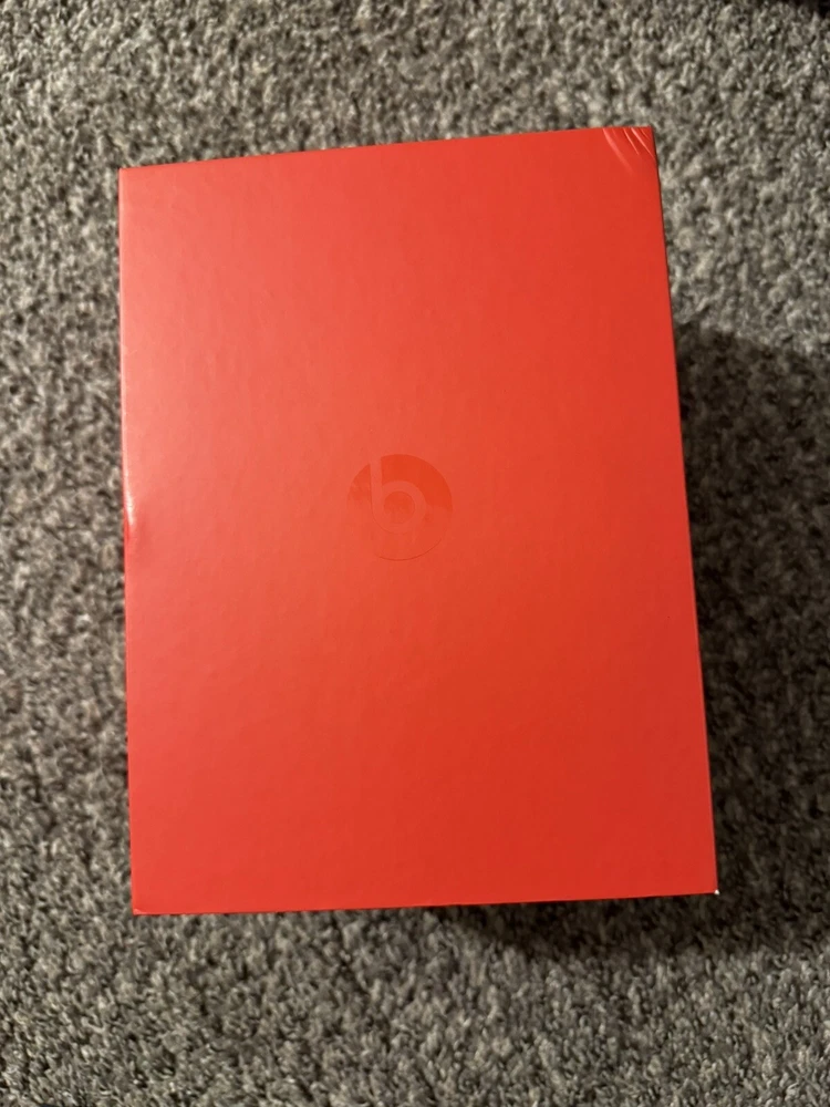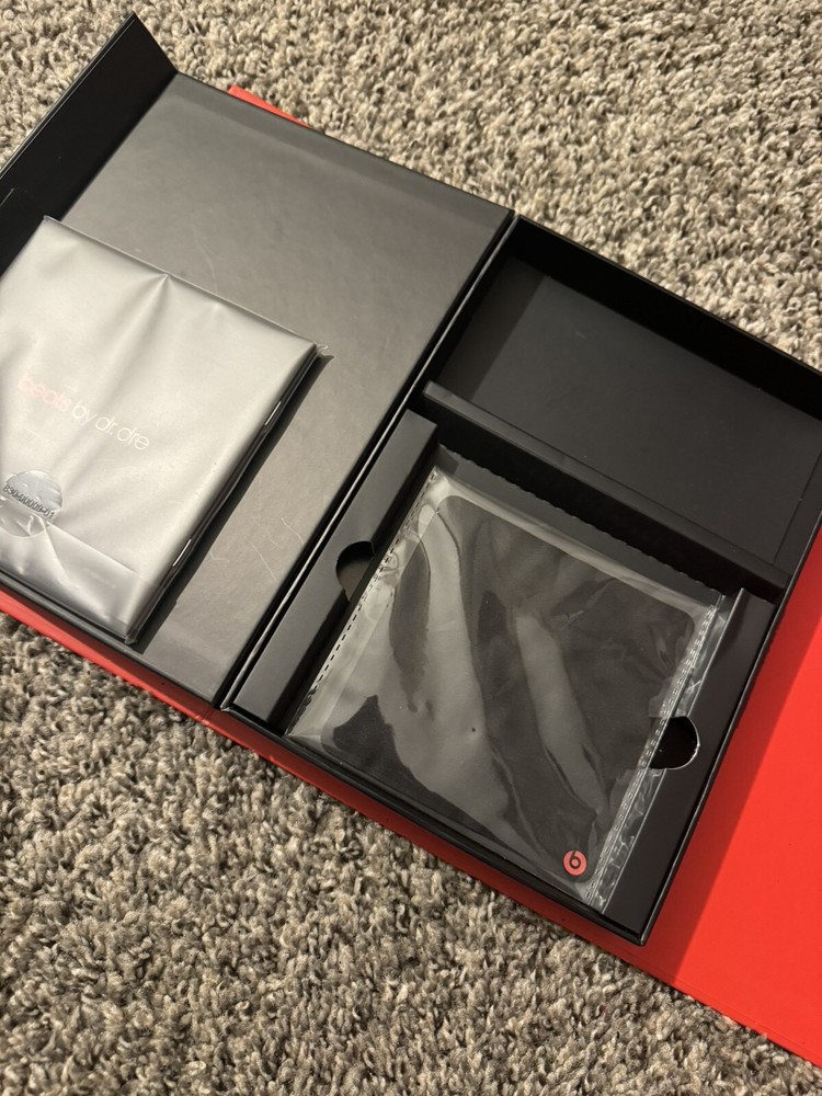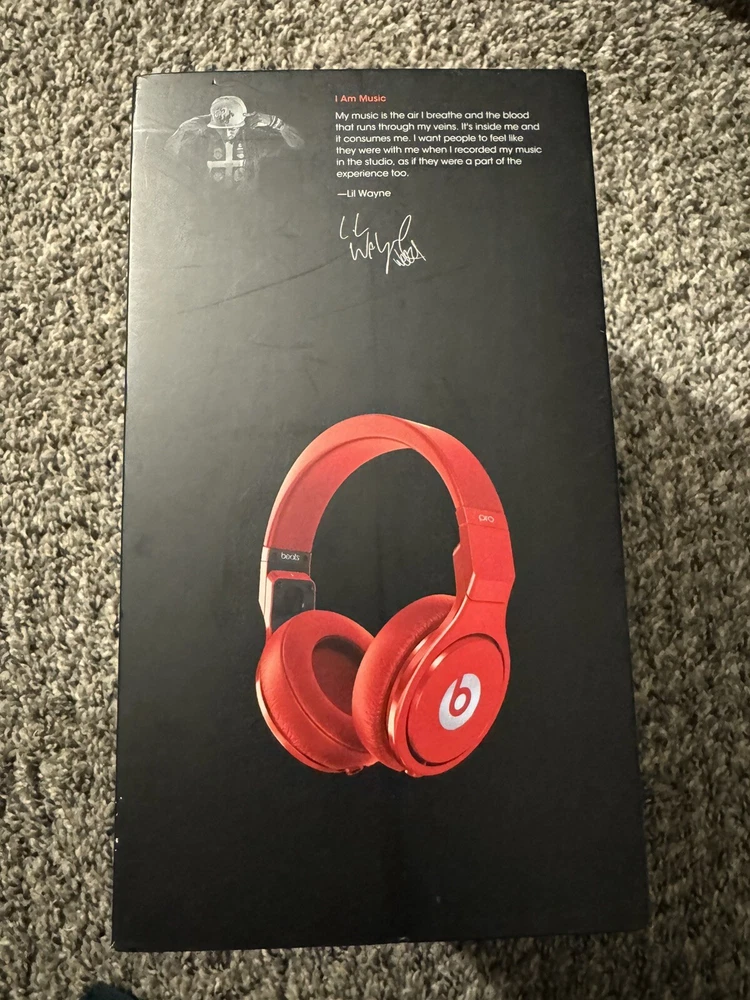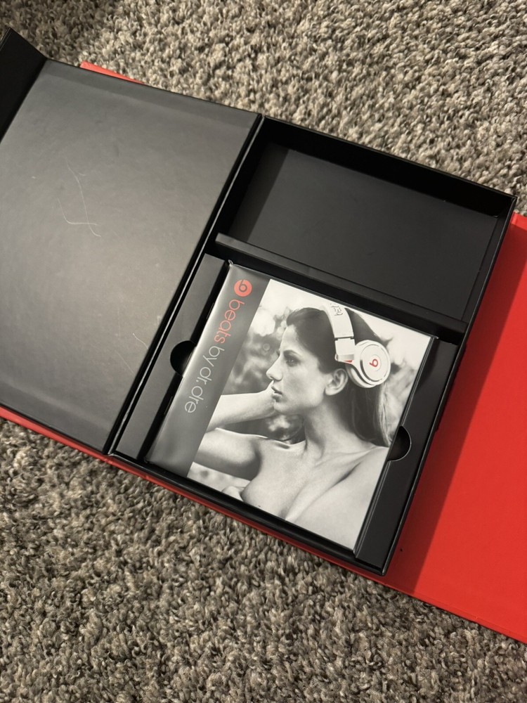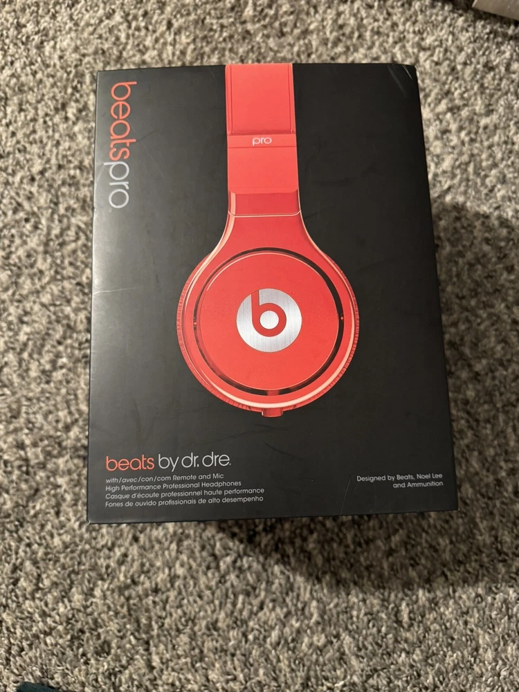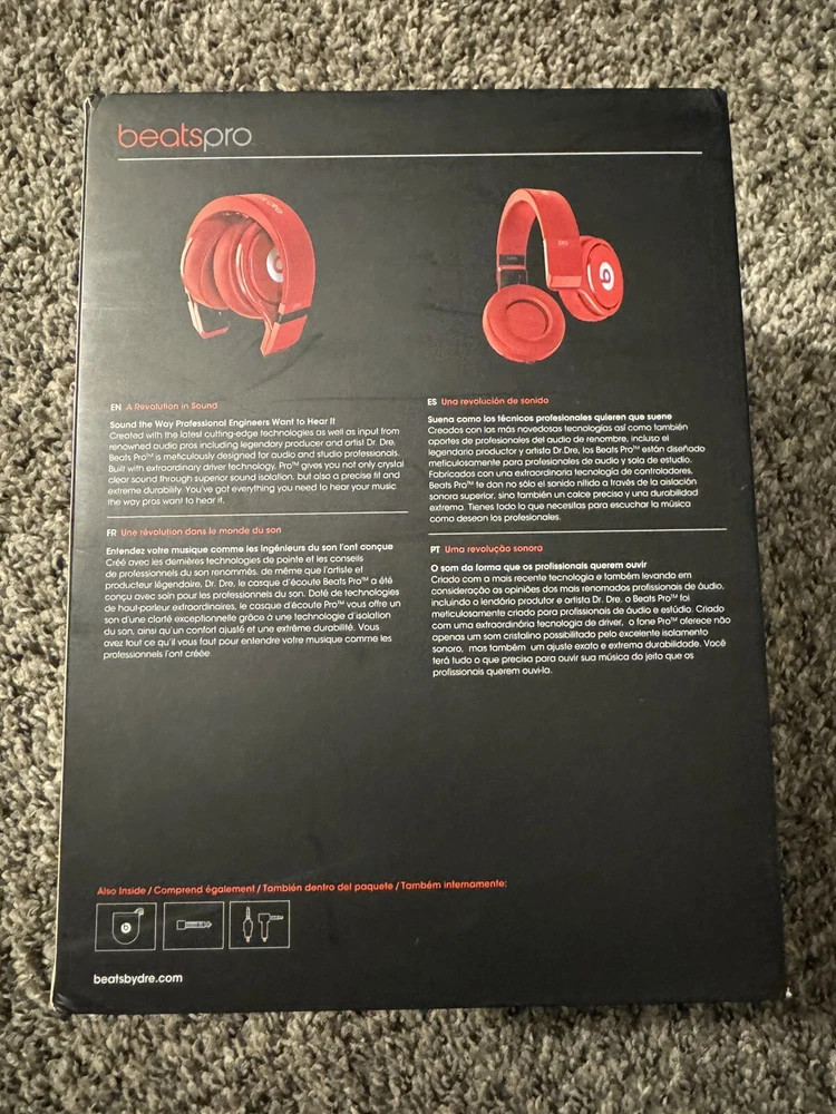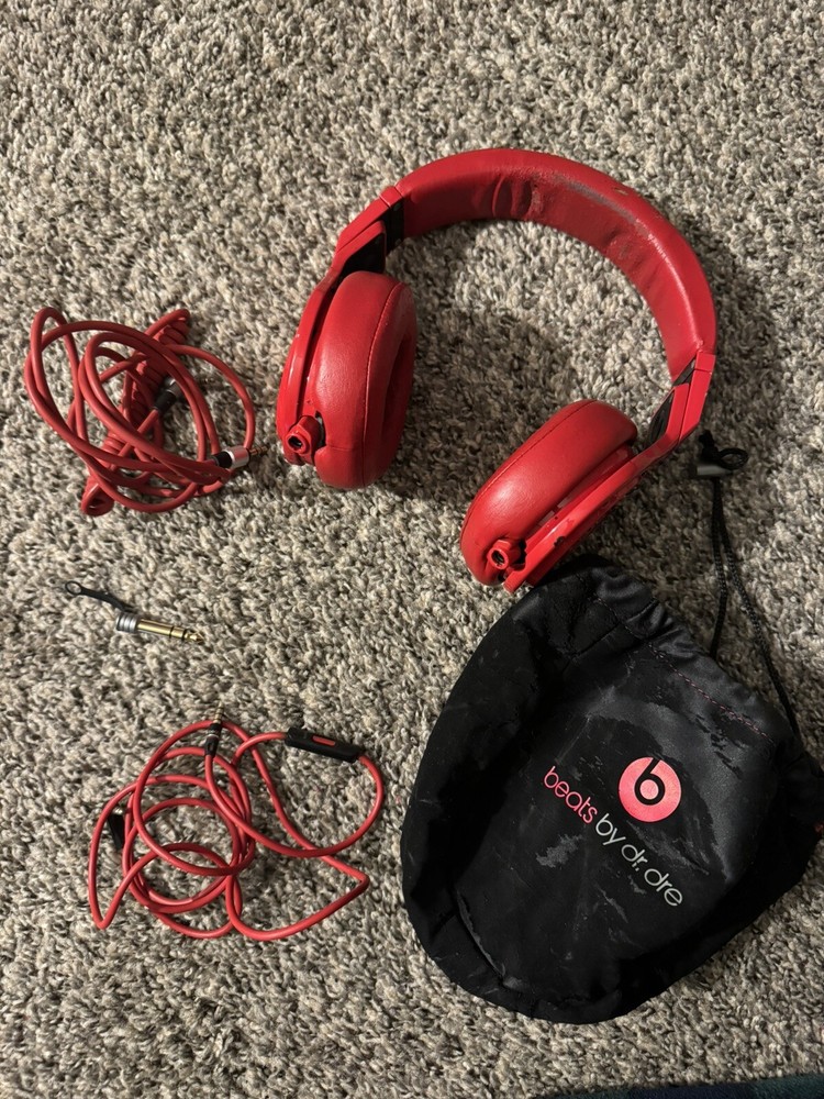 Used condition works fine. Has leather peeling in head band and black dust bag. Several dings on red paint. Comes with all original packaging and 2 cords with an adaptor piece for amp plug in