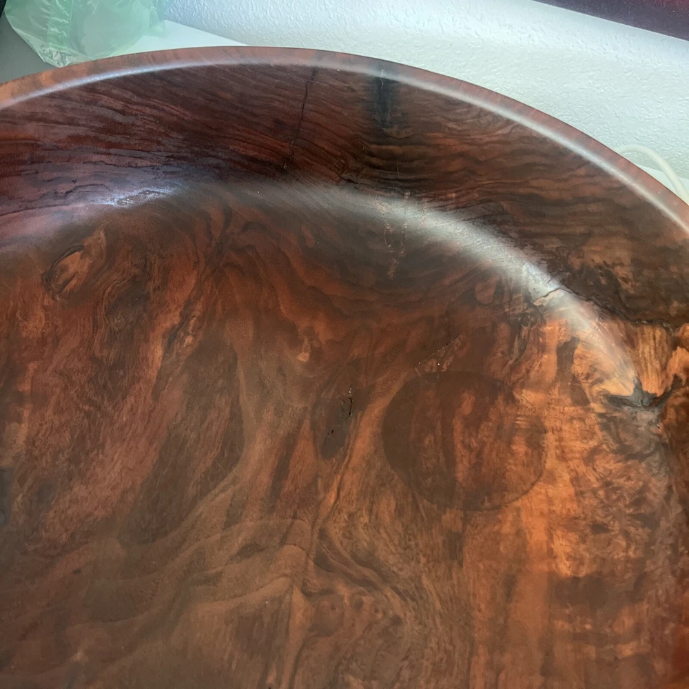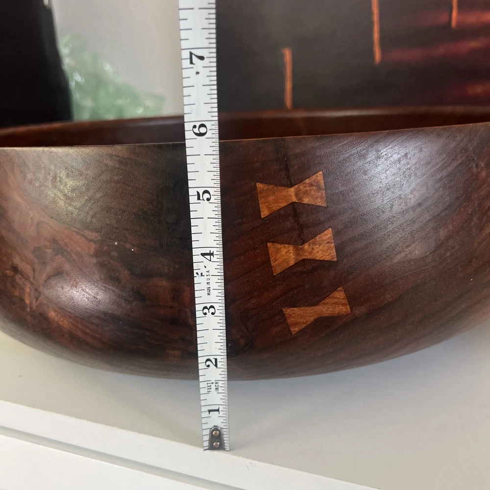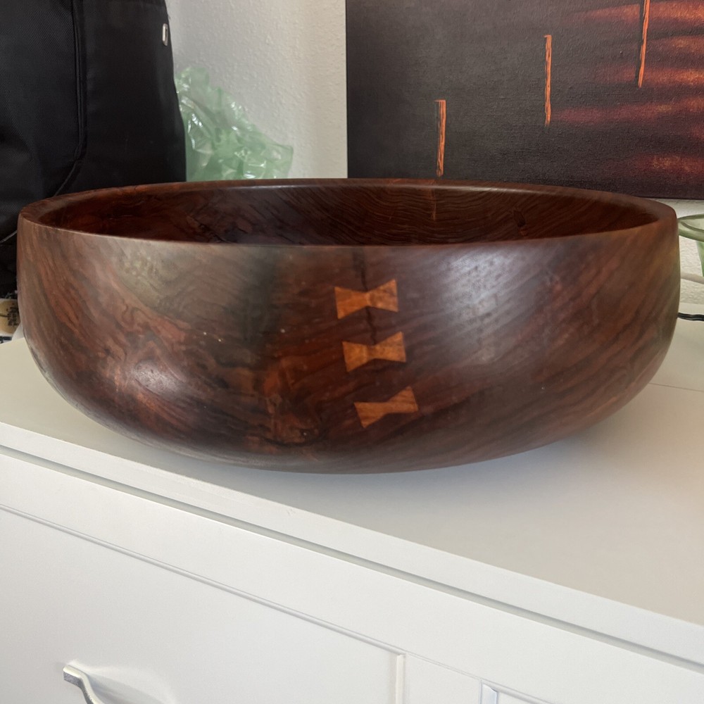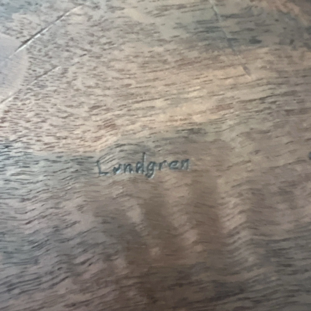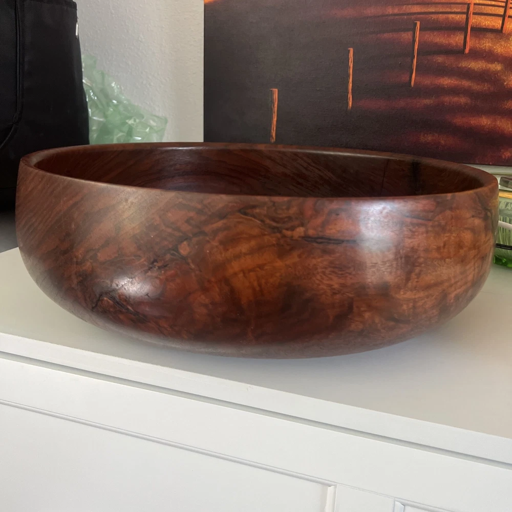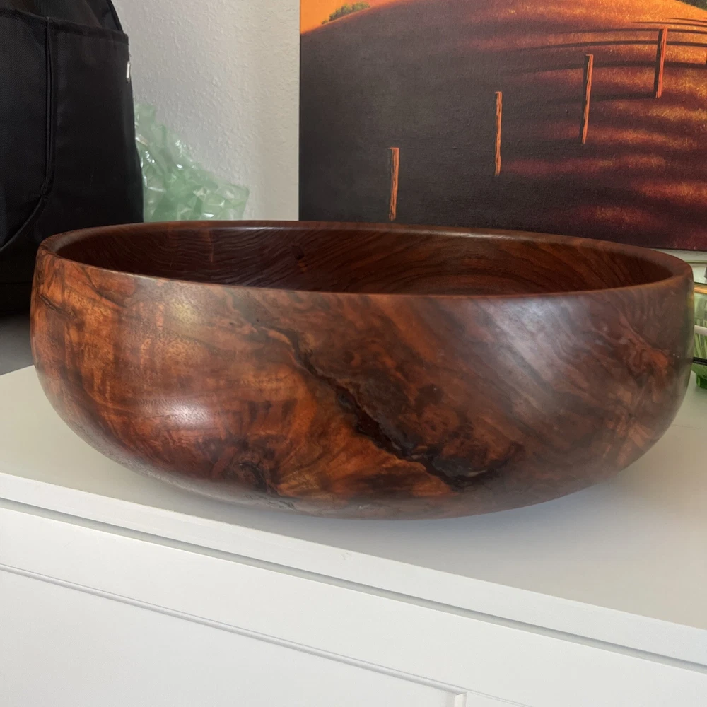 Handcrafting wooden bowls, urns, vases and more for over 26 years, Barry Lundgren’s woodturning is true art. The pieces are as diverse as the wood he works with, each unique in grain pattern, color, sheen and presentation. Lundgren has pieces in the VAULT GALLER and POP CULTURE ART GALLERY Inside of bowl does have a Water ring stain. There are few marks and scratches. See pictures.
