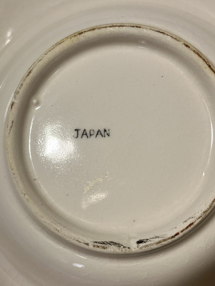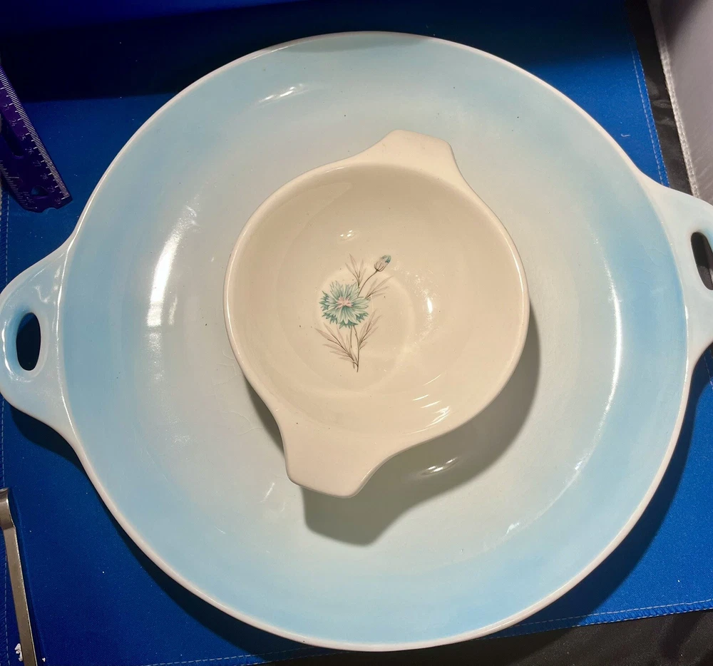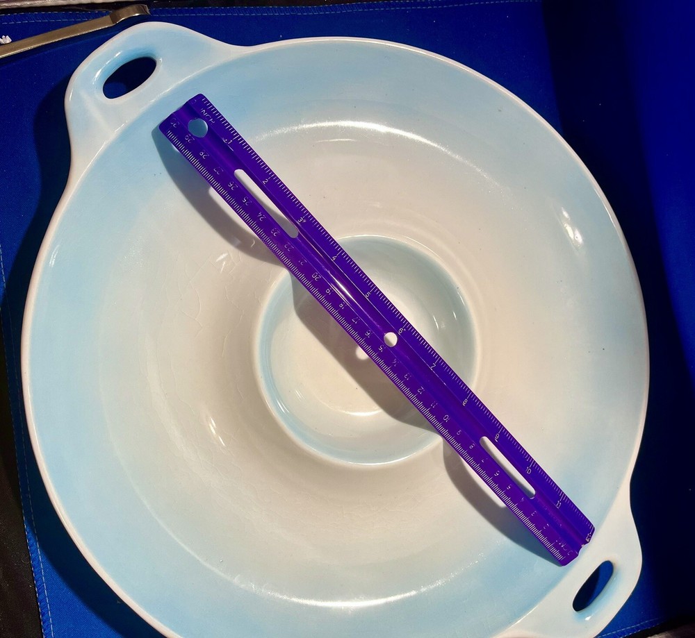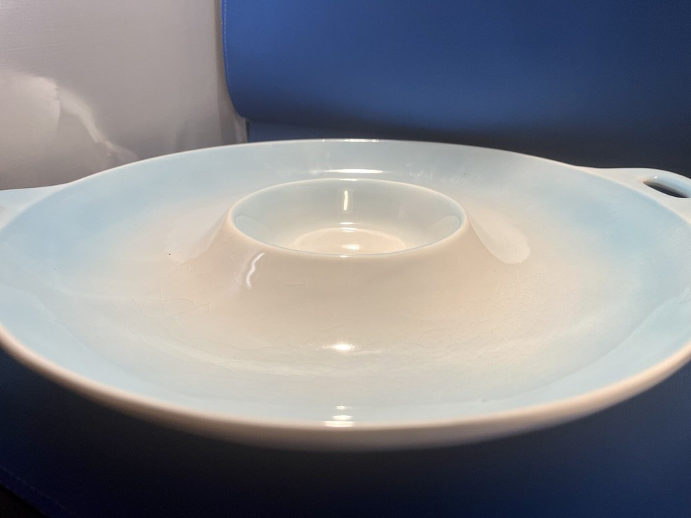 This Beautiful Pale Blue Ombré Vintage Mid-Century Modern Ceramic Chip and Dip Plate from Japan is a stunning piece of decorative server ware. With a glossy finish, this large round single piece platter features a unique all-over Ombré pattern in ivory and blue colors. (The last photo shows the china set “Boutonniere Ever Yours” that is was purchased to be used with and the blues are a perfect match! The bowl is not included, just used for demonstration purposes.) The vintage design and Mid-Century Modern style make it a charming addition to any home decor, with its artistic glaze fade style and printed Japan back stamp adding to its authentic appeal. It’s large size is sure to be useful when serving and delighting guests!!