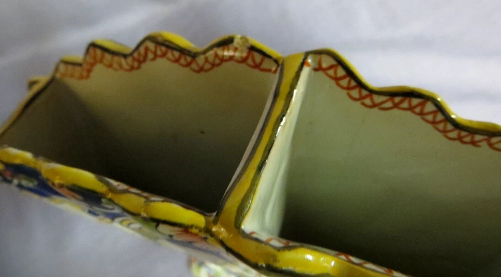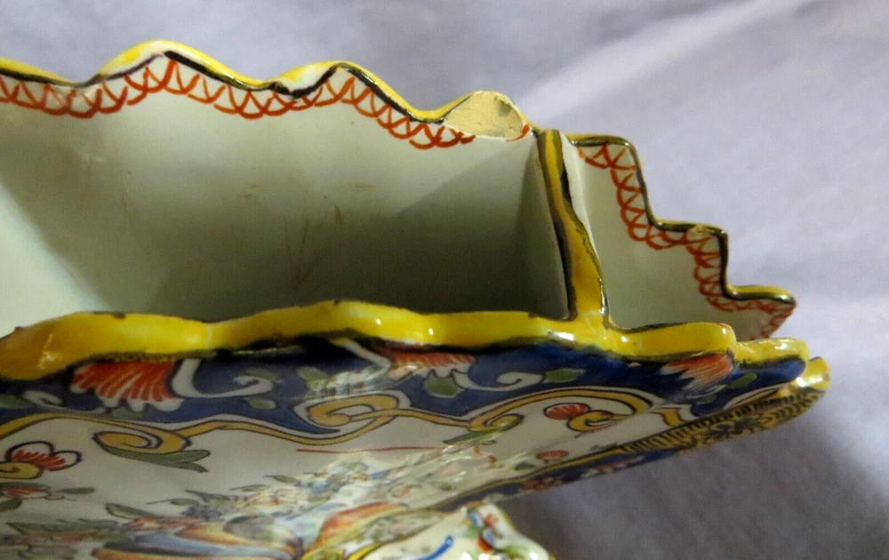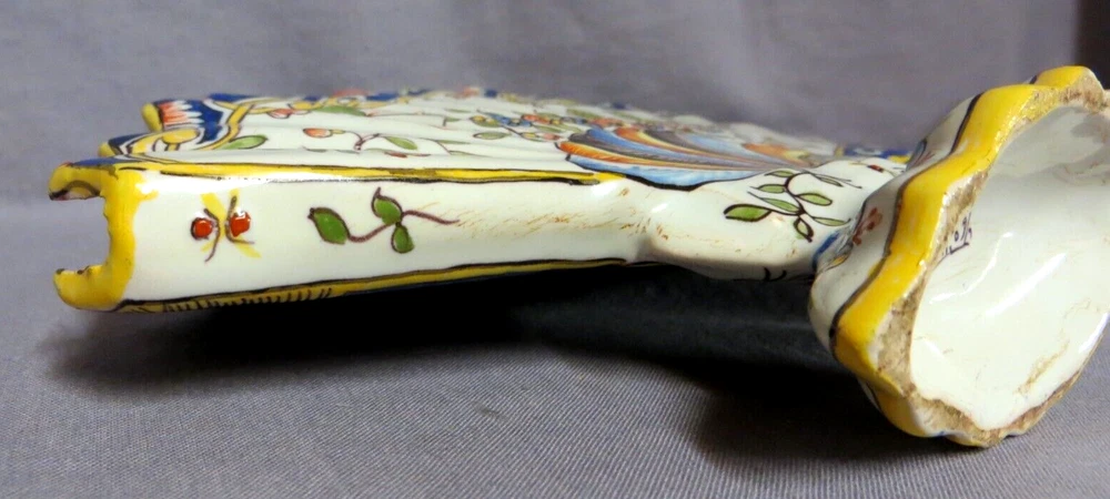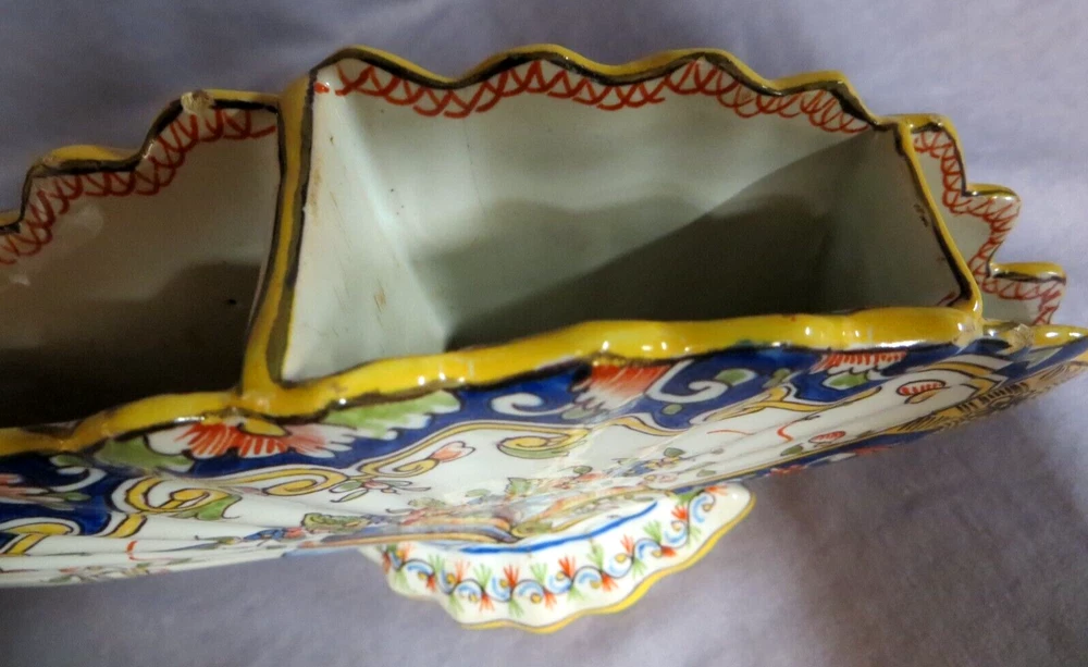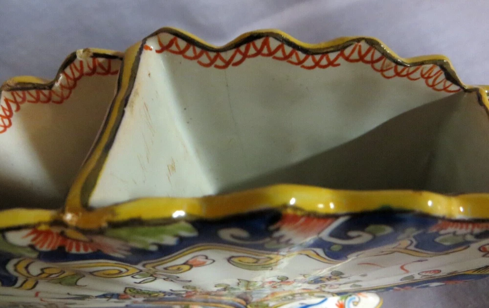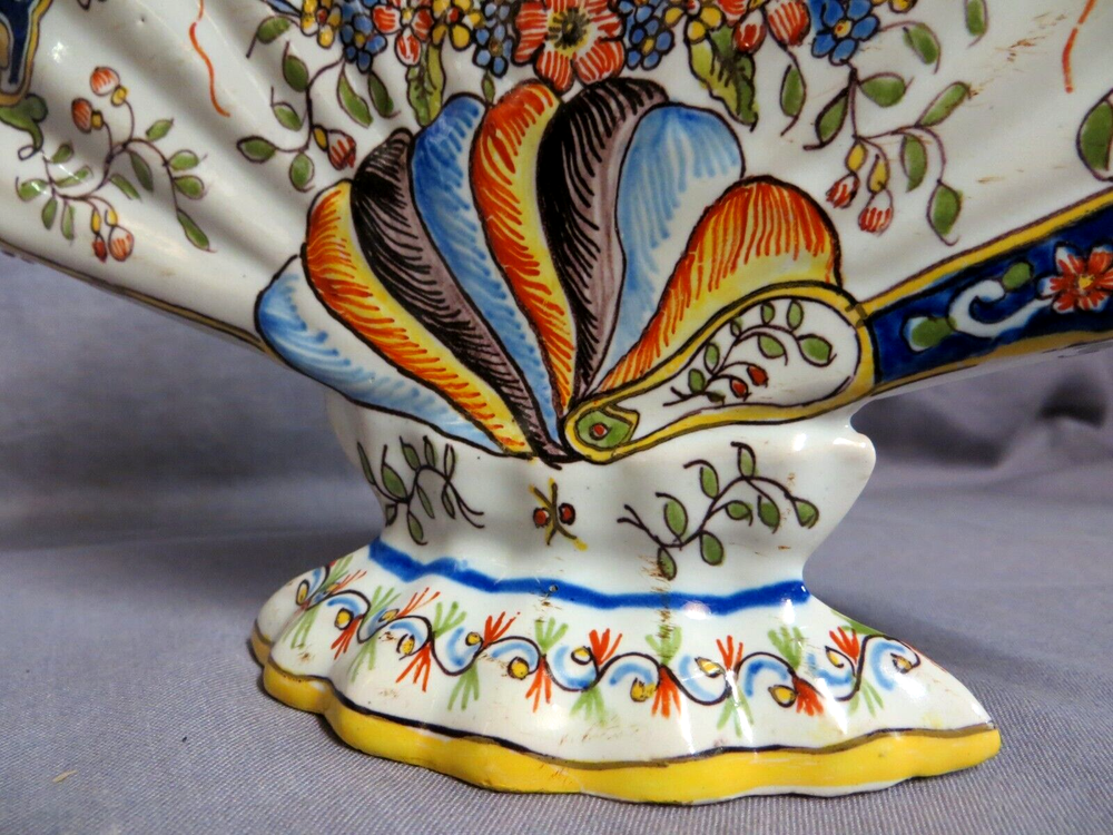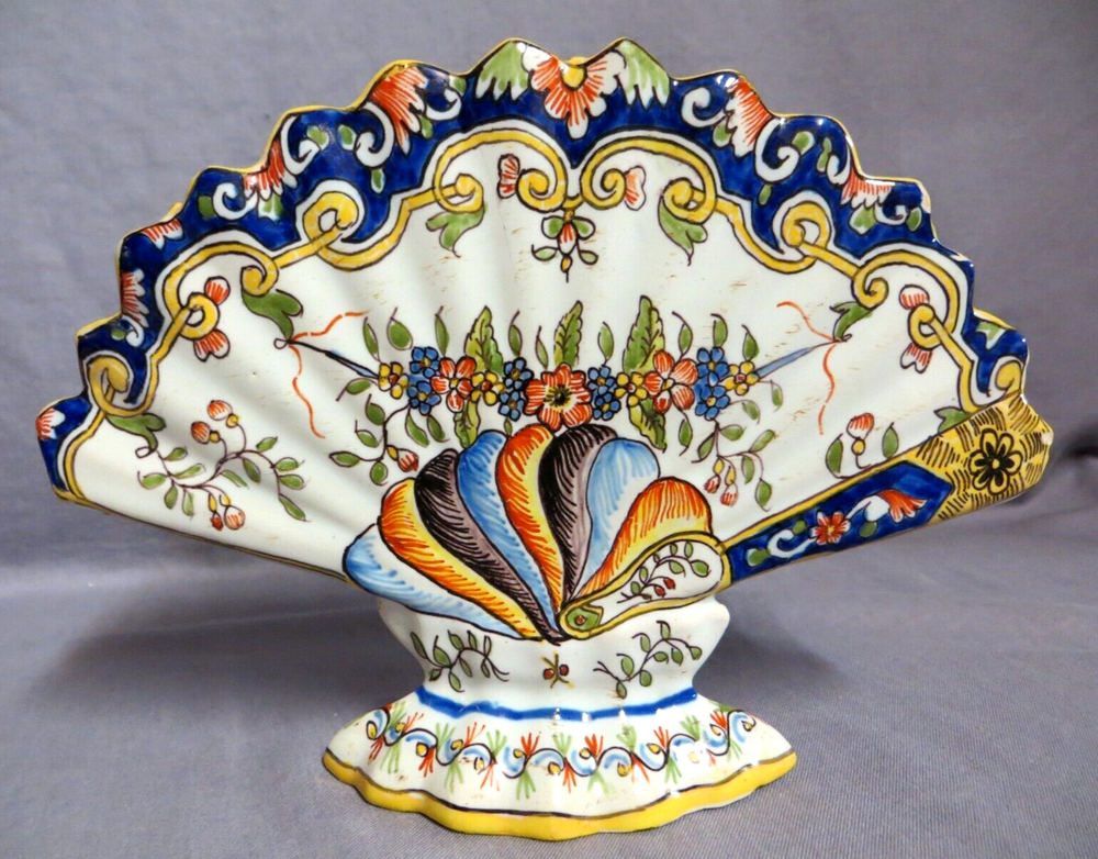 This is a lovely antique French faience polychrome fan-shaped vase decorated with wildflowers, fans and scrolls. It is decorated in the characteristic style of the Desvres decorators (led by the various generations of the Fourmaintraux family). It has a typical Desvres palette of dark blue, pale blue, yellow, green, red, aubergine and brownish black. The vase is divided into two large compartments and two smaller flanking compartments, presumably to strengthen the earthenware construction. It is a good size - about 20.9 cm in width, about 14.7 cm high and about 4.5 cm in depth. There is a monogram on the inside of the base, which represents the decorator. I read it as an italic "FF", together with a small decorator’s mark and the model number 69/7. The FF mark stands for Fourmaintraux Freres, a company which was operated for a very short period (1879-1887) by the brothers Jules and Émile Fourmaintraux. This lovely piece is in very good condition for its age. There are a few small chips on the top rim, some very minor glaze losses on the footrim. There is also a very minor hairline from the top rim, which is quite tight. I have tried to show these clearly in the photos. There are no significant scratches or restoration. I have many other antique and vintage pieces for sale. Why don't you check them out? Hit the button at the top right for “Seller's other items”.