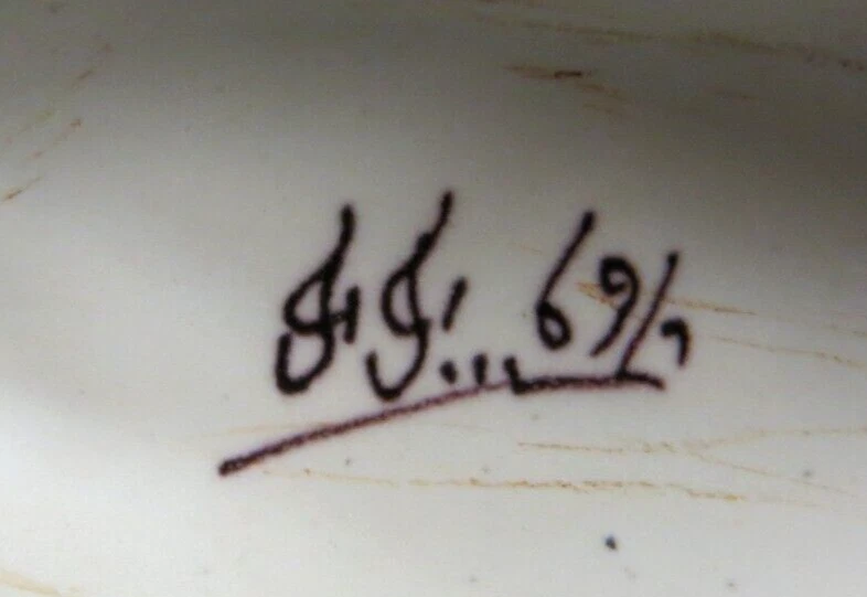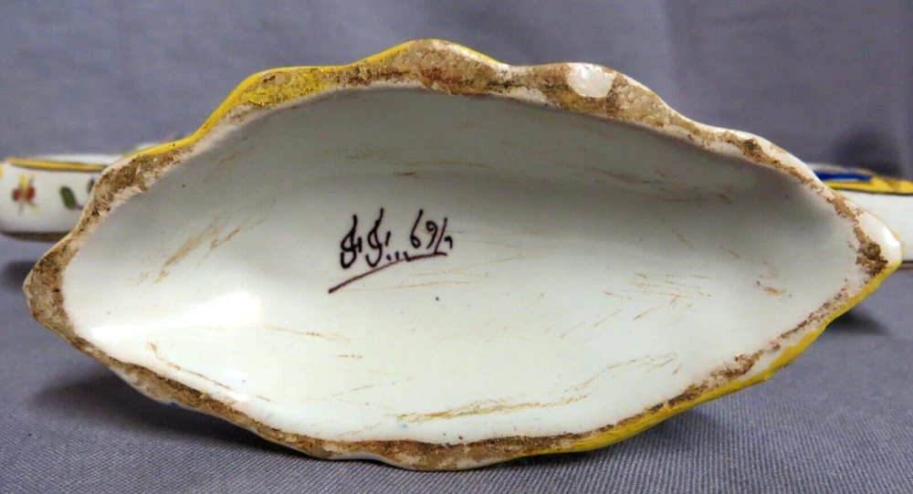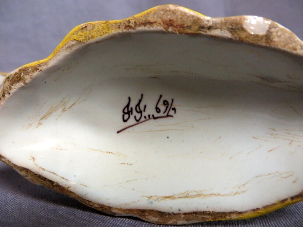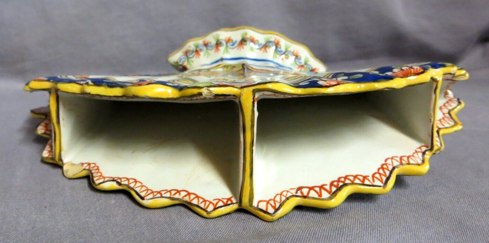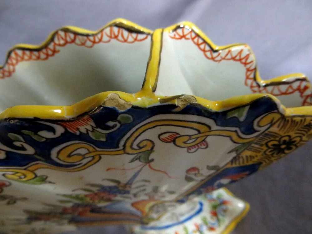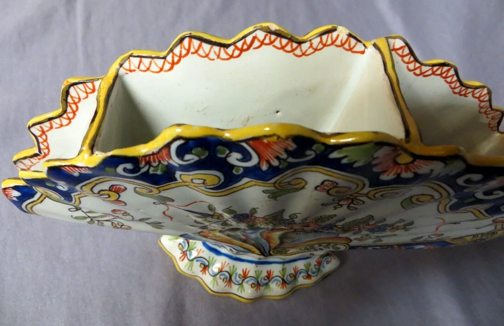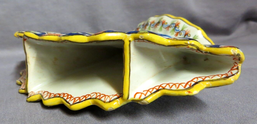 This is a lovely antique French faience polychrome fan-shaped vase decorated with wildflowers, fans and scrolls. It is decorated in the characteristic style of the Desvres decorators (led by the various generations of the Fourmaintraux family). It has a typical Desvres palette of dark blue, pale blue, yellow, green, red, aubergine and brownish black. The vase is divided into two large compartments and two smaller flanking compartments, presumably to strengthen the earthenware construction. It is a good size - about 20.9 cm in width, about 14.7 cm high and about 4.5 cm in depth. There is a monogram on the inside of the base, which represents the decorator. I read it as an italic "FF", together with a small decorator’s mark and the model number 69/7. The FF mark stands for Fourmaintraux Freres, a company which was operated for a very short period (1879-1887) by the brothers Jules and Émile Fourmaintraux. This lovely piece is in very good condition for its age. There are a few small chips on the top rim, some very minor glaze losses on the footrim. There is also a very minor hairline from the top rim, which is quite tight. I have tried to show these clearly in the photos. There are no significant scratches or restoration. I have many other antique and vintage pieces for sale. Why don't you check them out? Hit the button at the top right for “Seller's other items”.