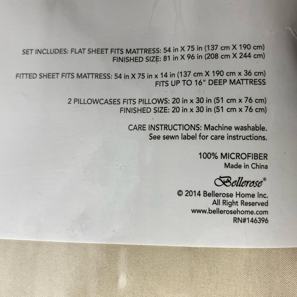 SET INCLUDES: FLAT SHEET FITS MATTRESS: 54 in X 75 in (137 cm X 190 cm) FINISHED SIZE: 81 in X 96 in (208 cm X 244 cm) FITTED SHEET FITS MATTRESS: 54 in X 75 in x 14 in (137 cm X 190 cm x 36 cm) FITS UP TO 16" DEEP MATTRESS 2 PILLOWCASES FITS PILLOWS: 20 in x 30 in (51 cm x 76 cm) FINISHED SIZE: 20 in x 30 in (51 cm x 76 cm) This luxurious 4-piece sheet set in cream color from Bellerose is a must-have for any contemporary style bedroom. Crafted from 100% microfiber material, it promises ultra-softness, breathability, and wrinkle-resistance, making it ideal for a comfortable and cozy sleep experience. The set includes a full-size fitted sheet, a flat sheet, and two pillowcases, all designed in a rectangular shape to fit your bed perfectly. With a solid color pattern and easy-care features like machine-washability, this sheet set from the Ultra Home Collection is perfect for those who prioritize comfort and convenience. Make your bed a comfortable haven with this sheet set without worrying about the condition