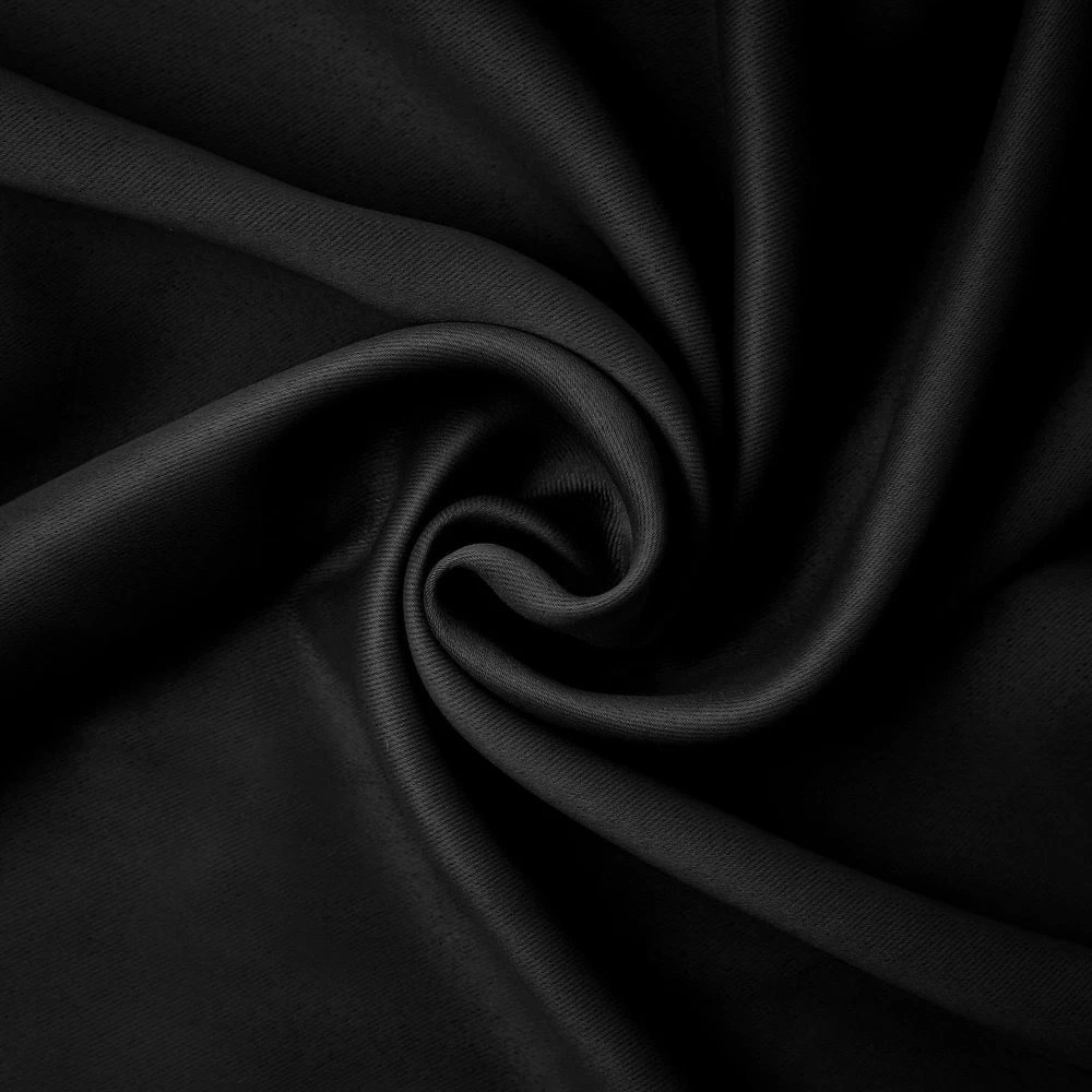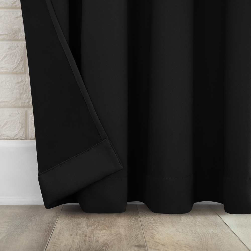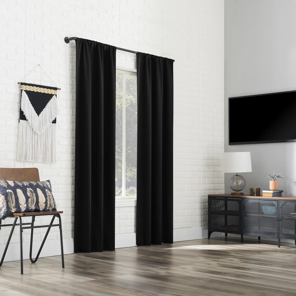 Bergen Theater Extreme 100% Blackout Rod Pocket Curtain Panels provide the ultimate in light blocking technology to keep out even the harshest of light while bringing an elegant urban sophistication to any room of your home. Extreme Blackout technology is laboratory tested to block out 100% of light, reduce outside noise by up to 45%, and decrease energy lost through your windows by up to 50%. Comfort is optimized with thermal properties that help keep summer heat and winter chill out of your home. Built-in rod pocket design allows for easy slide-through installation on curtain rods up to 1.5" in diameter. Hang in your entertainment room to eliminate screen glare and reduce distracting outside noise, or in your bedroom for enhanced privacy and a sounder, more uninterrupted sleep. Sold as individual panels measuring 40" width by 84" length in color black. Measure carefully before selecting your desired size and quantity. Rod not included. Machine wash cold on gentle cycle. Use non-chlorine bleach when needed. Tumble dry on low heat. Extreme Blackout technology blocks out 100% of outside light Energy Efficient design reduces energy lost through your windows by up to 50% Thermal properties help keep summer heat and winter chill out of your home Noise reduction by up to 45% helps you get a sounder, more uninterrupted sleep Built-in rod pocket fits curtain rods up to 1.5" in diameter Panels sold individually. Measure carefully prior to purchase (Image features 2 panels)