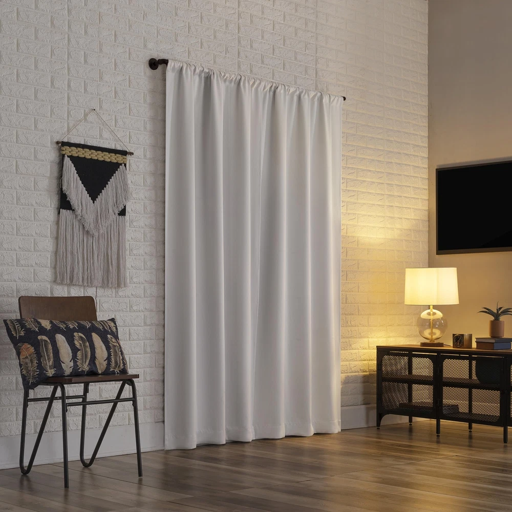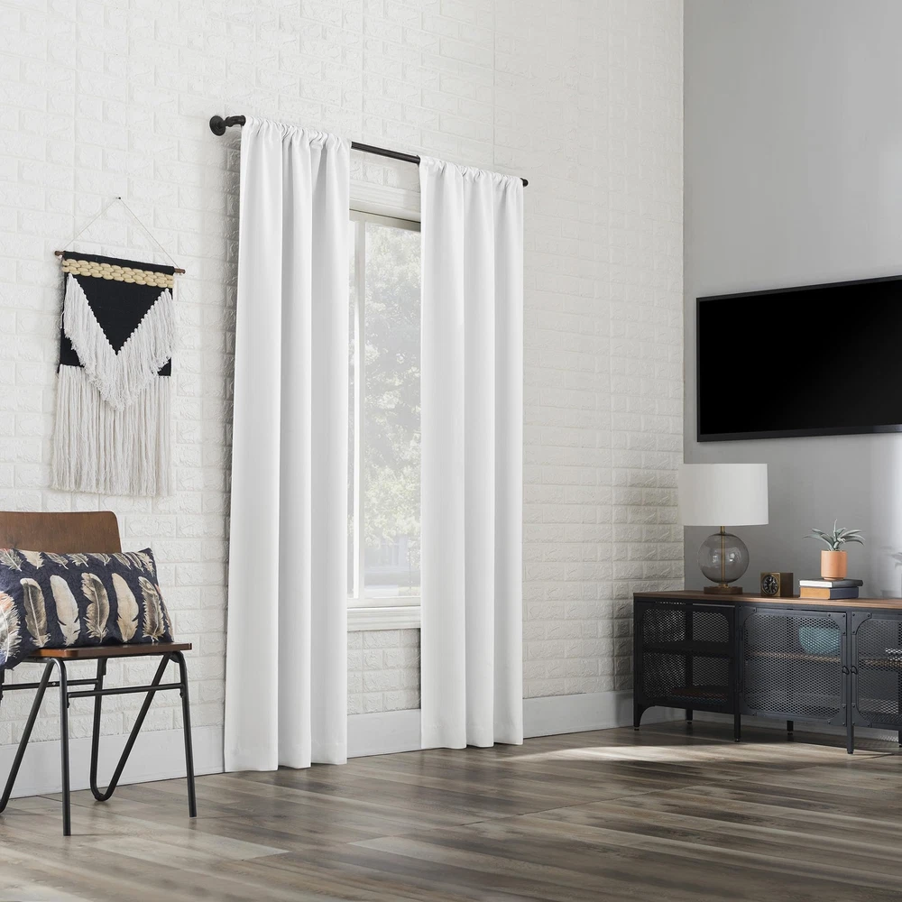 Bergen Theater Extreme 100% Blackout Rod Pocket Curtain Panels provide the ultimate in light blocking technology to keep out even the harshest of light while bringing an elegant urban sophistication to any room of your home. Extreme Blackout technology is laboratory tested to block out 100% of light, reduce outside noise by up to 45%, and decrease energy lost through your windows by up to 50%. Comfort is optimized with thermal properties that help keep summer heat and winter chill out of your home. Built-in rod pocket design allows for easy slide-through installation on curtain rods up to 1.5" in diameter. Hang in your entertainment room to eliminate screen glare and reduce distracting outside noise, or in your bedroom for enhanced privacy and a sounder, more uninterrupted sleep. Sold as individual panels measuring 40" width by 84" length in color white. Measure carefully before selecting your desired size and quantity. Rod not included. Machine wash cold on gentle cycle. Use non-chlorine bleach when needed. Tumble dry on low heat. Extreme Blackout technology blocks out 100% of outside light Energy Efficient design reduces energy lost through your windows by up to 50% Thermal properties help keep summer heat and winter chill out of your home Noise reduction by up to 45% helps you get a sounder, more uninterrupted sleep Built-in rod pocket fits curtain rods up to 1.5" in diameter Panels sold individually. Measure carefully prior to purchase (Image features 2 panels)