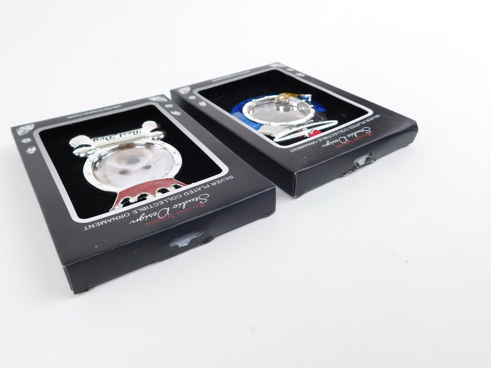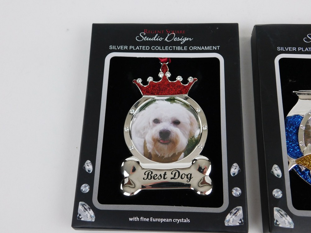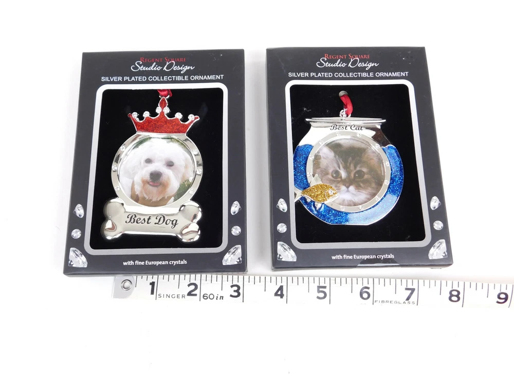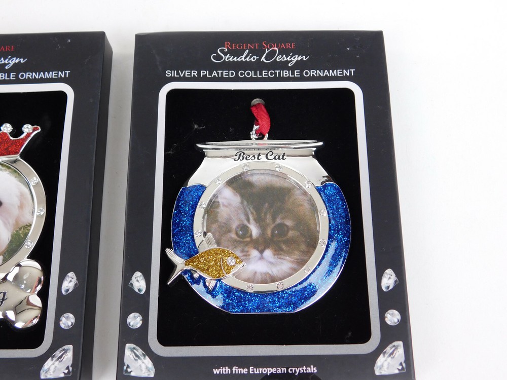 Best Dog and Cat Ornaments Regent Square Studio Design Silver Plated CrystalsBoth Ornaments Silver Plated Embellished with European CrystalsBest cat is shaped like a fishbowl embellished with blue and gold crystalsBlue crystal represents water and gold crystals shaped like fishBest Dog embellished with red and clear crystalsDog has a red crystal crown accented with clear crystalsBottom of ornament is shaped as a bone that says Best Dog#1961Please Note:International BuyersImport duties, taxes, and charges are not included in the item price or shipping cost. These charges are the buyer's responsibility.Please check with your country's customs office to determine what these additional costs will be prior tobidding or buying