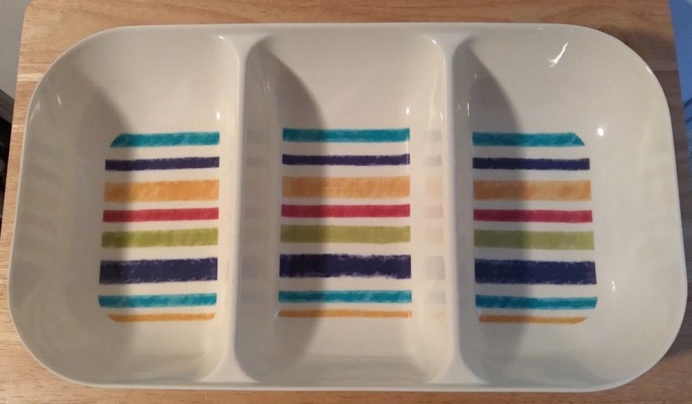 Better Homes & Gardens® Divided (3) Melamine Serving Tray Measures: 16" Long, 9" Wide and 2.5" Deep Pattern = Multicolored Stripes New Please use the shipping calculator to determine shipping to your area. Check out my other auctions for more great items! I will happily COMBINE shipping!! Thanks for looking!
