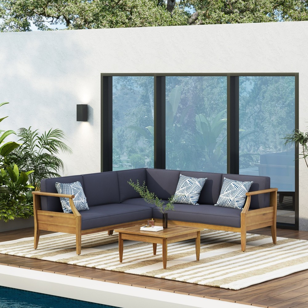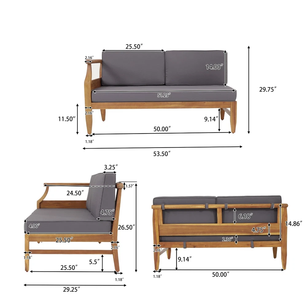 Add a touch of elegance to your outdoor space and entertain your guests with ease. Our five-seater sectional chat set features a charming retro design, including lovely recessed arms and a slat panel motif for a breezy look. Finished with rich acacia wood frames and water-resistant cushions, this set offers a sturdy place for you and your guests to rest comfortably while conversing with a tray of chilled drinks. Your backyard will thank you for making the most of its space with this conversation set. MID-CENTURY MODERN DESIGN: Blending together recessed armrests with a stunning wood frame, our five-seater set offers a mid-century look to your lounge space. With its clean lines and understated look, this set uses new materials to reimagine a traditional design. ACACIA WOOD: Made with acacia wood that brings a sleek and exotic look to your space, this durable hardwood naturally withstands outdoor elements and will not darken over time. Acacia wood is perfect as a solid, heavy frame that resists wear and tear. SLAT DESIGN: This set features beautiful slat paneling, giving this piece a clean and classic look. This matches perfectly with its lovely recessed armrests, offering a wonderfully retro feel to your decor. WATER-RESISTANT CUSHIONS: Our cushions are covered with a non-porous material that makes cleaning any spill a breeze. Please note that these cushions are water-resistant and not waterproof. Please do not submerge in water. DIMENSIONS: Choose an accessory that is the perfect size for you and your furniture. The overall sectional dimensions are 82.75” W x 82.75” D x 26.50” H and the coffee table is 27.50” W x 27.50” D x 14.00” H. You will love how much your space can transform with the simple addition of this charming sectional chat set. Includes: One (1) Left Arm Bench, One (1) Right Arm Bench, One (1) Corner Seat, One (1) Coffee Table Frame Material: Acacia Wood Cushion Material: Water Resistant Fabric Frame Finish: Teak Cushion Color: Dark Gray Assembly Required Left and Right Bench Dimensions: 29.25 inches deep x 53.50 inches wide x 26.50 inches high Bench Seat Dimensions: 25.50 inches deep x 51.25 inches wide x 11.50 inches high Arm Height: 26.50 inches Weight Capacity: 800 lbs Corner Chair Dimensions: 29.25 inches deep x 29.25 inches wide x 26.50 inches high Corner Chair Seat Dimensions: 25.50 inches deep x 25.50 inches wide x 11.50 inches high Weight Capacity: 400 lbs Seat Cushion Thickness: 4.00 inches Table Dimensions: 27.50 inches deep x 27.50 inches wide x 14.00 inches high Weight Capacity: 200 bs