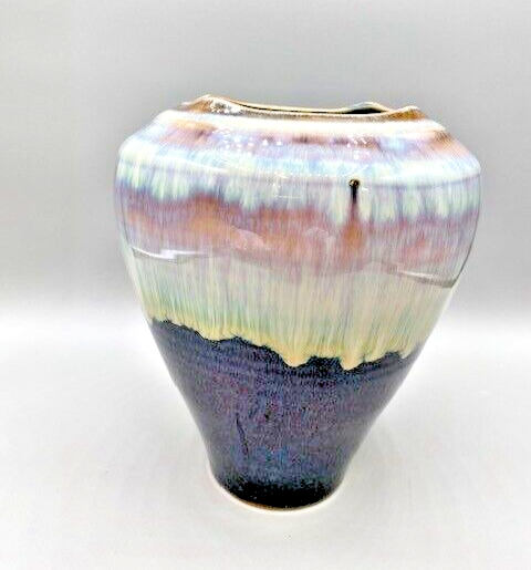 Bill Campbell Studio Art Pottery Vase Blue Purple Square Mouth 7" H Drip Glaze Please see photos for details