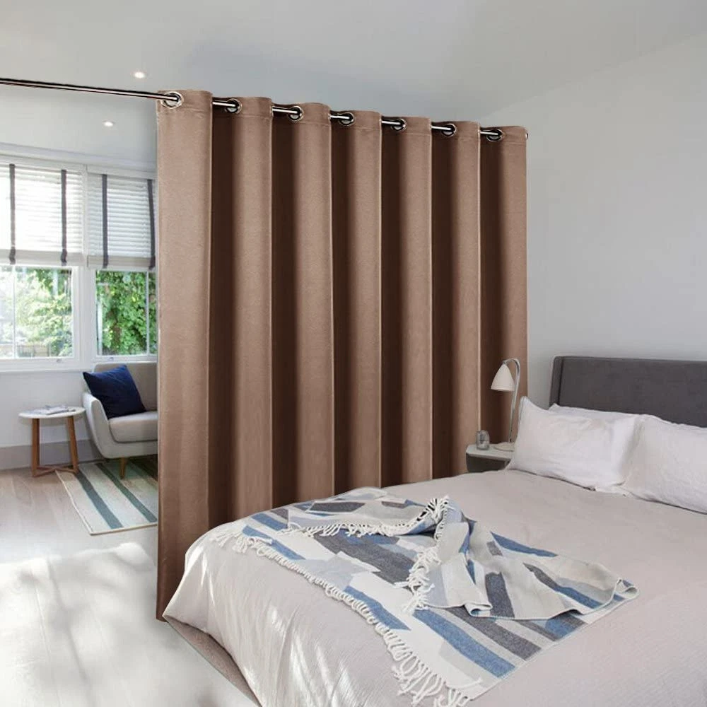 AMAZING FABRIC: The blackout curtain's fabric is super soft and heavy innovative triple-weave polyester fabric. The same material back as of front makes it appear more elegant. The 14 sliver grommets top (inner diameter is 1.6-inch) adds a modern touch and easy hanging. MULTIPLE FUNCTIONAL: These extra wide curtains are wide enough to cover the sliding door perfectly. Besides, the curtain panel helps your patio door to block out most of the light, high performance on thermal insulated, noise-reducing, and privacy-protecting. ENERGY SMART: Triple weave blackout fabric balances room temperature by insulating against summer heat and winter chill, reducing air conditioning costs. Protect your furniture, floors, and artwork from the ravages of the sun, the Patio Door Drapes will pay for themselves off over time. WISE COMPATIBLE: Thread trimmed and wrinkle-free, all sets for you to put them up right away. Suitable perfectly for sliding doors, patio doors, and any large window. These wide curtains can be hung separately, or combine with sheer curtains. EASY CARE: Good-quality finishing will withstand years of use. Machine washable and Wash the water temperature below 86F. Mild detergent no bleaching. Low-temperature ironing. Don’t use sharp things scratching curtains.