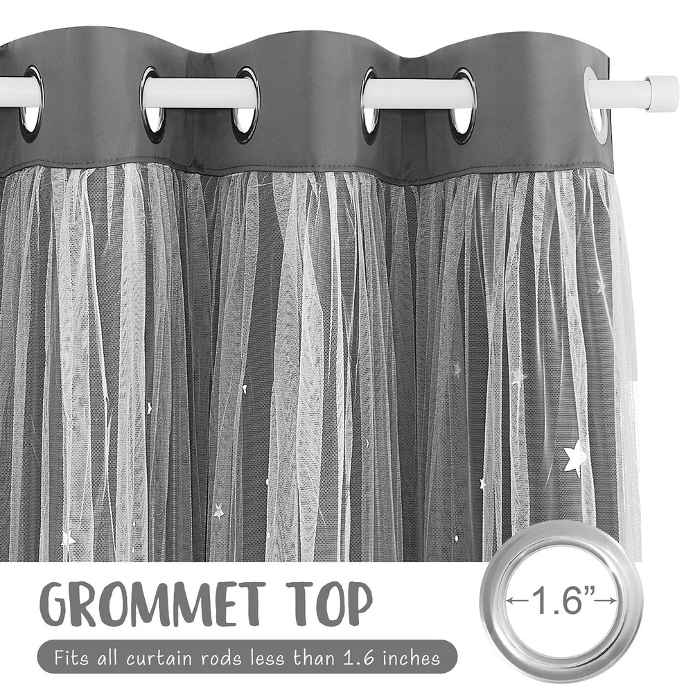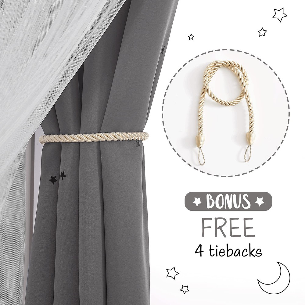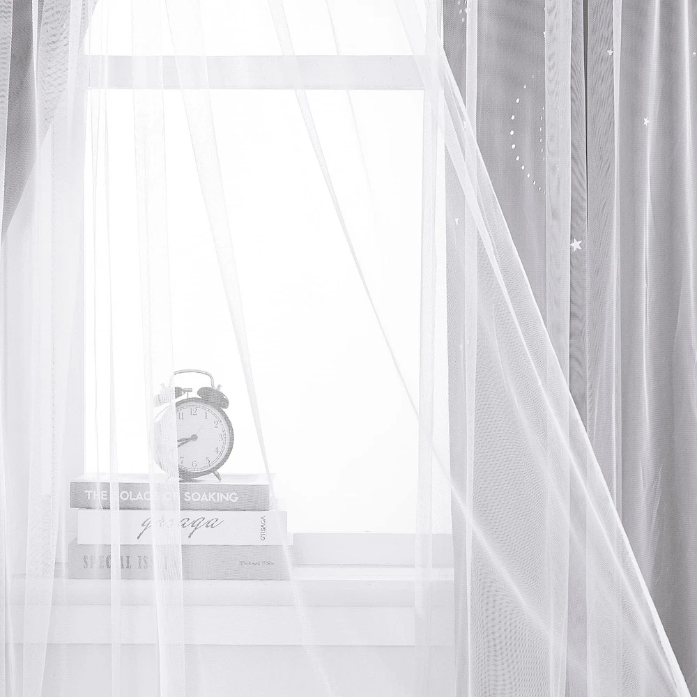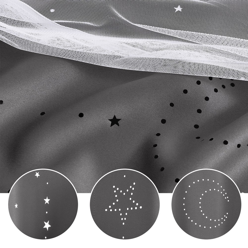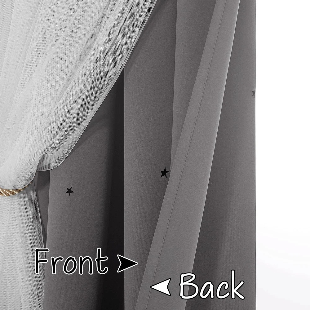 Star Cut-out Thermal Insulated Rainbow Curtains Blackout Function: Effectively blocks light to keep the room dark, perfect for naps and maintaining privacy. Thermal Insulation: Made from high-quality polyester to help maintain a comfortable room temperature. Star Cutout Design: Unique laser-cut stars create a mesmerizing starry sky effect when sunlight filters through. Easy Installation: Includes tiebacks and features grommets that fit standard curtain rods for quick and hassle-free setup. Dreamy Appearance: White sheer overlay with rainbow blackout curtains enhances room décor, adding a whimsical and elegant touch perfect for any rooms.