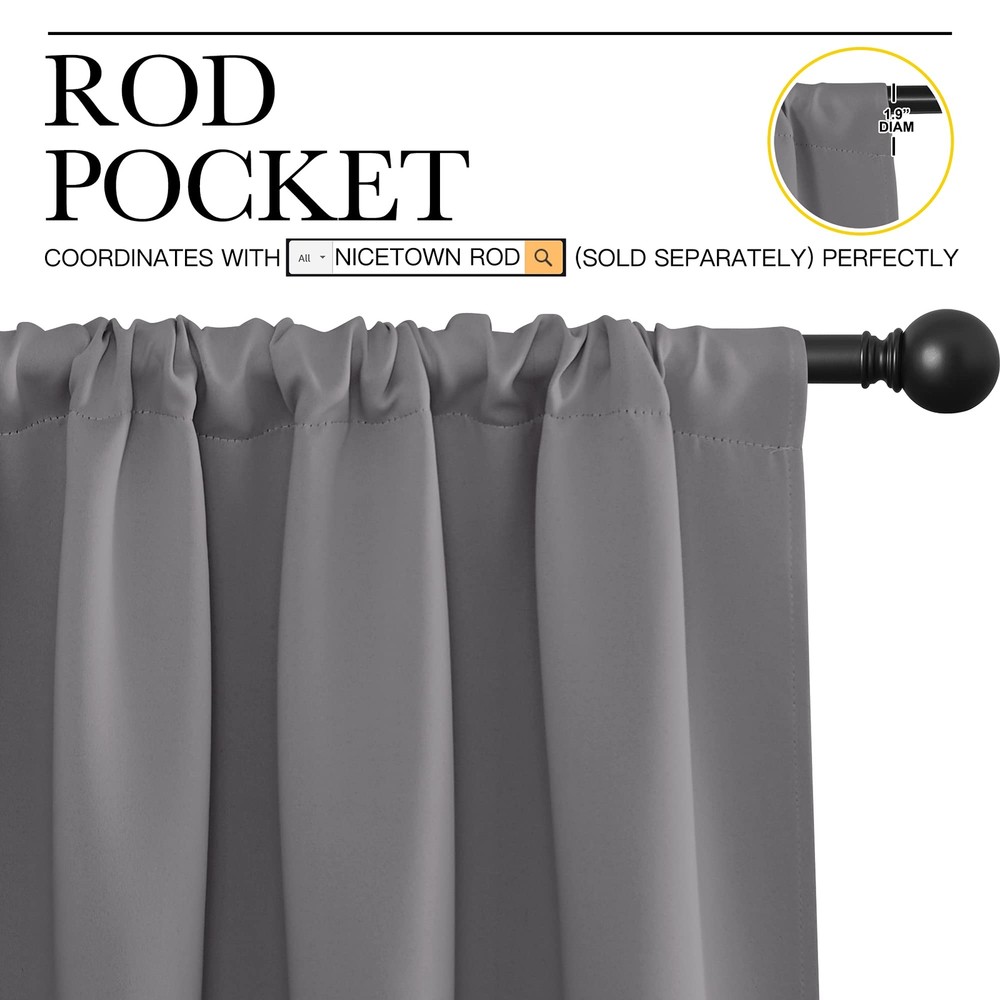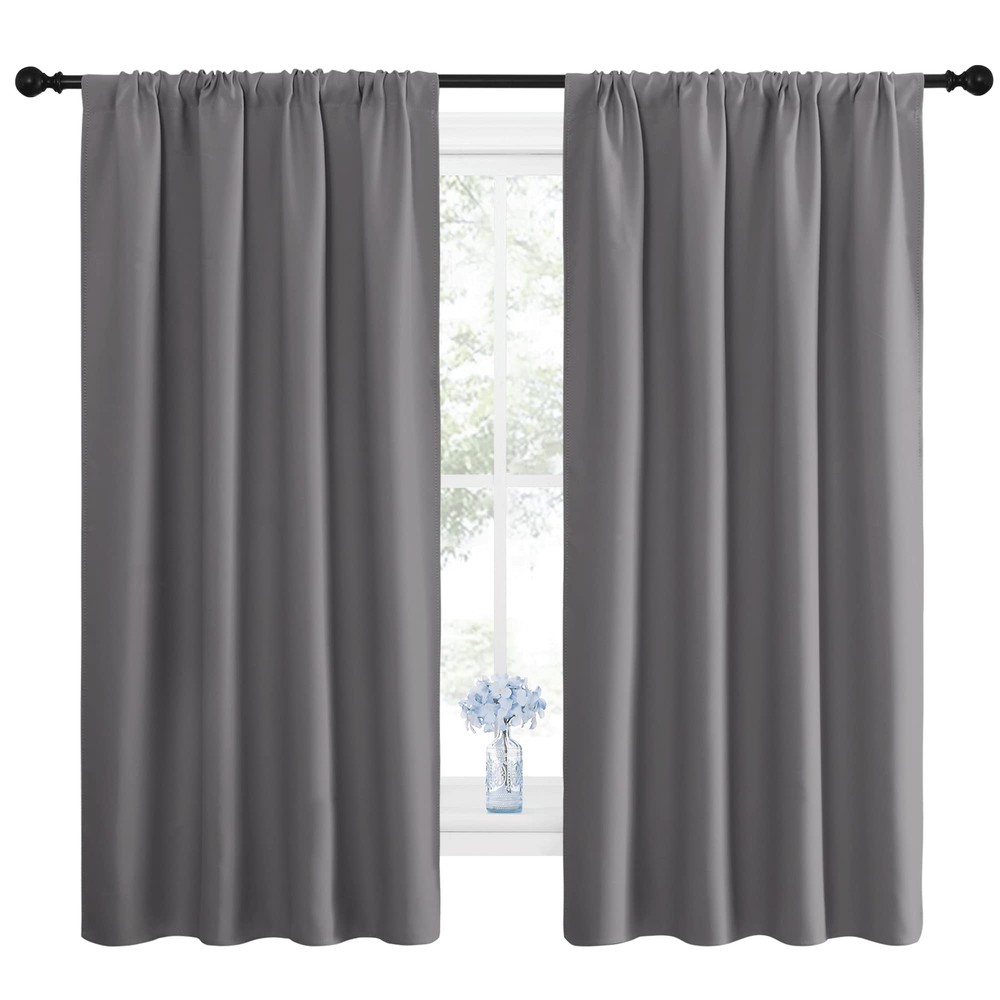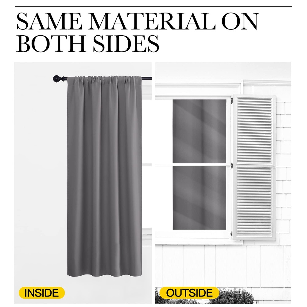 ELEGANT DESIGN: 2 panels per package. Each Blackout Curtain Panel measures 42 inches wide x 63 inches long. The drapery is constructed with rod pocket, fitting the curtain rod of your choice up to 2 inches in diameter, making the curtains easy to install and slide. LENGTH ADJUSTABLE: Don't worry if this blackout curtains are a few shorter than your windows. You can hang this curtain panels with rings and hooks. That could be adjustable for height max 3 inches. Hooks space distance around 4-6 inches. AMAZING MATERIAL: This unique, soft and heavy-duty blackout fabric is woven with three-layer construction. The middle layer of black yarns creates a curtain panel that is excellent for blocking out 85%-99% of light (Dark color works better on blocking light) while providing privacy. GOOD CHOICE: Perfect drapery option for anyone seeking to block daylight, take a nap, or keep sun glare off your TV. Besides, you can choose blackout valance and sheer curtains in the store to match. Such curtain sets provide a more permanent harmonious window dressing. EASY MAINTENANCE: Machine or hand washable. Mild detergent no bleaching. Low-temperature ironing. Measure your pole and window size before you choosing curtains.