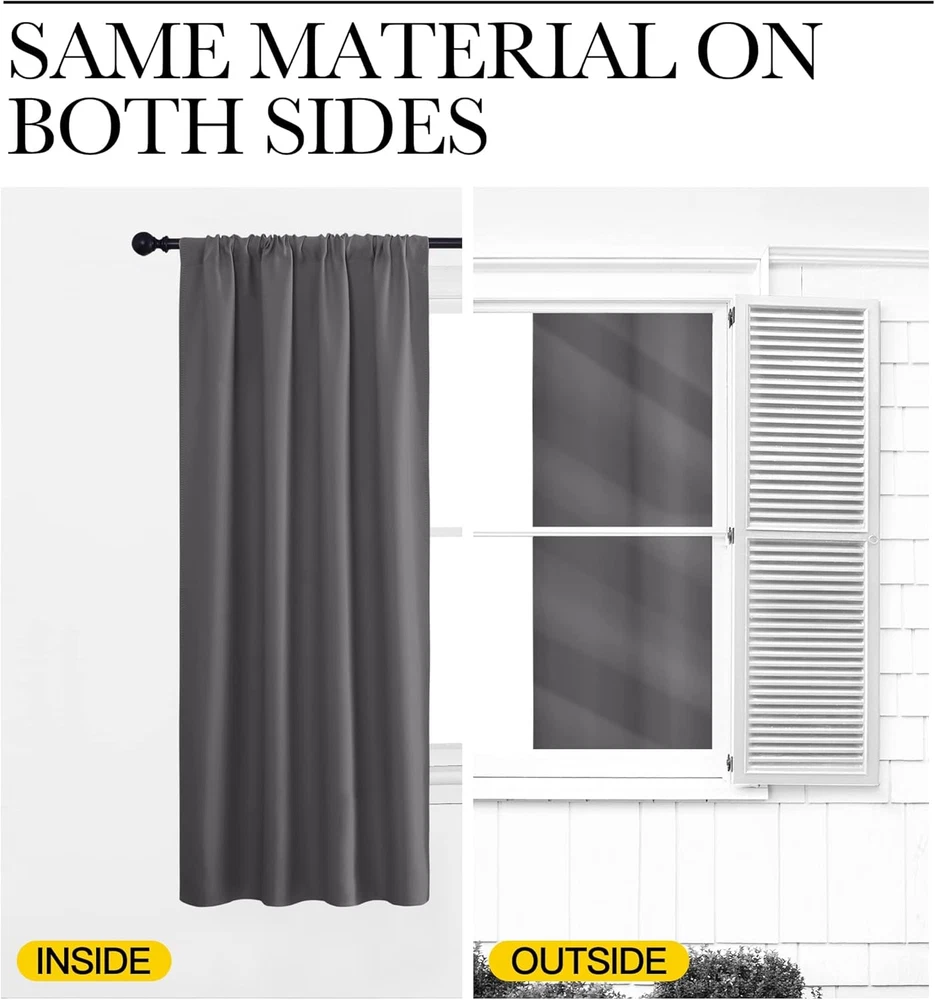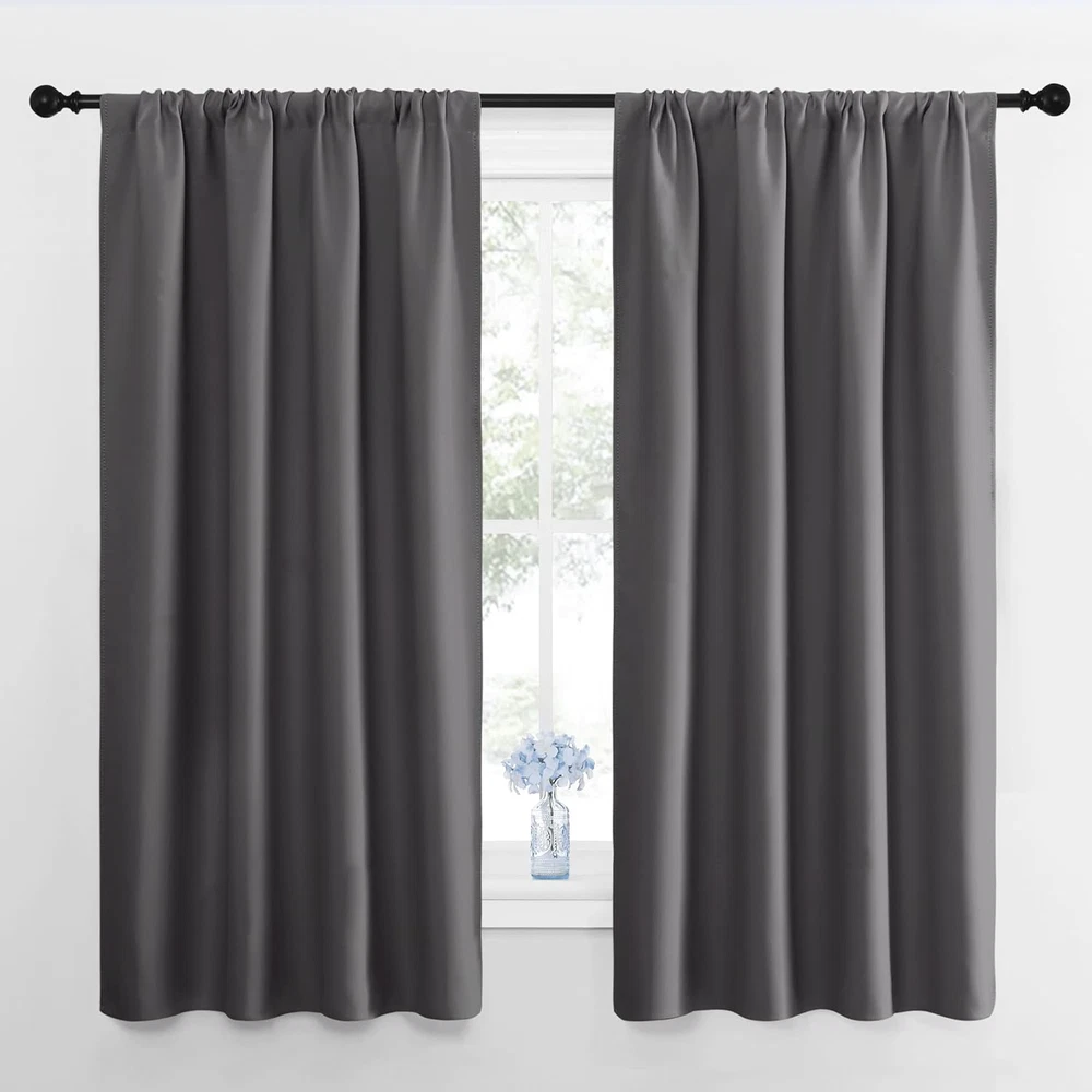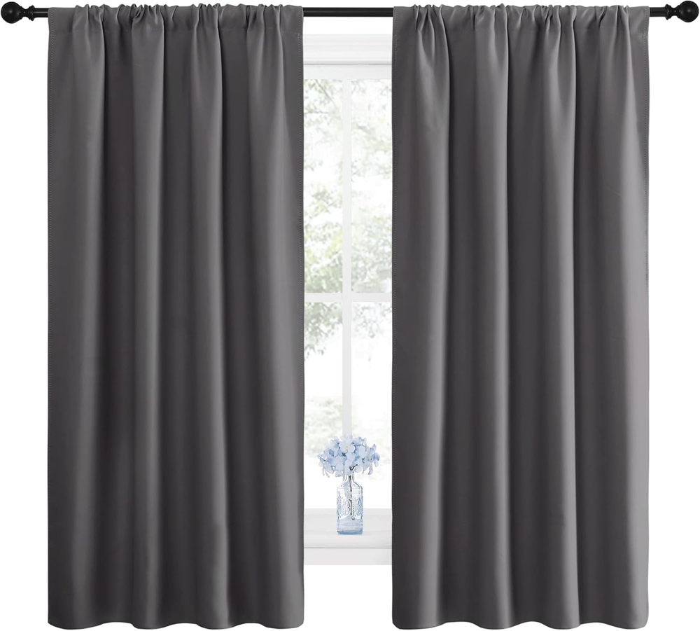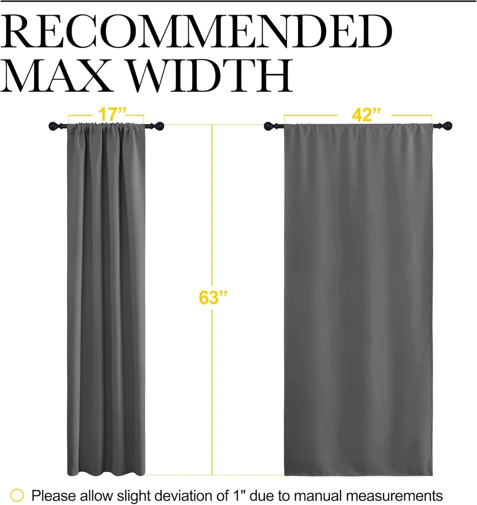 ELEGANT DESIGN: 2 panels per package. Each Blackout Curtain Panel measures 42 inches wide x 63 inches long. The NICETOWN drapery is constructed with rod pocket, fitting the curtain rod of your choice up to 2 inches in diameter, making the curtains easy to install and slide. LENGTH ADJUSTABLE: Don't worry if this blackout curtains are a few shorter than your windows. You can hang this curtain panels with rings and hooks. That could be adjustable for height max 3 inches. Hooks space distance around 4-6 inches. AMAZING MATERIAL: This unique, soft and heavy-duty blackout fabric is woven with three-layer construction. The middle layer of black yarns creates a curtain panel that is excellent for blocking out 85%-99% of light (Dark color works better on blocking light) while providing privacy. GOOD CHOICE: Perfect drapery option for anyone seeking to block daylight, take a nap, or keep sun glare off your TV. Besides, you can choose blackout valance and sheer curtains in the NICETOWN store to match. Such curtain sets provide a more permanent harmonious window dressing. EASY MAINTENANCE: Machine or hand washable. Mild detergent no bleaching. Low-temperature ironing. Measure your pole and window size before you choosing curtains. Product Description 1.9โ DIAM ROD POCKET Recommended with no greater than a 1.7-inch rod for maximum movement. HIGH DENSITY SUTURE The curtain fabric looks more exquisite and worthwhile. SAME FABRIC FRONT AND BACK The same fabric for both sides makes the curtain a simple style. TRIPLE WEAVE TECHNOLOGY Provide you with a perfect shading performance of about 50%-99% Blackout. DO WELL IN THERMAL INSULATED After insulating with the curtain, the temperature drops a lot. 1 ROD POCKET 2 HIGH DENSITY SUTURE 3 FRONT AND BACK 4 TRIPLE WEAVE FABRIC 5 THERMAL INSULATED COLOR SHADING DISPLAY THE COLOR OF THE ACTUAL ITEM MAY VARY SLIGHTLY IN DIFFERENT ENVIRONMENT The video showcases the product in use. The video guides you through product setup. The video compares multiple products. The video shows the product being unpacked. The video showcases the product in use. The video guides you through product setup. The video compares multiple products. The video shows the product being unpacked.