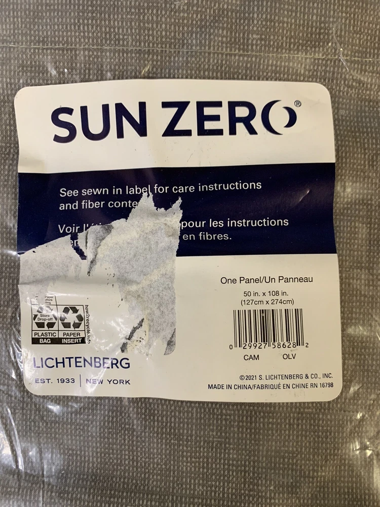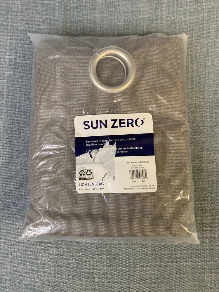 Blackout Duran Thermal Insulated Window Curtain - Sun Zero, Olive Green 50x108" YOU WILL RECEIVE 1 PANEL. This item is new. 50 inches wide x 108 inches long. Total Blackout technology blocks out 100% of outside light while enhancing privacy Thermal insulation helps keep summer heat and winter chill out of your home Energy efficient design reduces energy lost through your windows by up to 35% Noise reduction up to 35% helps you get a sounder, more uninterrupted sleep Built-in metal grommets fit curtain rods up to 1.5" in diameter Each panel sold separately