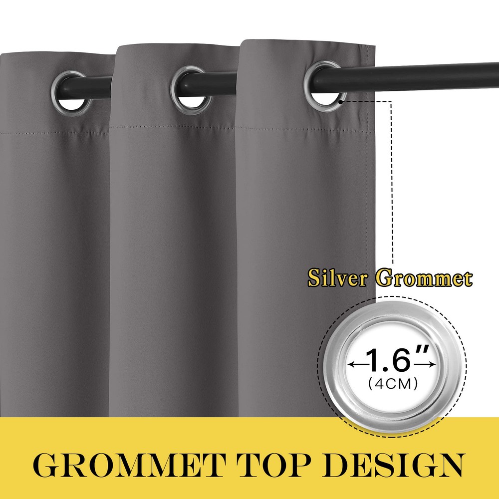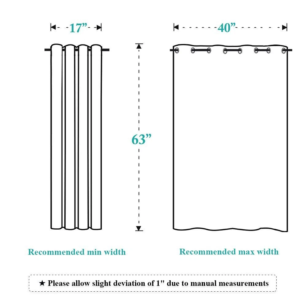ELEGANT DESIGN: 1-panel BLACKOUT CURTAIN per package. Each Curtain Panel measures 52" wide x 63" long. The drapery is constructed with gorgeous matte silver grommets, fitting the curtain rod of your choice up to 1.6 inches in diameter, making the curtains easy to install and slide. AMAZING MATERIAL: This unique, soft, and heavy-duty blackout fabric is woven with three-layer construction. The middle layer of black yarns creates a curtain panel that is excellent for blocking out 85%-99% of light (Dark color works better on blocking light) while providing privacy. MULTIFUNCTION: These Blackout Window Curtain Blind will prevent harmful light from reaching your floors and furniture, efficiently prevents cold or heat transfer from outside, will increase the energy efficiency of your home, and allow you to create darkness at any time of day. GOOD CHOICE: Perfect drapery option for anyone seeking to block daylight, take a nap, or keep sun glare off your TV. Besides, you can choose blackout valance and sheer curtains in the to match. Such curtain sets provide a more permanent harmonious window dressing. EASY CARE: Good-quality finishing will withstand years of use. Machine washable and Wash the water temperature below 86F. Mild detergent no bleaching. Low-temperature ironing. Don’t use sharp things scratching curtains.