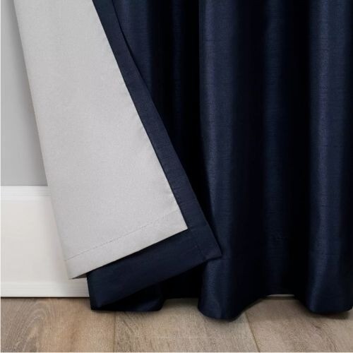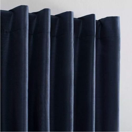 95"L x 50"W ~ Navy Blue Elegant faux dupioni silk fabric with a raw slub texture imparts opulent radiance Extreme Blackout Thermal Lining Energy Efficient design reduces energy lost through your windows by up to 40% Thermal properties help keep summer heat and winter chill out of your home Noise reduction by up to 30% helps you get a sounder, more uninterrupted sleep Machine wash and dry Back Tab top treatment Panel sold individually and measures 50" WItem comes from a smoke free/ pet free home unless otherwise stated above.