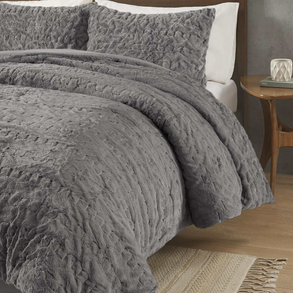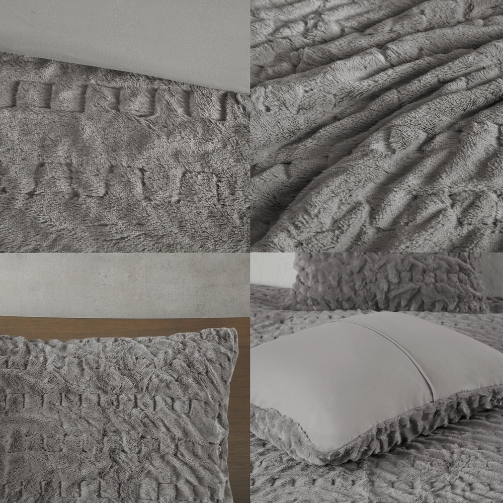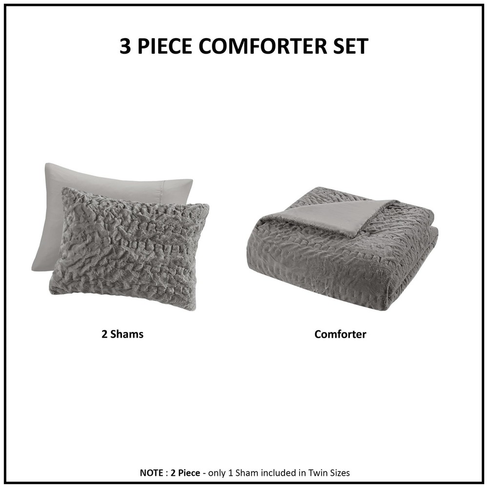 The Blair comforter combines plush faux fur with a stylish ruched design and solid microfiber reverse for year-round luxury. For best results, use "no heat" or "air fluff" on your dryer to remove loose fibers Enjoy the soft & cozy microfiber that is an ultra-fine fiber, lightweight and durable fabric for the ultimate comfort ensuring a restful night sleep Ulra soft and plush down alternative filling and Oeko-Tex certified to be free from any substance or chemicals for superior comfort and wellness Set include: 1 Comfoter: 90"W x 90"L, 2 Standard Shams: 20"W x 26"L CARE: Machine wash cold on gentle cycle, tumble dry on low heat, and do not bleach to keep the color vibrant. Commercial size washer is recommended. Minor shedding is expected with faux fur material and should subside after 3-4 washes