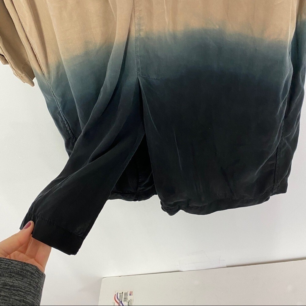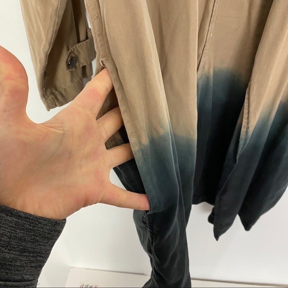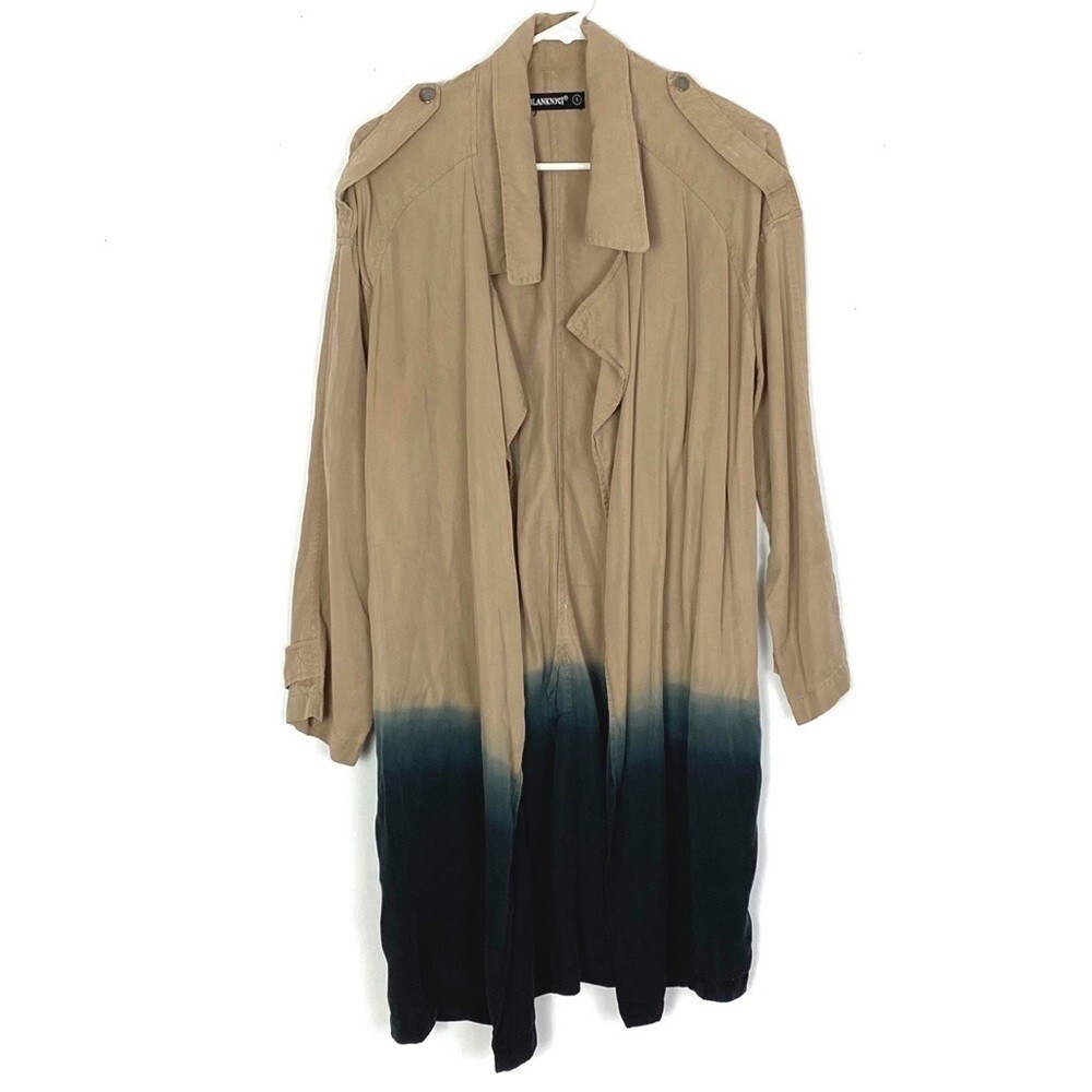 Blank NYC Dip Dyed Ombré Trench Jacket Size Small Open draped front, no closure Size pockets Back slit Beige & navy blue 100% lyocell Light - medium weight, denim style twill texture Excellent used condition! Worn twice, subtle spot (see photo) Tags not description : coat cardigan cape tan teal loose fit casual versatile stylish gorgeous flirty women’s womens on sale cheap long sleeve s S neutral beige brown utility retro unique versatile fabulous neutral midi maxi duster EUC like new beautiful loose big baggy relaxed tie dye retro tan navy