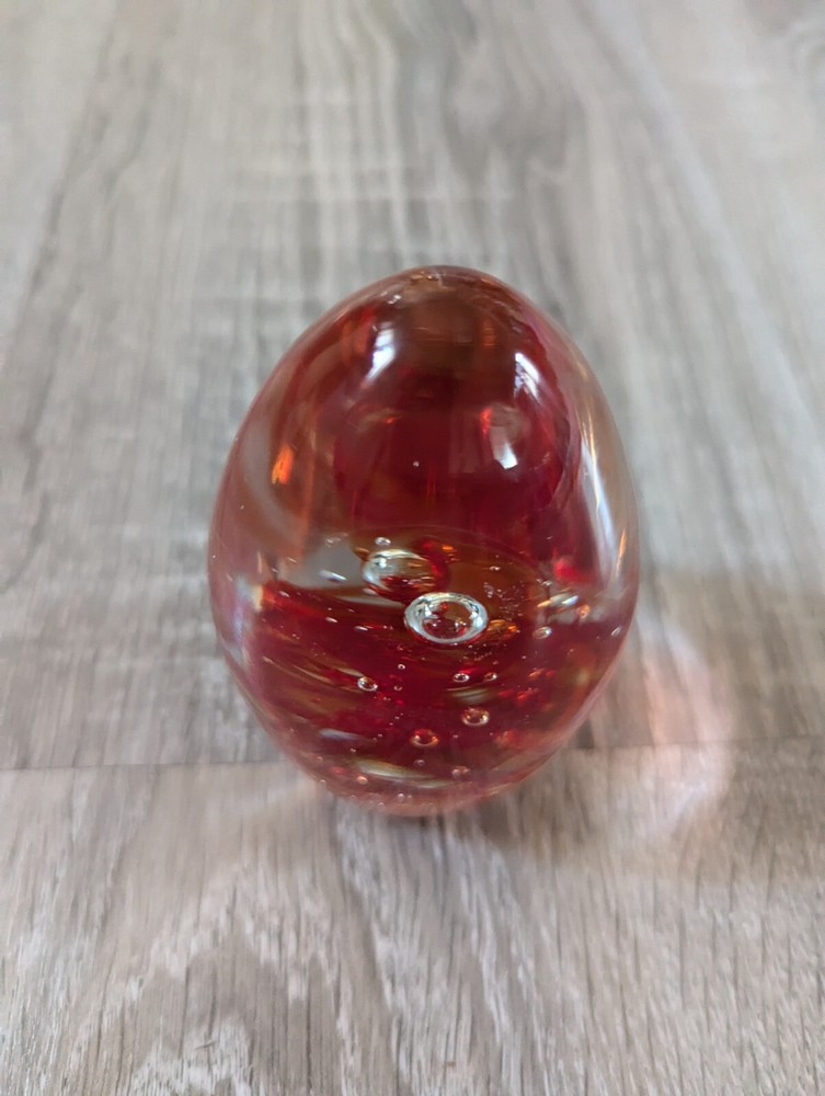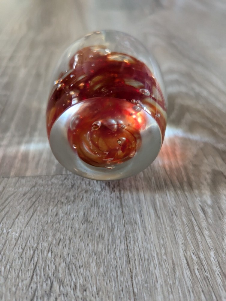 This stunning hand-blown glass paperweight is a true work of art! The vibrant red swirls dance beautifully inside the glossy egg-shaped form, catching the light from every angle. At 4 inches tall, it makes an eye-catching accent for desks, shelves, or display cabinets. The Art Deco-inspired design feels both vintage and timeless, adding a touch of elegance wherever it's placed. Perfect for collectors or anyone who appreciates unique glass artistry - I can't stop admiring mine!