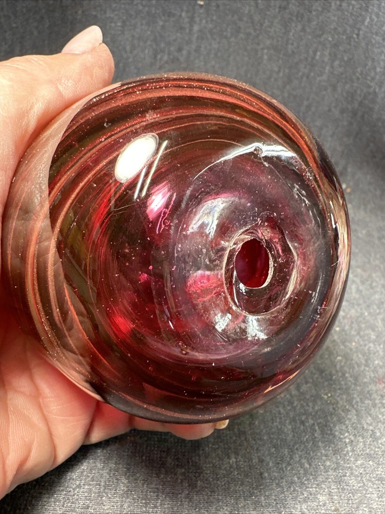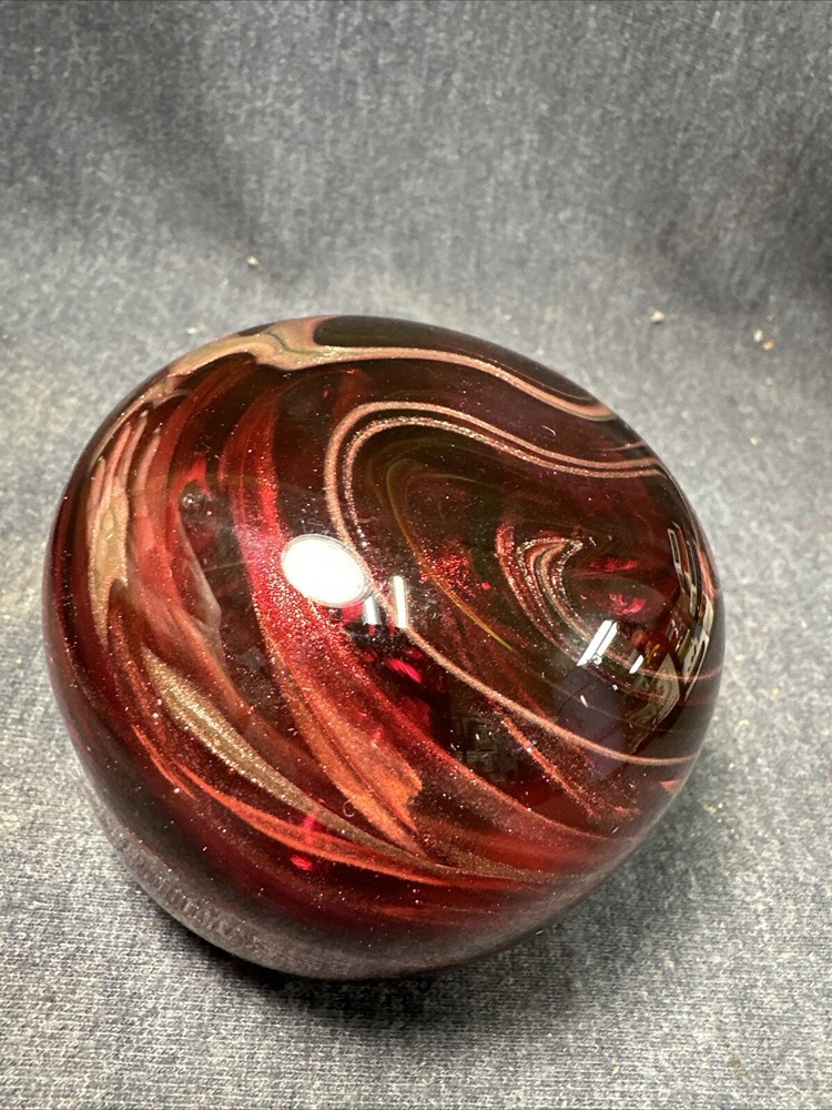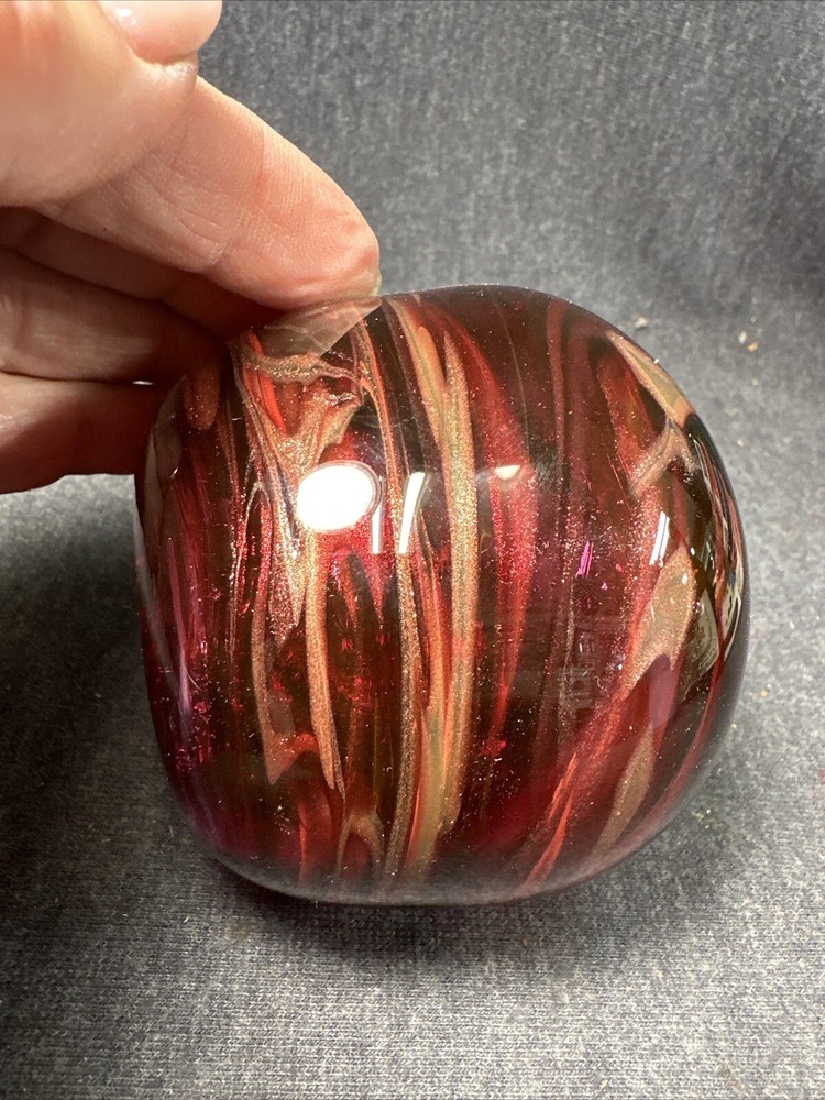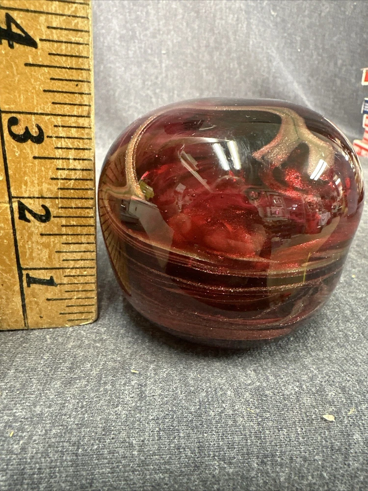 Add a touch of elegance to your desk or bookshelf with this stunning blown glass paperweight. The intricate red and silver swirls create a beautiful and unique design that is sure to catch the eye of anyone who enters the room. Measuring at 3 inches tall, this paperweight is perfect for displaying your favorite art studio pieces or simply as a decorative piece. Crafted using the hand blown glass production technique, this paperweight features a glossy finish and is made of high-quality glass materials. The vintage-inspired design and art deco style make it a timeless addition to any collection. Whether you're a collector or simply looking for a beautiful and functional desk accessory, this blown glass paperweight is sure to impress. Please look at pictures for more details. We will package securely and ship promptly.