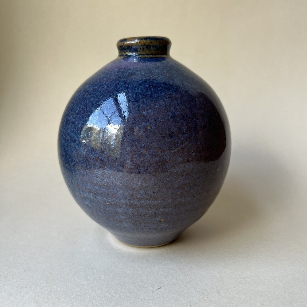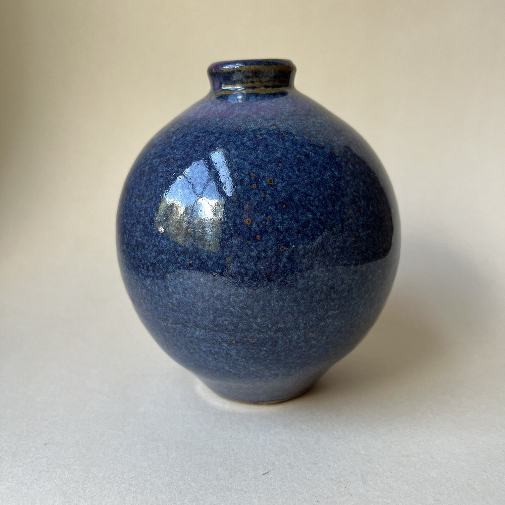 Blue Glaze Ball Shaped Bud Art Studio Pottery Vase Approx. 5 in tall x 4.5 in Pre-owned, no chips, no cracks....