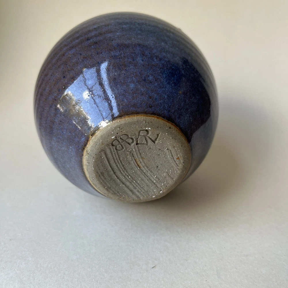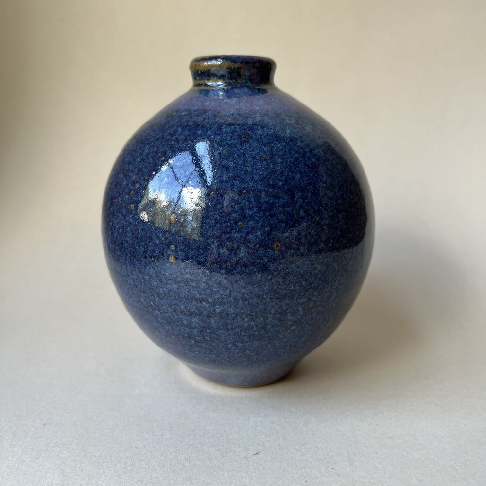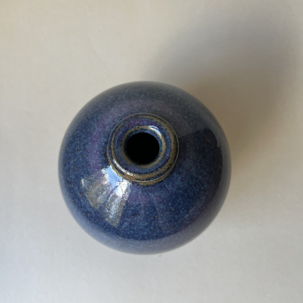 Blue Glaze Ball Shaped Bud Art Studio Pottery Vase Approx. 5 in tall x 4.5 in Pre-owned, no chips, no cracks.