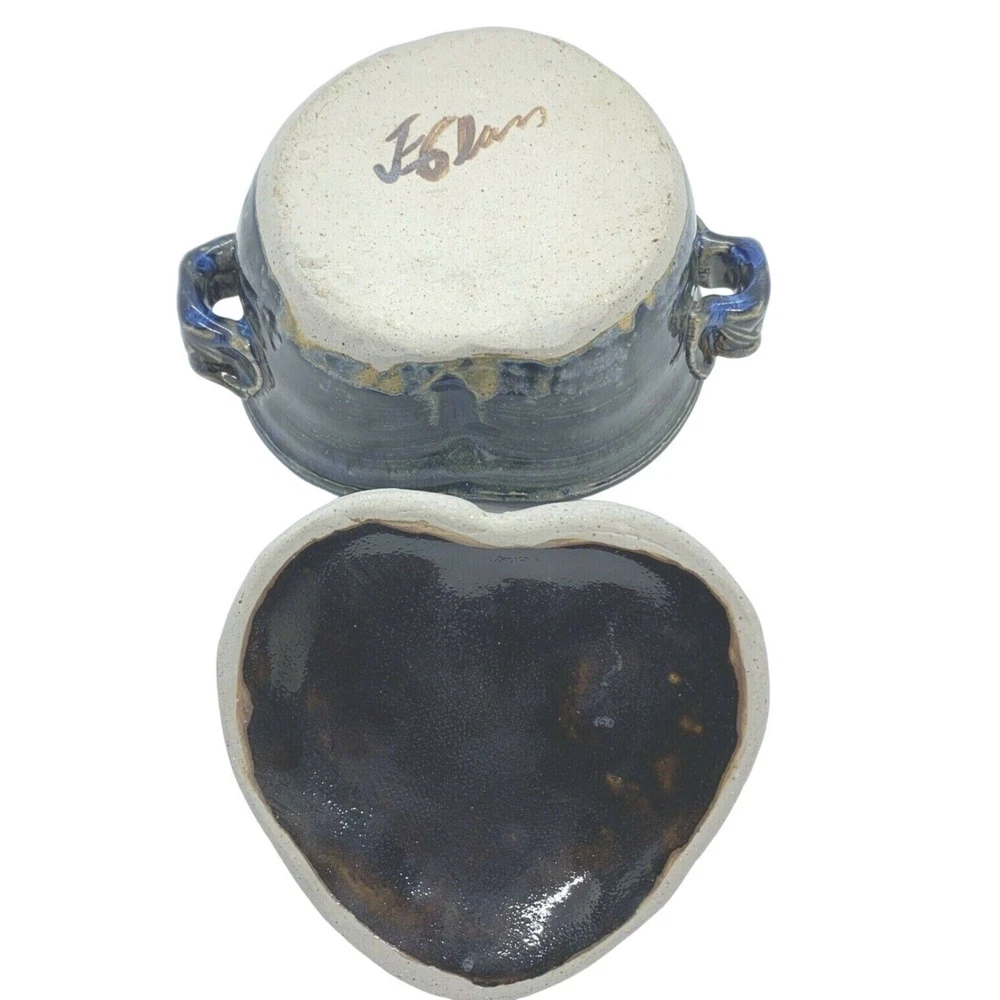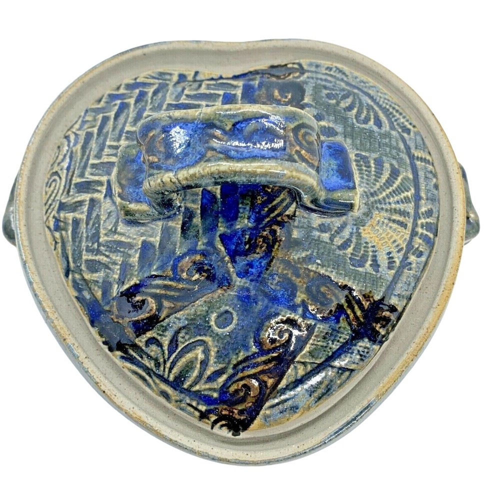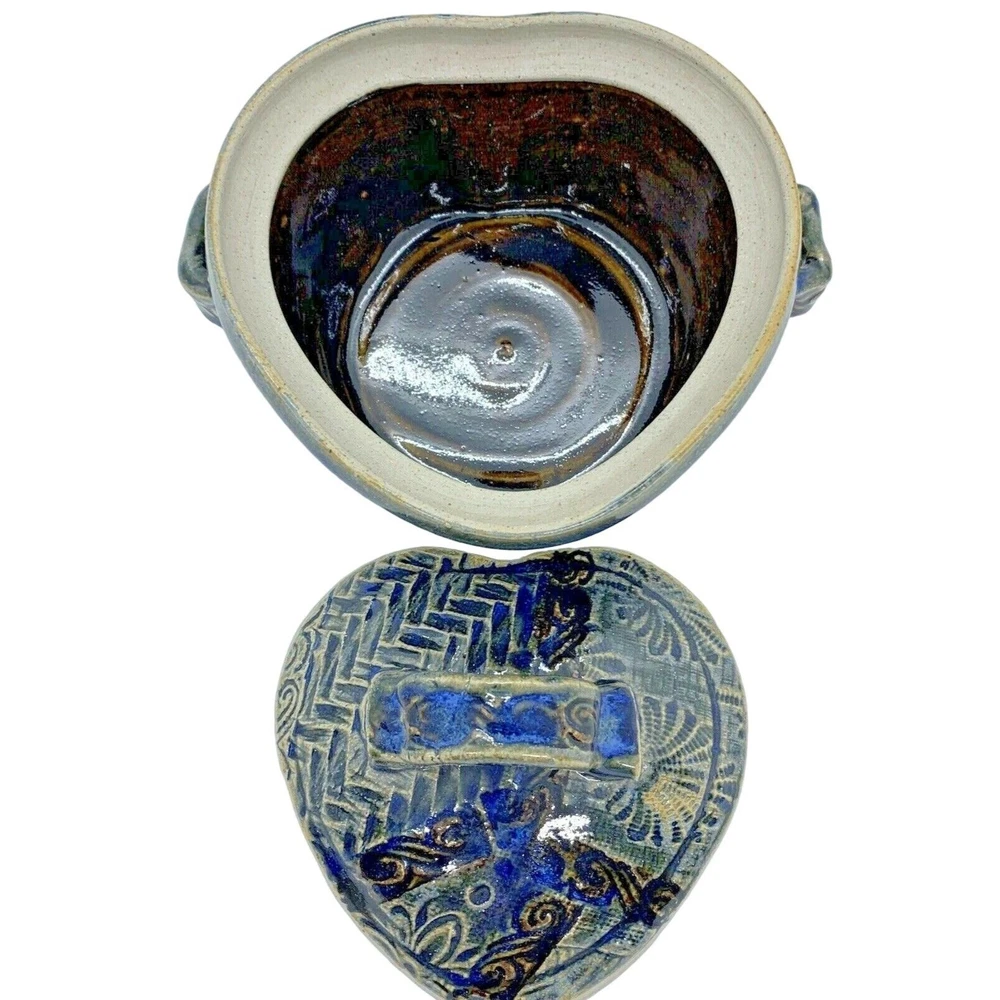 This Handmade Blue Heart Shaped Trinket Box is a one-of-a-kind Studio Pottery piece. Its rustic style and heart pattern make it a charming addition to any decor. • Brand: Handmade • Color: Blue • Size: Measures 5" X 6" X 3" • Style: Rustic • Pattern: Hearts • Material: Clay