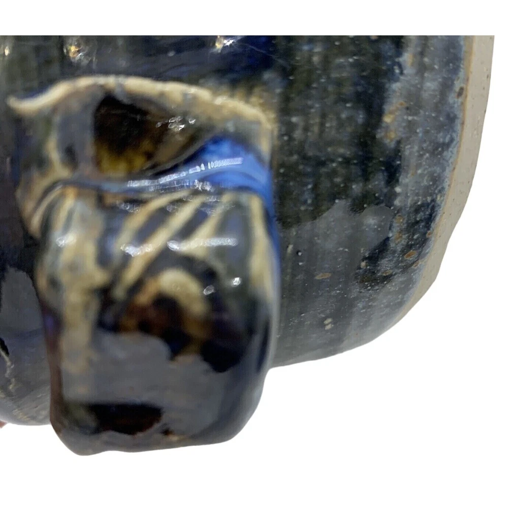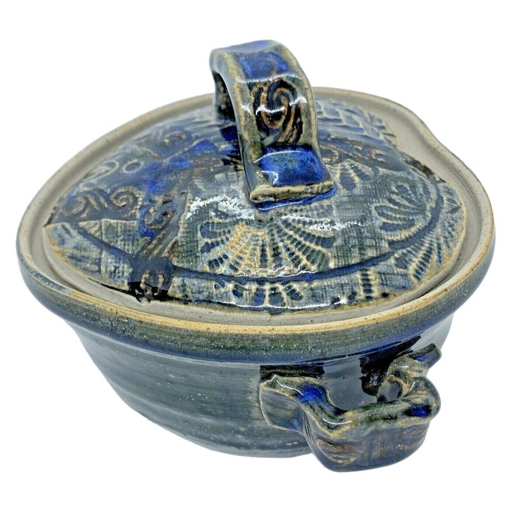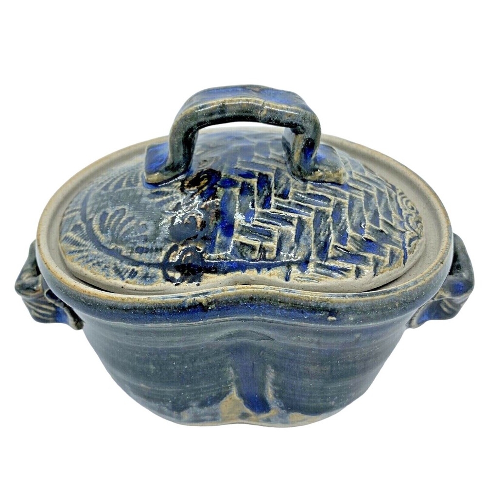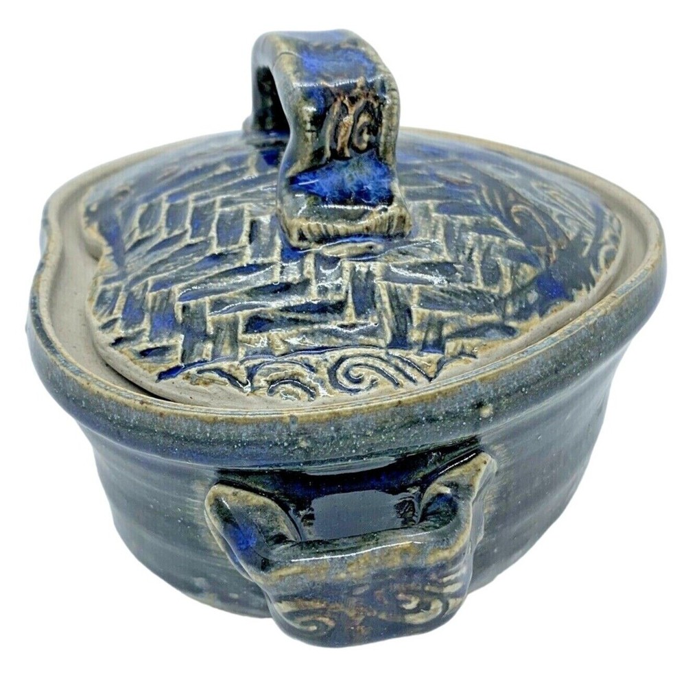 This Handmade Blue Heart Shaped Trinket Box is a one-of-a-kind Studio Pottery piece. Its rustic style and heart pattern make it a charming addition to any decor. • Brand: Handmade • Color: Blue • Size: Measures 5" X 6" X 3" • Style: Rustic • Pattern: Hearts • Material: Clay