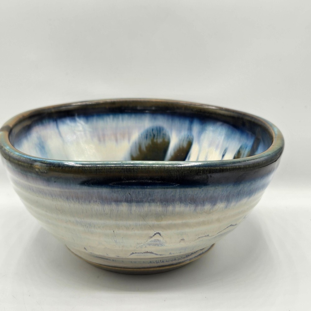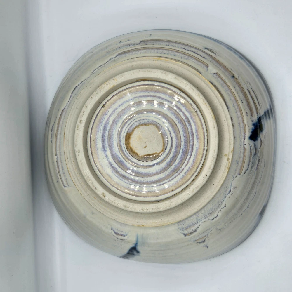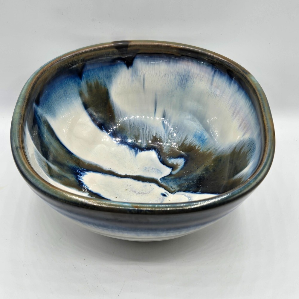 This beautiful blue bowl with a unique blue swirl pattern is a perfect addition to your collection. It is a handmade art pottery piece signed by the artist. The bowl has a width of 6.5 inches and is made of high-quality ceramic material with a glossy finish. The production technique of this bowl is pottery, and it has an incised backstamp. This bowl is perfect for use as a decorative piece or for serving your favorite dishes. It is a must-have for any pottery or art studio. Add this stunning blue bowl to your collection today! The products you buy from us are pre-owned and could have visible signs of use, but we will try to be transparent about any noticeable damage or flaws the item might have when describing it to you.