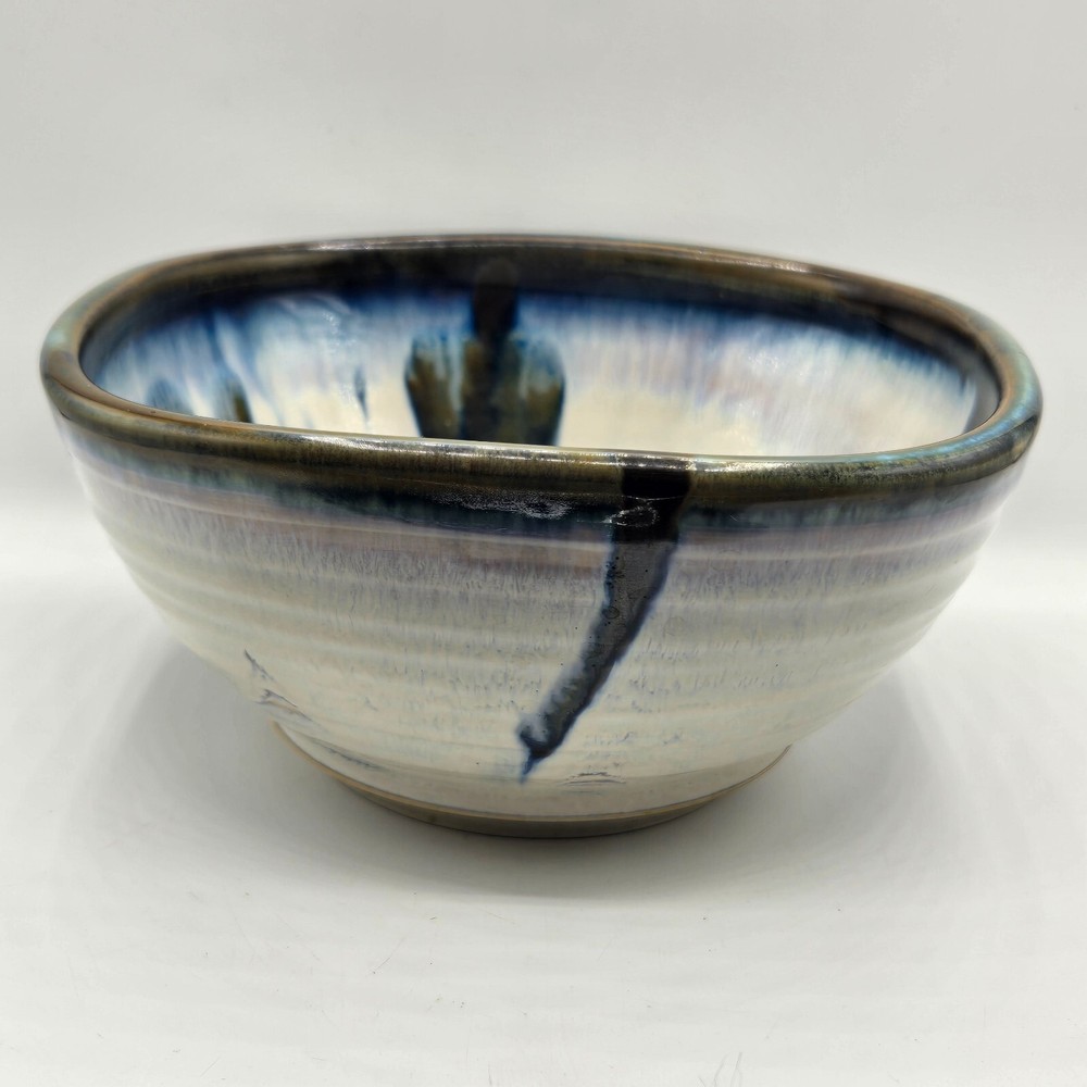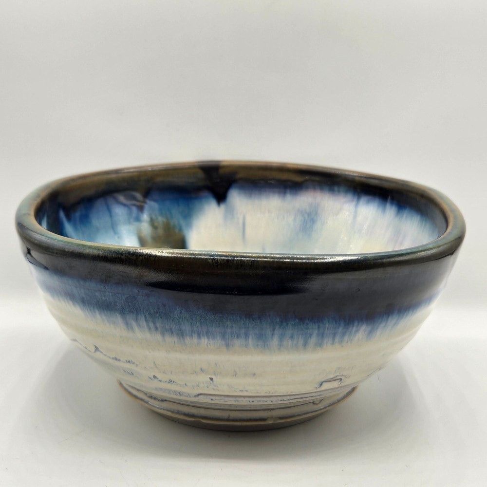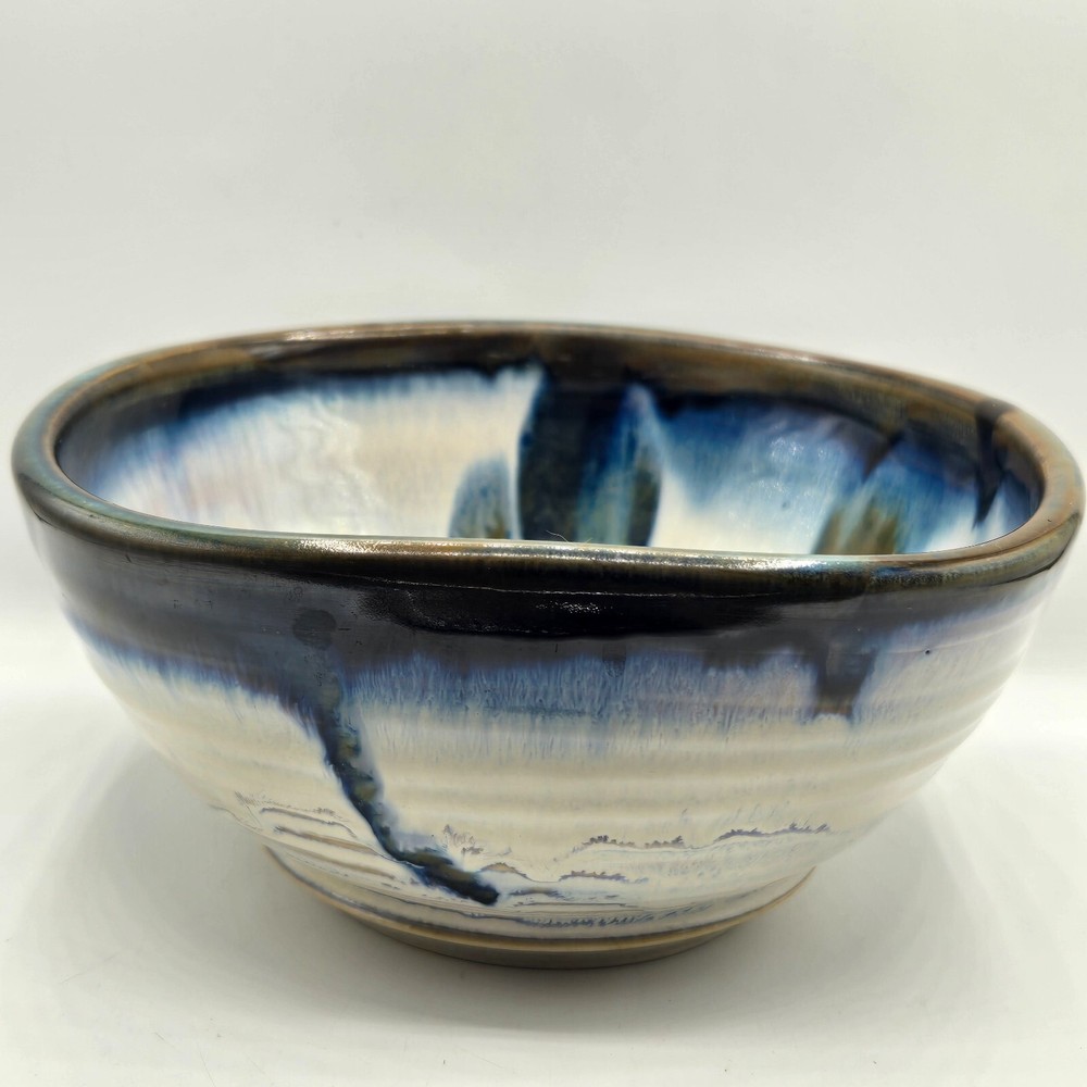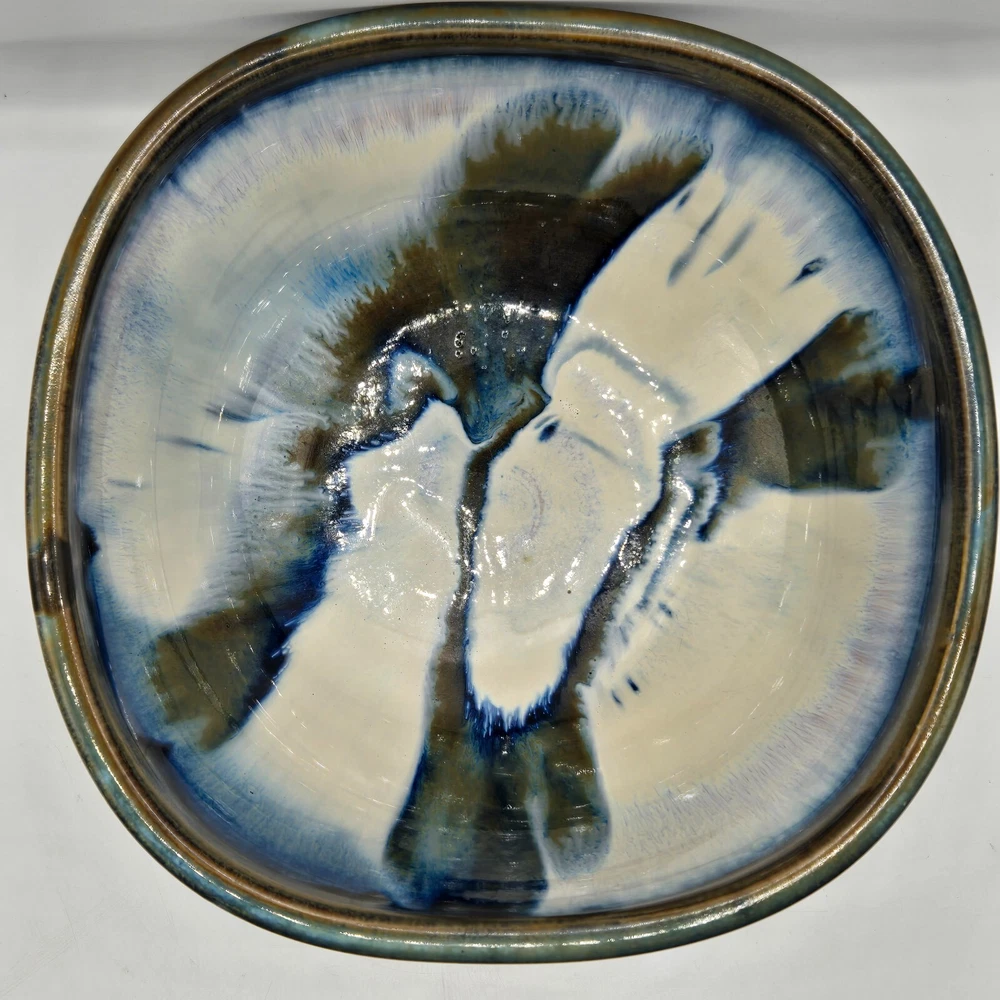 This beautiful blue bowl with a unique blue swirl pattern is a perfect addition to your collection. It is a handmade art pottery piece signed by the artist. The bowl has a width of 6.5 inches and is made of high-quality ceramic material with a glossy finish. The production technique of this bowl is pottery, and it has an incised backstamp. This bowl is perfect for use as a decorative piece or for serving your favorite dishes. It is a must-have for any pottery or art studio. Add this stunning blue bowl to your collection today! The products you buy from us are pre-owned and could have visible signs of use, but we will try to be transparent about any noticeable damage or flaws the item might have when describing it to you.