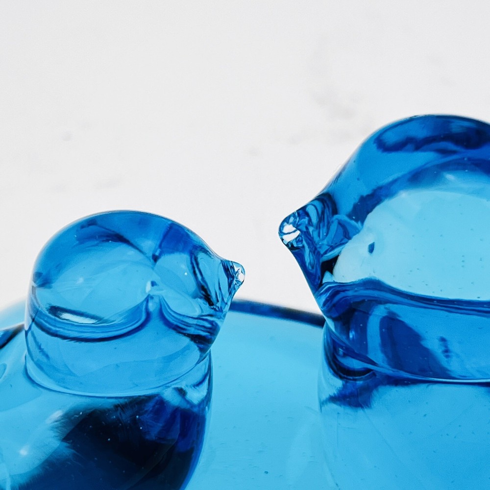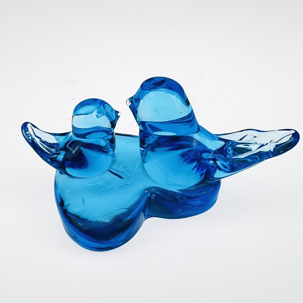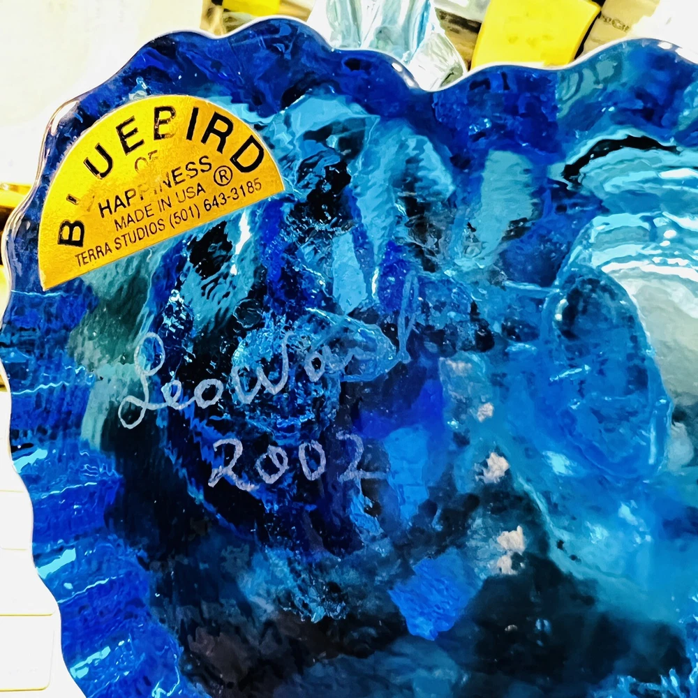 Terra Studios art glass - two bluebirds of happiness facing each other on a heart-shaped base. Signed Leo Ward, dated 1987 (best as I can see it). The heart base about 3.5", and from one tail of a bird to the other, it measures about 5.5", and it's 3" tall. Condition: Excellent! I found no chips, no cracks, no haziness, no repairs. Used once for a wedding. See photos. Shipping: Most items ship within one business day. I will happily combine shipping on multiple listings when possible. Other notes: Please remember that due to the differences in monitors, colors may vary. If you have questions, please contact me. Please visit my store to see all my other items! Bluebirds of Happiness on Heart Signed Leo Ward Terra Studios Cobalt Art Glass