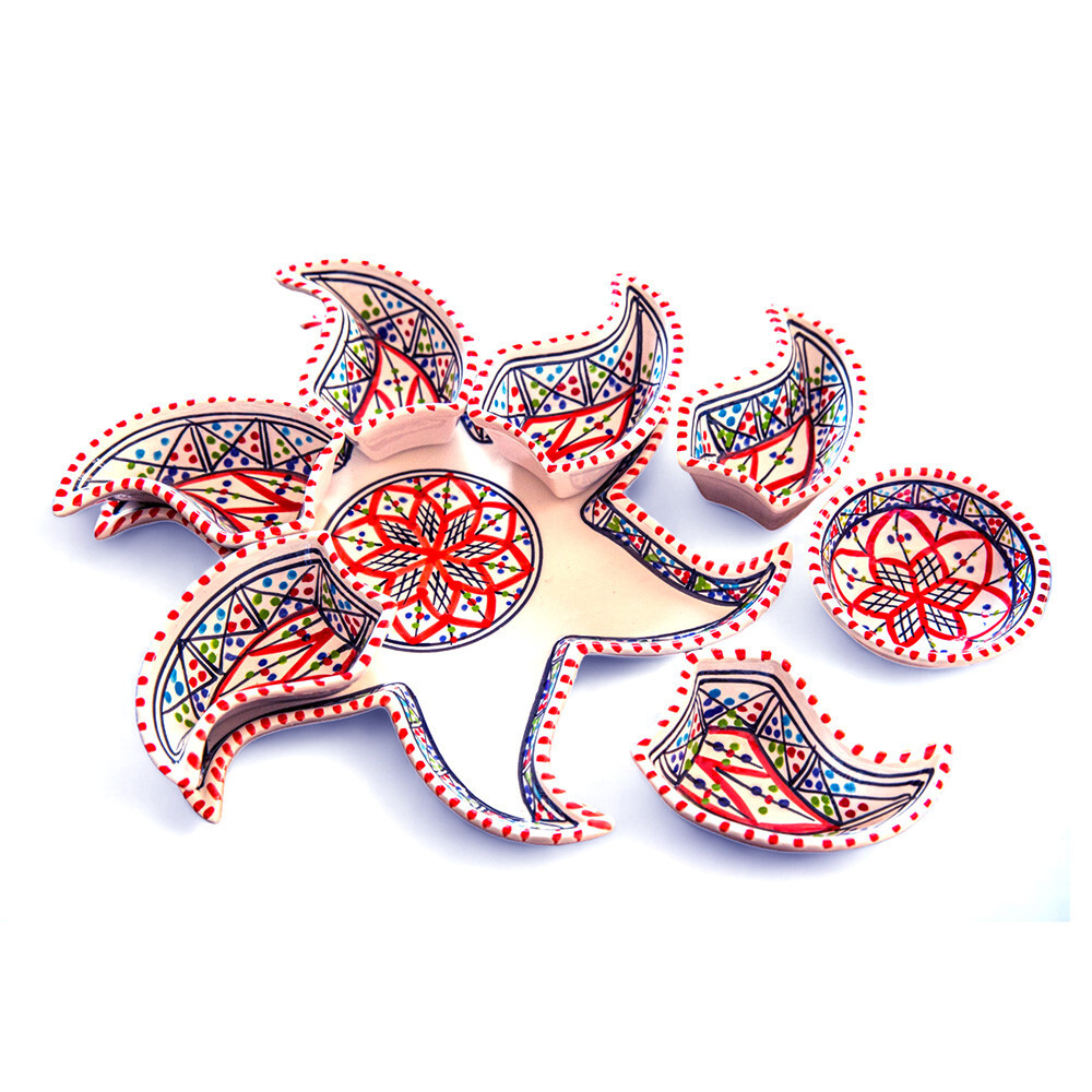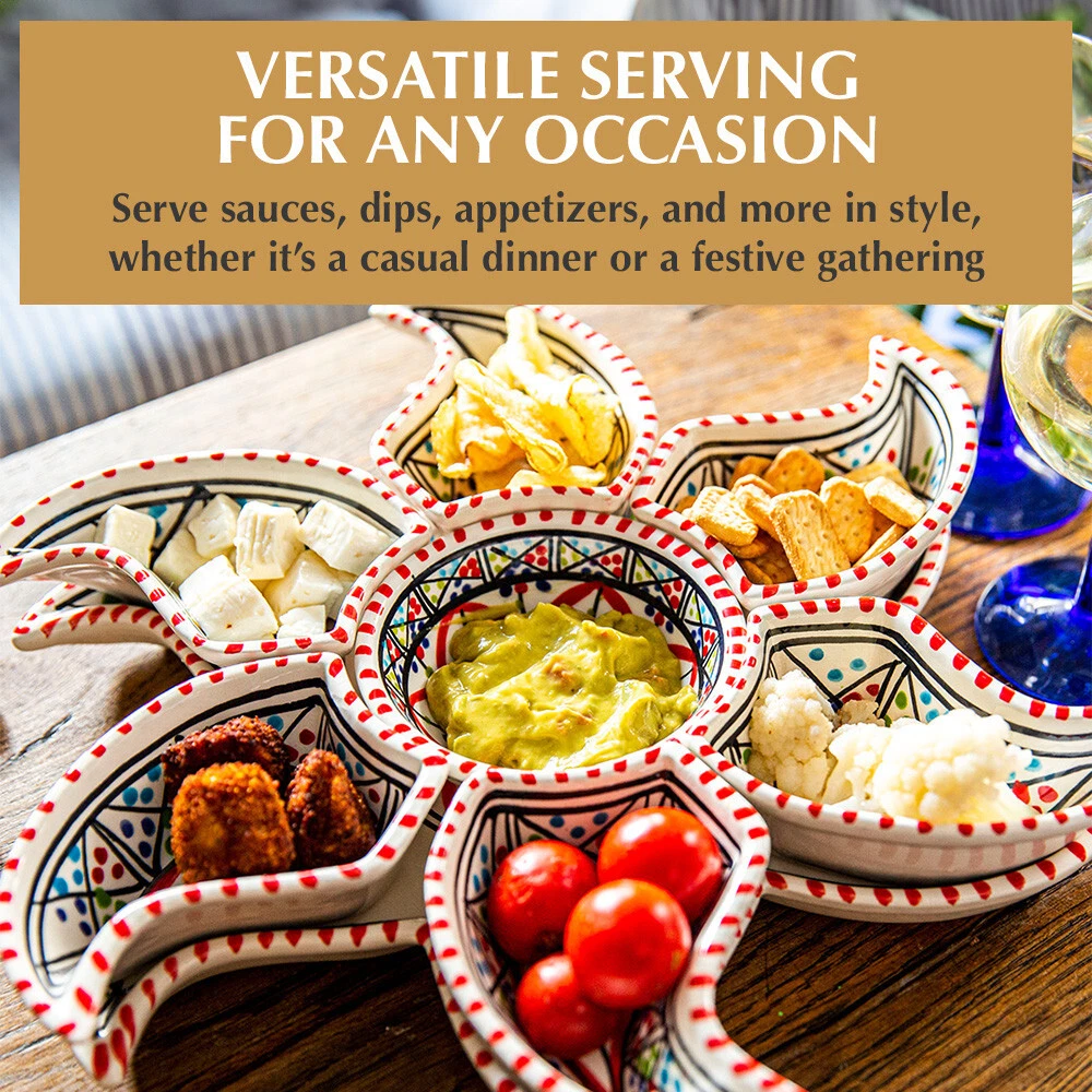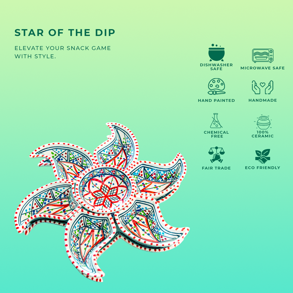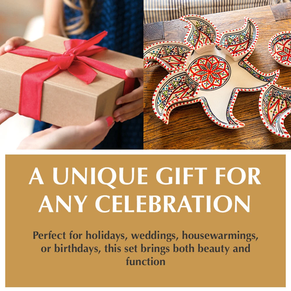 Kamsah Star-Shaped Ceramic Serving Plate Set - 8-Piece Appetizer & Condiment Tray ๐ Looking for the perfect festive dish for your gatherings? This handcrafted Kamsah star-shaped serving plate is exactly what you need! โจ The set includes 7 small trays that break apart to serve appetizers, dips, or condiments, and a large star-shaped plate underneath. Ideal for parties, weddings, or everyday use. ๐ Product Features: Versatile 8-Piece Set : 7 small bowls + 1 large star-shaped plate = perfect for dips, nuts, condiments, or even small valuables. ๐ซ Handmade & Fair Trade : Crafted by artisans in Neapolis, Tunisia, ensuring fair wages and supporting local craftsmanship. ๐คฒ Durable & Safe : Microwave and dishwasher safe. Handwashing recommended to maintain artisanal quality. ๐งผ Ethically Sourced : Kamsah donates 10% of profits to support artisans and community causes. โค๏ธ Great for Gifting : Perfect for housewarming, wedding, birthday, or Christmas gifts! ๐ Dimensions : Length: 13.5โ Width: 13.5โ Depth: 2โ This versatile set will be your go-to for entertaining or gifting! ๐