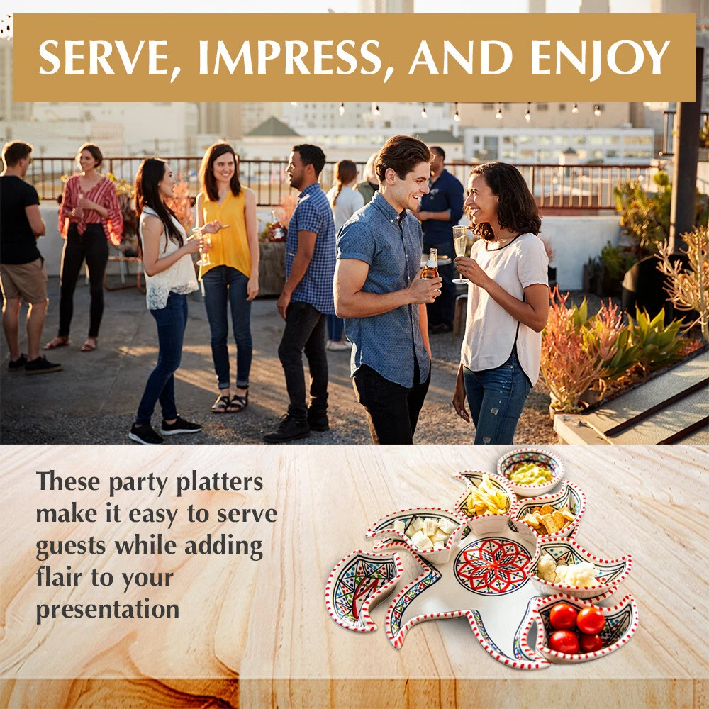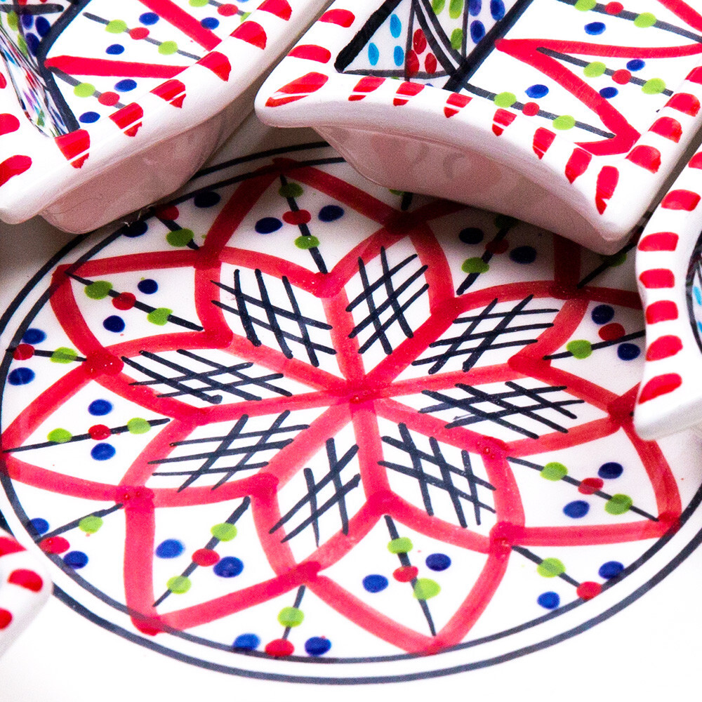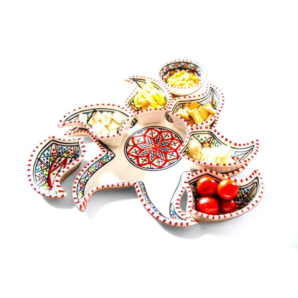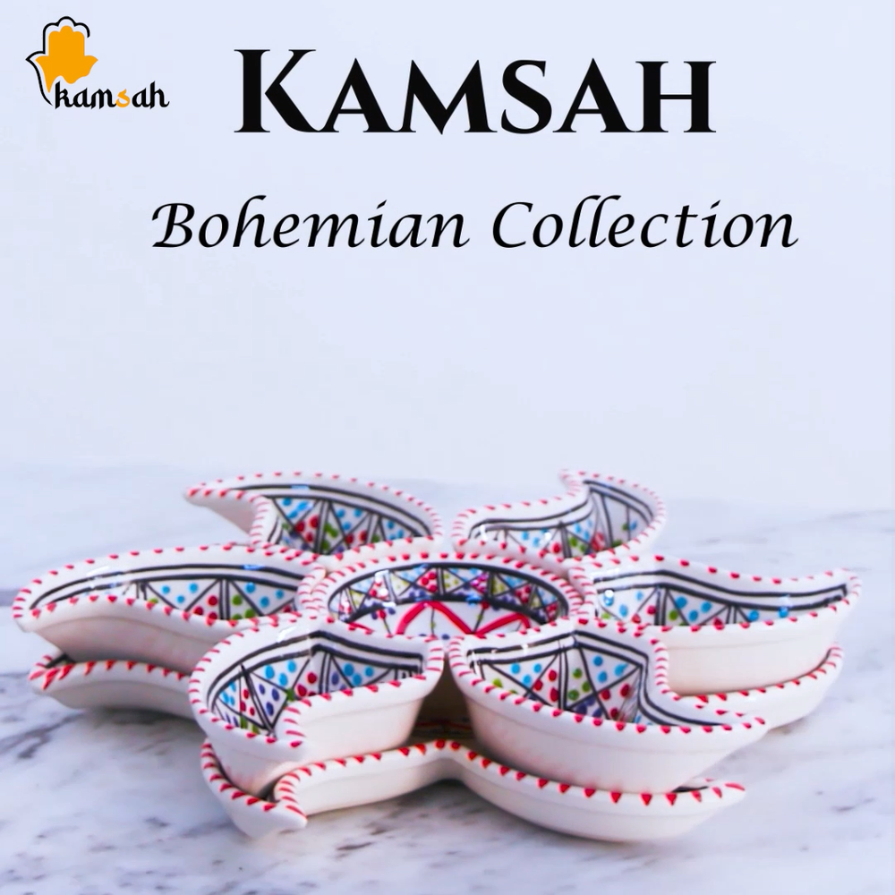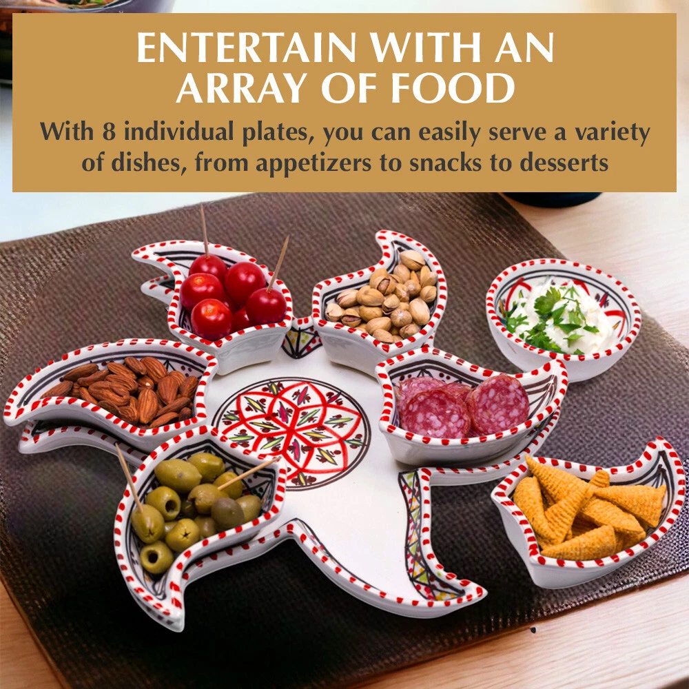 Kamsah Star-Shaped Ceramic Serving Plate Set - 8-Piece Appetizer & Condiment Tray ๐ Looking for the perfect festive dish for your gatherings? This handcrafted Kamsah star-shaped serving plate is exactly what you need! โจ The set includes 7 small trays that break apart to serve appetizers, dips, or condiments, and a large star-shaped plate underneath. Ideal for parties, weddings, or everyday use. ๐ Product Features: Versatile 8-Piece Set : 7 small bowls + 1 large star-shaped plate = perfect for dips, nuts, condiments, or even small valuables. ๐ซ Handmade & Fair Trade : Crafted by artisans in Neapolis, Tunisia, ensuring fair wages and supporting local craftsmanship. ๐คฒ Durable & Safe : Microwave and dishwasher safe. Handwashing recommended to maintain artisanal quality. ๐งผ Ethically Sourced : Kamsah donates 10% of profits to support artisans and community causes. โค๏ธ Great for Gifting : Perfect for housewarming, wedding, birthday, or Christmas gifts! ๐ Dimensions : Length: 13.5โ Width: 13.5โ Depth: 2โ This versatile set will be your go-to for entertaining or gifting! ๐