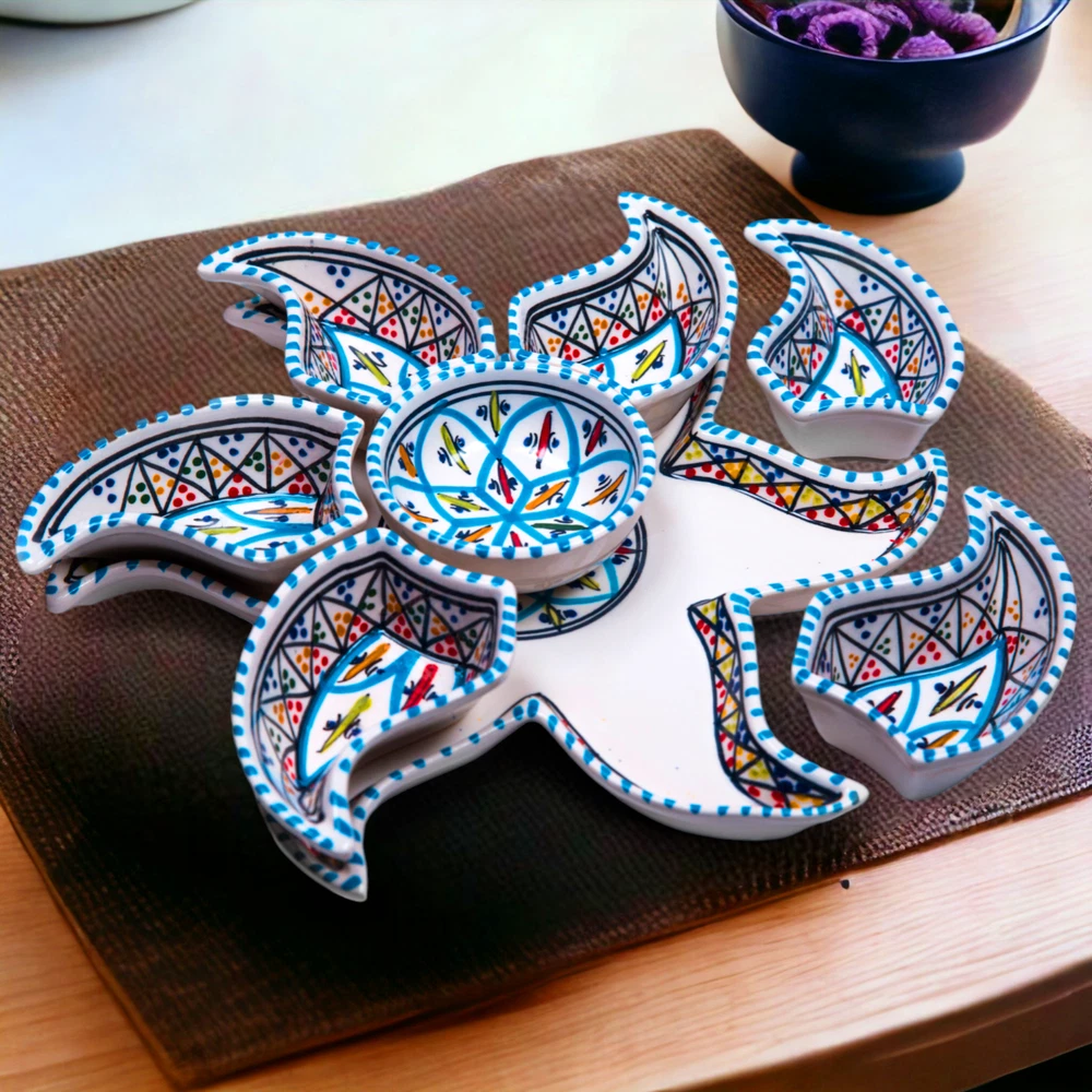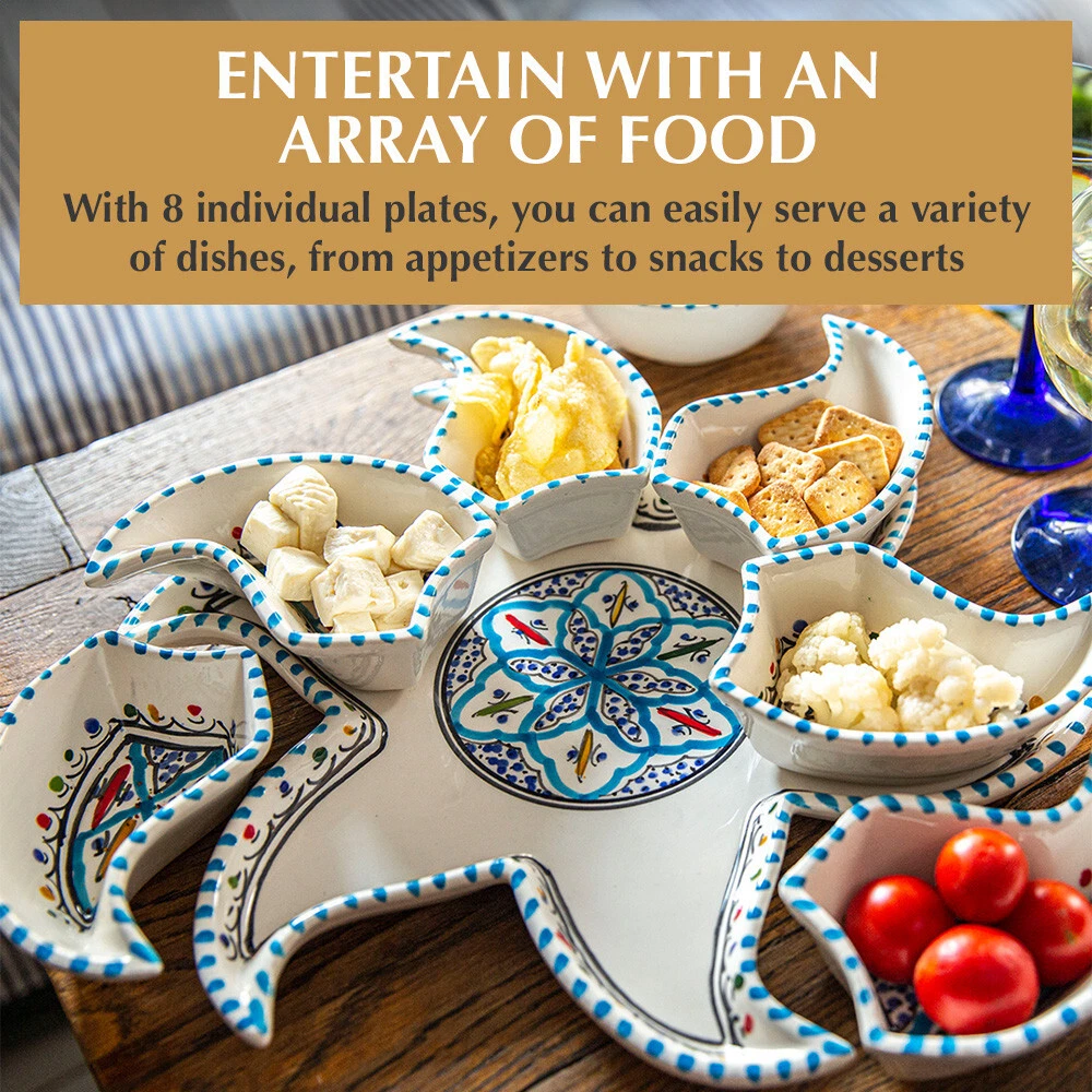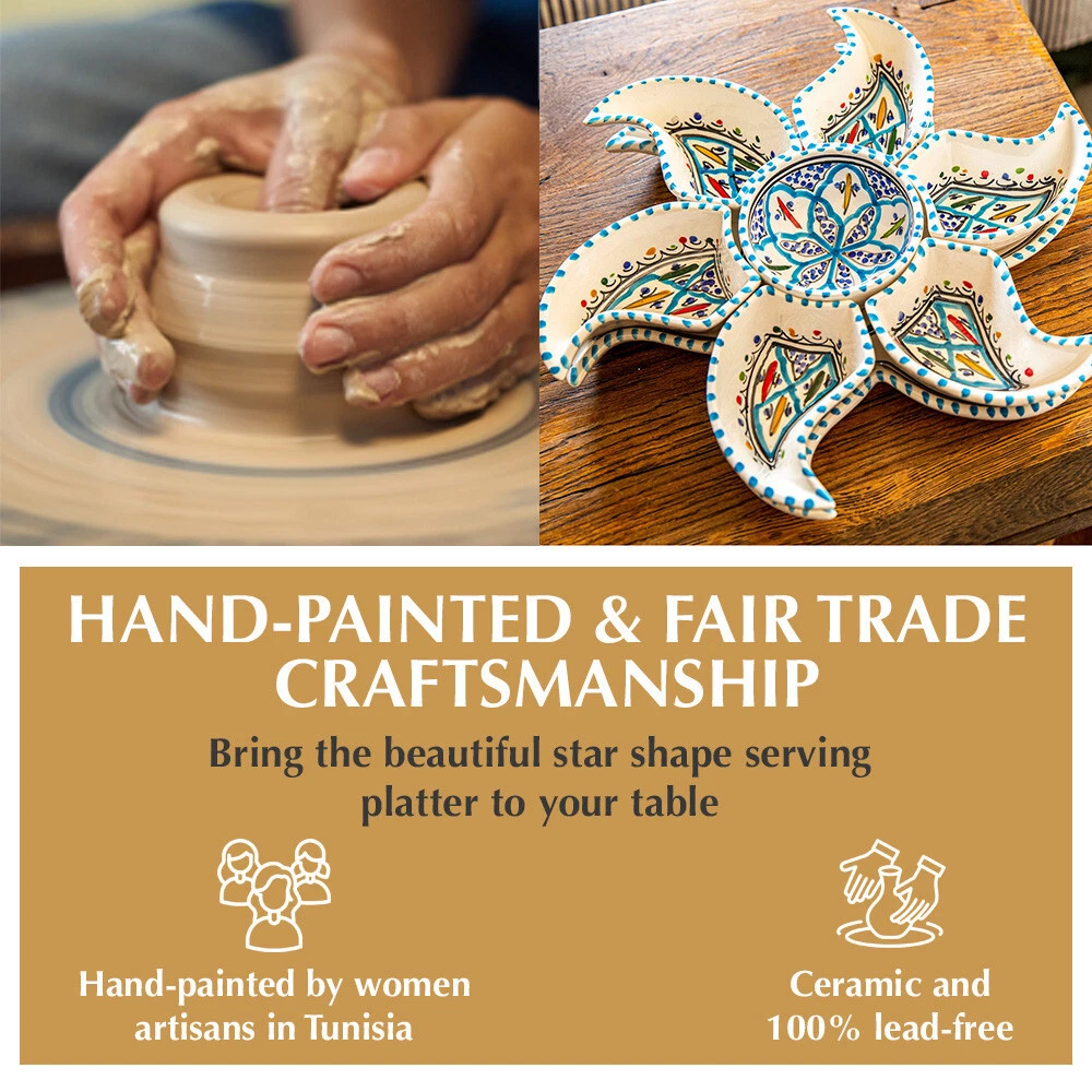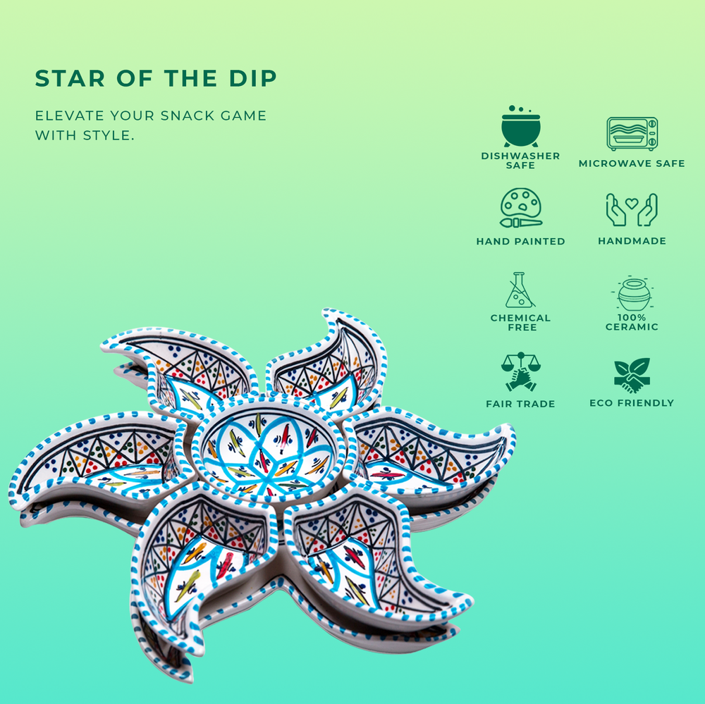 Kamsah Star-Shaped Ceramic Serving Plate Set - 8-Piece Appetizer & Condiment Tray ๐ Looking for the perfect festive dish for your gatherings? This handcrafted Kamsah star-shaped serving plate is exactly what you need! โจ The set includes 7 small trays that break apart to serve appetizers, dips, or condiments, and a large star-shaped plate underneath. Ideal for parties, weddings, or everyday use. ๐ Product Features: Versatile 8-Piece Set : 7 small bowls + 1 large star-shaped plate = perfect for dips, nuts, condiments, or even small valuables. ๐ซ Handmade & Fair Trade : Crafted by artisans in Neapolis, Tunisia, ensuring fair wages and supporting local craftsmanship. ๐คฒ Durable & Safe : Microwave and dishwasher safe. Handwashing recommended to maintain artisanal quality. ๐งผ Ethically Sourced : Kamsah donates 10% of profits to support artisans and community causes. โค๏ธ Great for Gifting : Perfect for housewarming, wedding, birthday, or Christmas gifts! ๐ Dimensions : Length: 13.5โ Width: 13.5โ Depth: 2โ This versatile set will be your go-to for entertaining or gifting! ๐