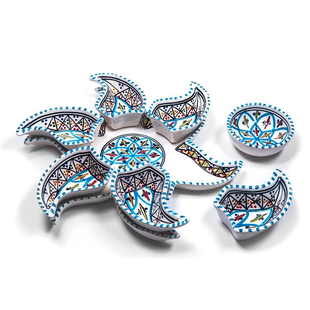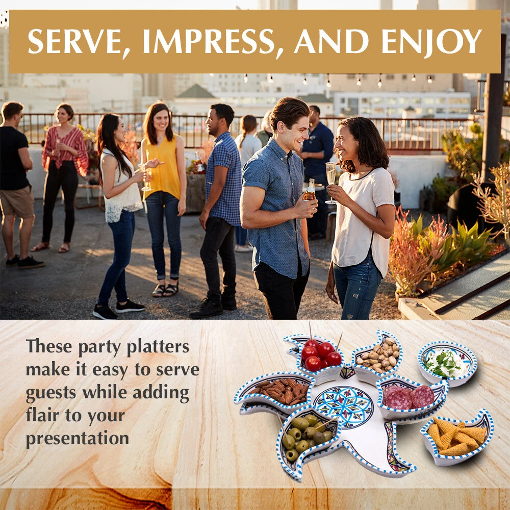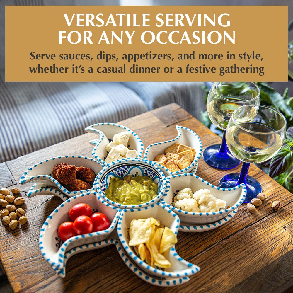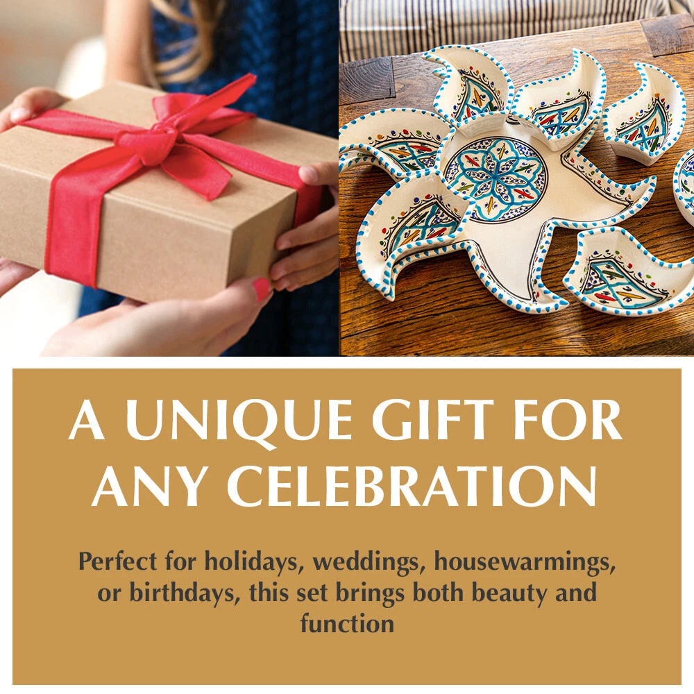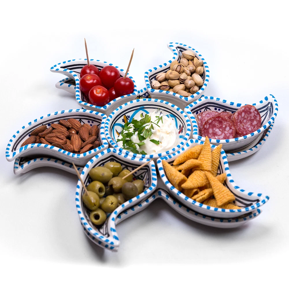 Kamsah Star-Shaped Ceramic Serving Plate Set - 8-Piece Appetizer & Condiment Tray ๐ Looking for the perfect festive dish for your gatherings? This handcrafted Kamsah star-shaped serving plate is exactly what you need! โจ The set includes 7 small trays that break apart to serve appetizers, dips, or condiments, and a large star-shaped plate underneath. Ideal for parties, weddings, or everyday use. ๐ Product Features: Versatile 8-Piece Set : 7 small bowls + 1 large star-shaped plate = perfect for dips, nuts, condiments, or even small valuables. ๐ซ Handmade & Fair Trade : Crafted by artisans in Neapolis, Tunisia, ensuring fair wages and supporting local craftsmanship. ๐คฒ Durable & Safe : Microwave and dishwasher safe. Handwashing recommended to maintain artisanal quality. ๐งผ Ethically Sourced : Kamsah donates 10% of profits to support artisans and community causes. โค๏ธ Great for Gifting : Perfect for housewarming, wedding, birthday, or Christmas gifts! ๐ Dimensions : Length: 13.5โ Width: 13.5โ Depth: 2โ This versatile set will be your go-to for entertaining or gifting! ๐