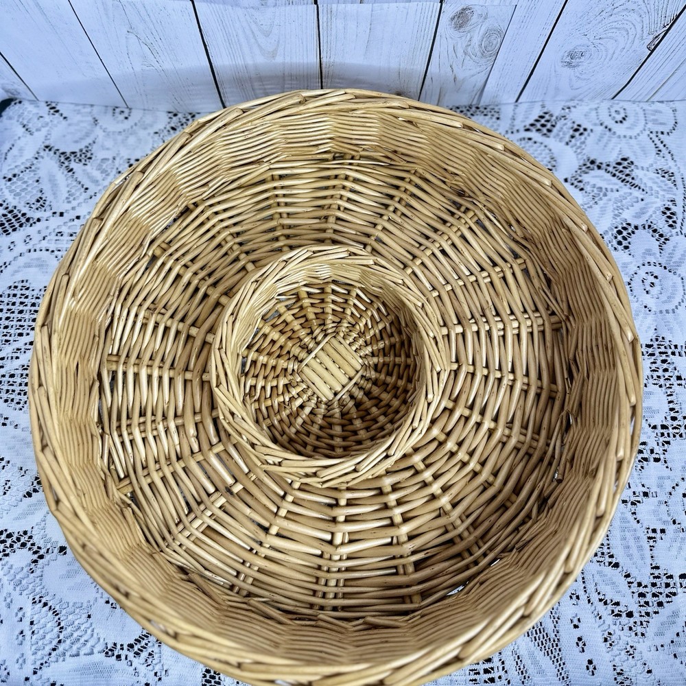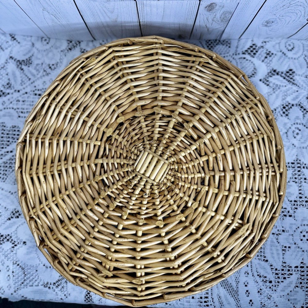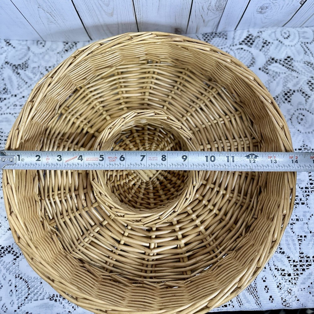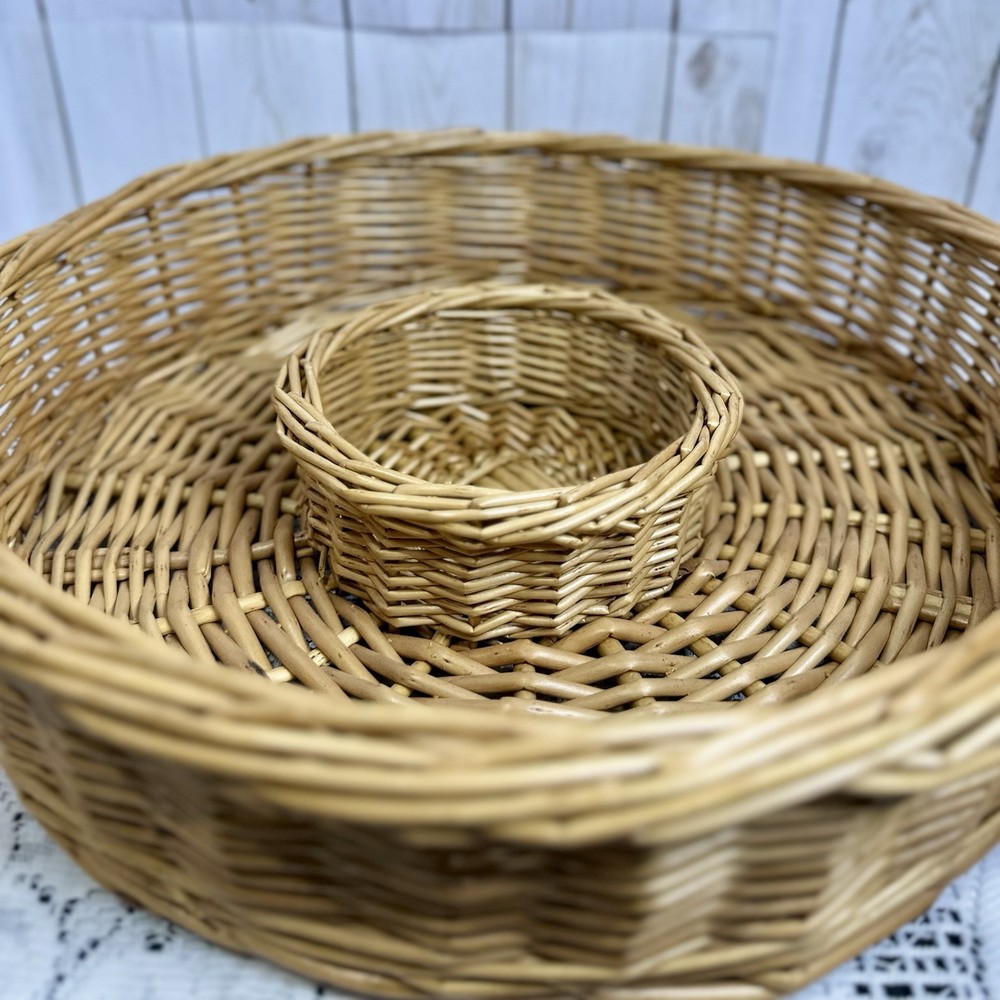 Elevate your hosting game with this extra-large, round wicker serving tray that exudes a cozy farmhouse vibe. Its natural brown hue pairs seamlessly with any decor, making it a versatile choice for all occasions. With a diameter of 14 inches, it offers ample space for an array of appetizers, snacks, and beverages, ensuring your guests are treated to a generously laid-out spread. Crafted for practicality, this tray features two compartments for organizing various dips and chips, making refills effortless and mess-free. Its sturdy wicker construction not only adds a rustic charm but also ensures durability for countless gatherings. Whether you're serving up chips and dip or arranging a fruit display, this tray is a functional and stylish addition to your serving collection. I do my best to accurately describe and photograph any imperfections. Please keep in mind that vintage items are pre-loved and may show signs of age and use. All vintage items are sold as-is, so please review the photos and description carefully before purchasing. Shipping & Packaging: As a small business, I do my best to stay budget- and earth-friendly. To reduce waste, I may use recycled boxes and packing materials when shipping your order. Rest assured, all items will be packed with care to ensure they arrive safely! I strive to have a fast turnaround time with most orders shipping within 24 hours. Please feel free to reach out with any questions! Thank you for looking at my listing, please check out my other listings for more great treasures!