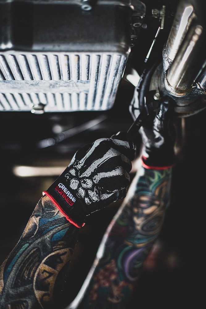 For most jobs around the house, yard or job site, this nitrile dipped glove is a great solution. The nitrile-dipped palm and fingers provide an improved grip. The knit backing allows the glove to breathe and helps prevents debris from entering the wrist. Additionally, the latex-free nature of this glove allows it to be worn by those with latex allergies. Nitrile coated gloves are perfect for a variety of jobs. Extreme automotive / biker enthusiasts will love the skeleton themed pattern. These tough but flexible gloves provide premium grip with impact protection and include touchscreen capabilities. Gloves | Tools for Your Hands. Maximum Hand Protection and Dexterity for Automotive Jobs and More Bone Series Foam Nitrile Mechanic Gloves are tough but flexible, providing both premium grip and impact protection | Size: Large Protects hands and provides tactile gripping when working around oil and grease - perfect for changing oil, changing tires, replacing fluids, and spark plugs Foam Nitrile coating: latex-free coating provides additional protection while resisting punctures and abrasions Skeleton themed pattern gloves designed for the extreme automotive / biker | Can be used as mechanics gloves, everyday work gloves, carpenters gloves, biking gloves, driving gloves, workout gloves, wheelchair gloves etc