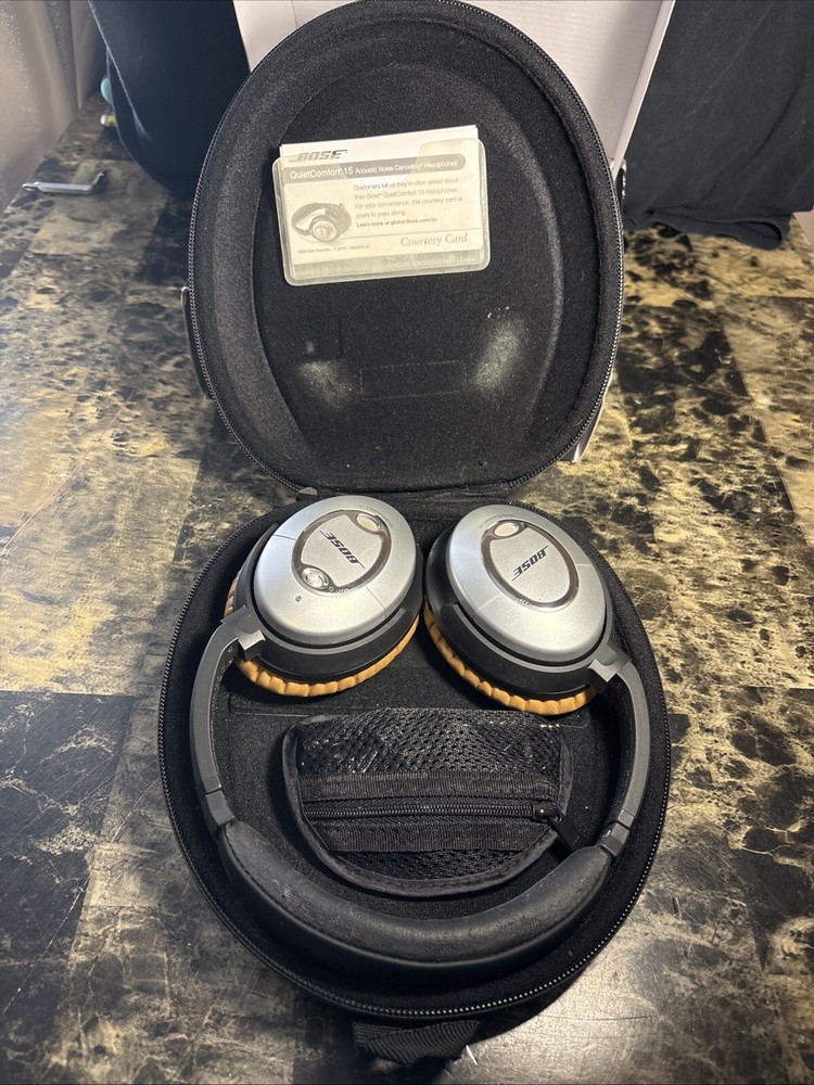 Experience ultimate sound quality with these Bose QuietComfort 15 wired headphones. Designed with a headband fit and over-the-ear cushioning, these headphones provide comfortable wear for extended periods. The noise cancellation feature allows for immersive sound, whether you're listening to music or taking calls. With a 3.5mm jack, these headphones are compatible with most devices. The sleek black and silver design adds a touch of sophistication to your audio experience. Perfect for studio monitoring, these headphones are tested and have replaceable earpads for prolonged use.