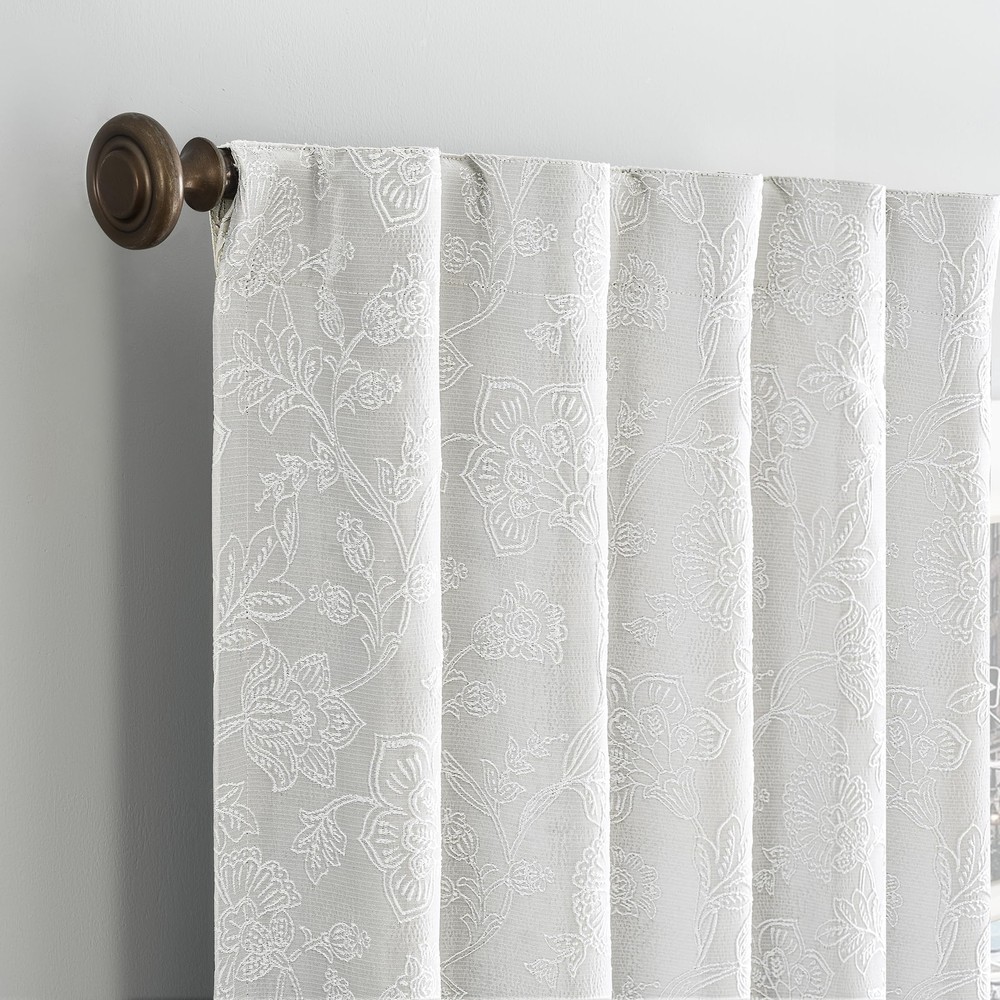 Featuring an intricately embroidered floral pattern, Brookhaven Embroidered Floral Pleated Look 100% Blackout Back Tab Curtain Panel Pairs breathe life into any living space. Equipped with built-in metal grommets for easy hanging on standard curtain rods up to 1.5" in diameter. Extreme Blackout™ Thermal Lining is laboratory tested to block out 100% of light, reduce outside noise by up to 40%, and decrease energy lost through your windows by up to 40%. Comfort is optimized with thermal properties that help keep summer heat and winter chill out of your home. back tabs allow for easy slide-through installation on curtain rods up to 1.5" in diameter. Hang in your entertainment room to eliminate screen glare and reduce distracting outside noise, or in your bedroom for enhanced privacy and a sounder, more uninterrupted sleep. Pair includes 2 cream panels, each measuring 50" width by 84" length. Measure carefully before selecting your desired size and quantity. Rod not included. Machine wash cold on gentle cycle. Use non-chlorine bleach when needed. Tumble dry on low heat, using a cool iron as needed. Intricately embroidered floral pattern adds intrigue Extreme Thermal Blackout technology blocks out 100% of outside light Thermal properties help keep summer heat and winter chill out of your home Noise reduction up to 40% helps you get a sounder, more uninterrupted sleep back tabs fit curtain rods up to 1.5" in diameter Pair includes (2) panels. Measure carefully prior to purchase.