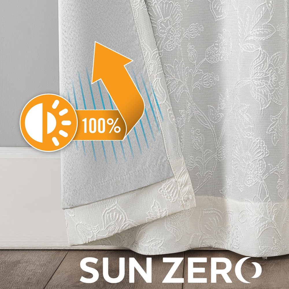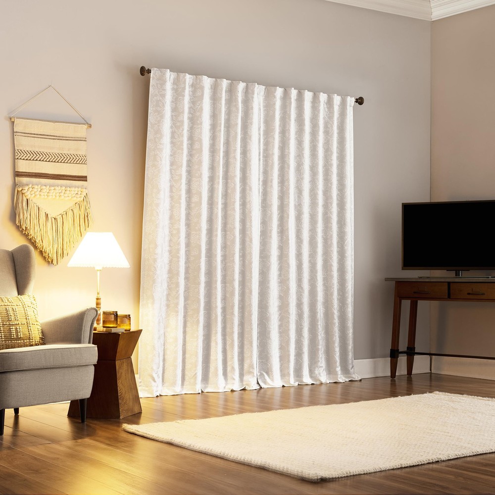 Featuring an intricately embroidered floral pattern, Brookhaven Embroidered Floral Pleated Look 100% Blackout Back Tab Curtain Panel Pairs breathe life into any living space. Equipped with built-in metal grommets for easy hanging on standard curtain rods up to 1.5" in diameter. Extreme Blackout™ Thermal Lining is laboratory tested to block out 100% of light, reduce outside noise by up to 40%, and decrease energy lost through your windows by up to 40%. Comfort is optimized with thermal properties that help keep summer heat and winter chill out of your home. back tabs allow for easy slide-through installation on curtain rods up to 1.5" in diameter. Hang in your entertainment room to eliminate screen glare and reduce distracting outside noise, or in your bedroom for enhanced privacy and a sounder, more uninterrupted sleep. Pair includes 2 cream panels, each measuring 50" width by 84" length. Measure carefully before selecting your desired size and quantity. Rod not included. Machine wash cold on gentle cycle. Use non-chlorine bleach when needed. Tumble dry on low heat, using a cool iron as needed. Intricately embroidered floral pattern adds intrigue Extreme Thermal Blackout technology blocks out 100% of outside light Thermal properties help keep summer heat and winter chill out of your home Noise reduction up to 40% helps you get a sounder, more uninterrupted sleep back tabs fit curtain rods up to 1.5" in diameter Pair includes (2) panels. Measure carefully prior to purchase.