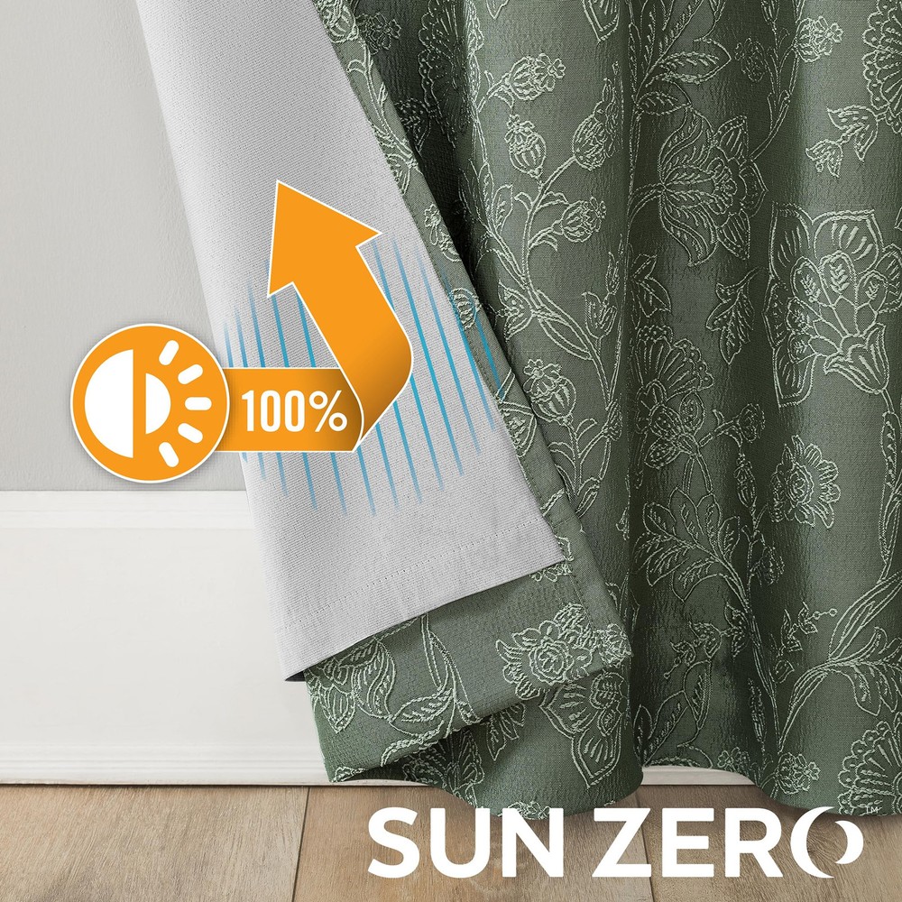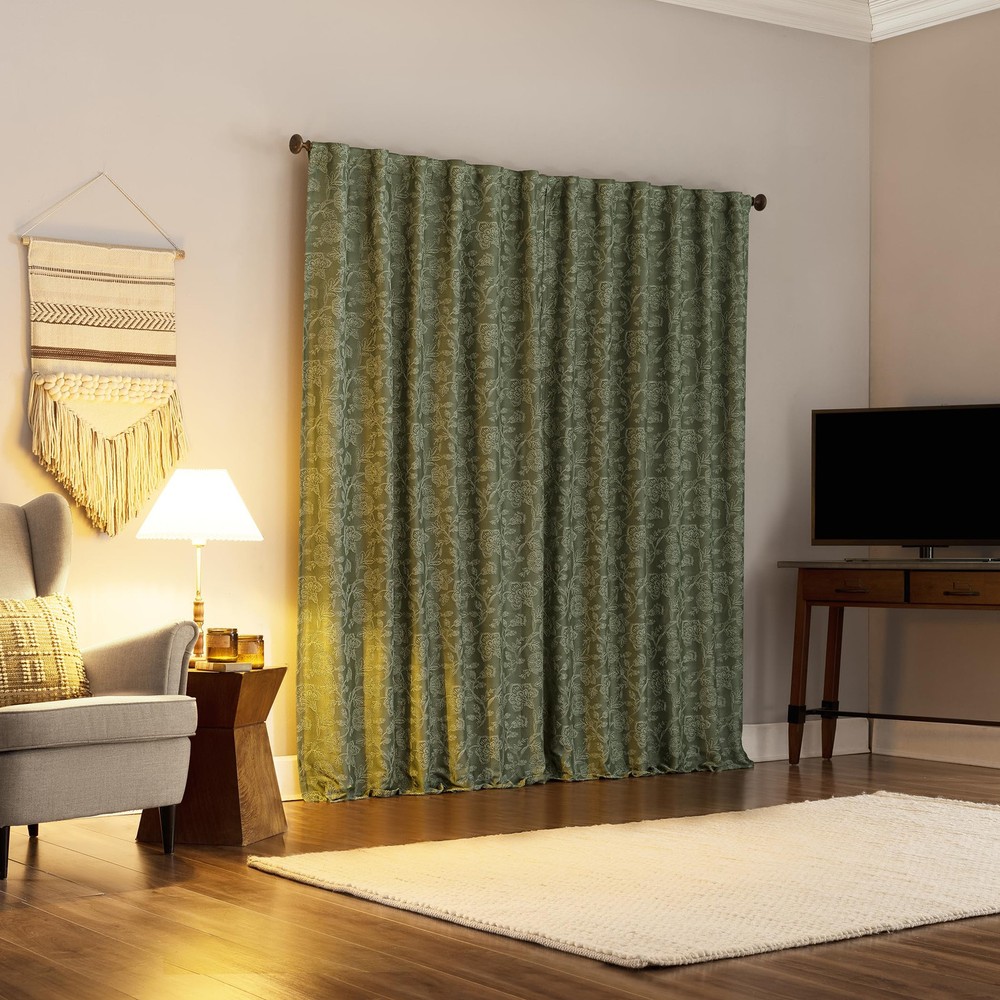 Featuring an intricately embroidered floral pattern, Brookhaven Embroidered Floral Pleated Look 100% Blackout Back Tab Curtain Panel Pairs breathe life into any living space. Equipped with built-in metal grommets for easy hanging on standard curtain rods up to 1.5" in diameter. Extreme Blackout™ Thermal Lining is laboratory tested to block out 100% of light, reduce outside noise by up to 40%, and decrease energy lost through your windows by up to 40%. Comfort is optimized with thermal properties that help keep summer heat and winter chill out of your home. back tabs allow for easy slide-through installation on curtain rods up to 1.5" in diameter. Hang in your entertainment room to eliminate screen glare and reduce distracting outside noise, or in your bedroom for enhanced privacy and a sounder, more uninterrupted sleep. Pair includes 2 moss green panels, each measuring 50" width by 84" length. Measure carefully before selecting your desired size and quantity. Rod not included. Machine wash cold on gentle cycle. Use non-chlorine bleach when needed. Tumble dry on low heat, using a cool iron as needed. Intricately embroidered floral pattern adds intrigue Extreme Thermal Blackout technology blocks out 100% of outside light Thermal properties help keep summer heat and winter chill out of your home Noise reduction up to 40% helps you get a sounder, more uninterrupted sleep back tabs fit curtain rods up to 1.5" in diameter Pair includes (2) panels. Measure carefully prior to purchase.