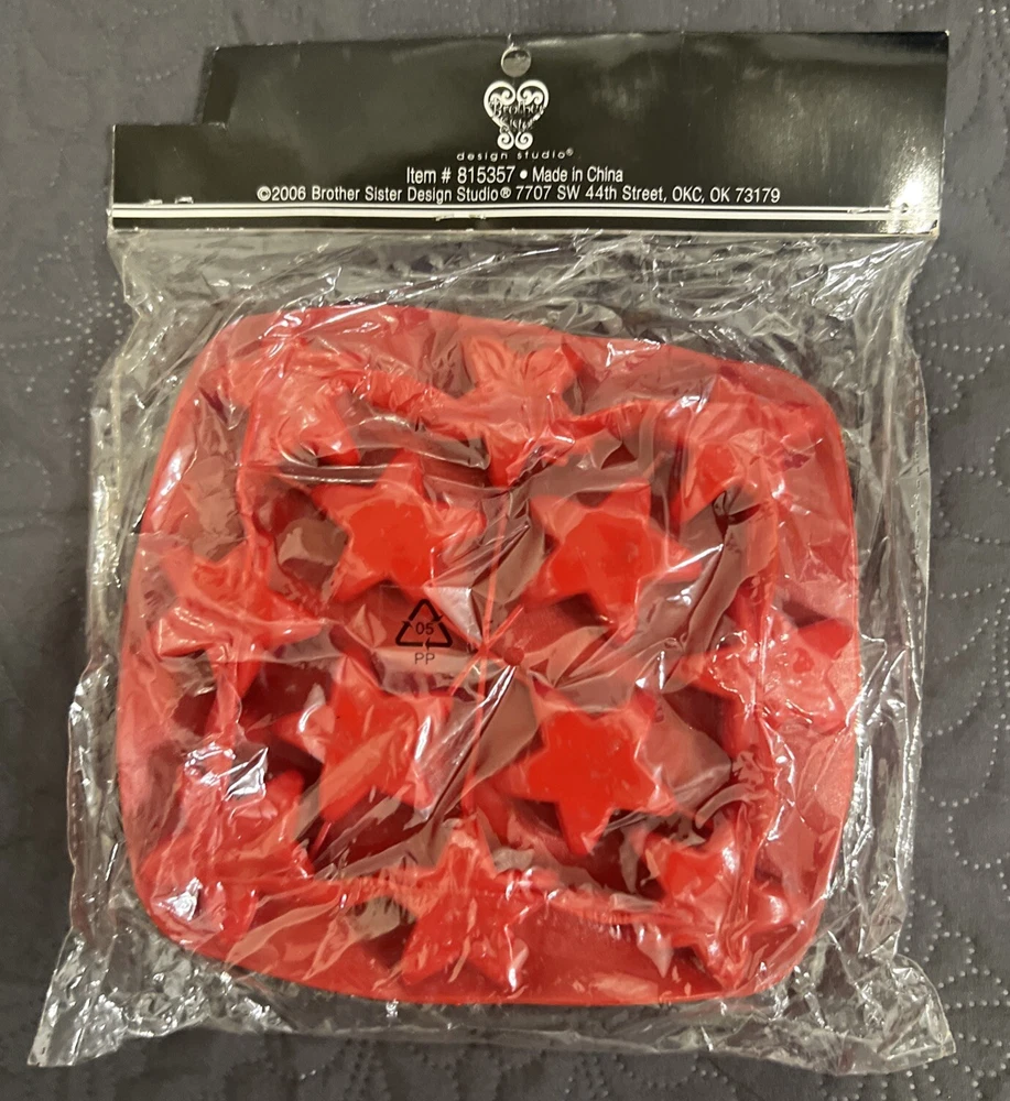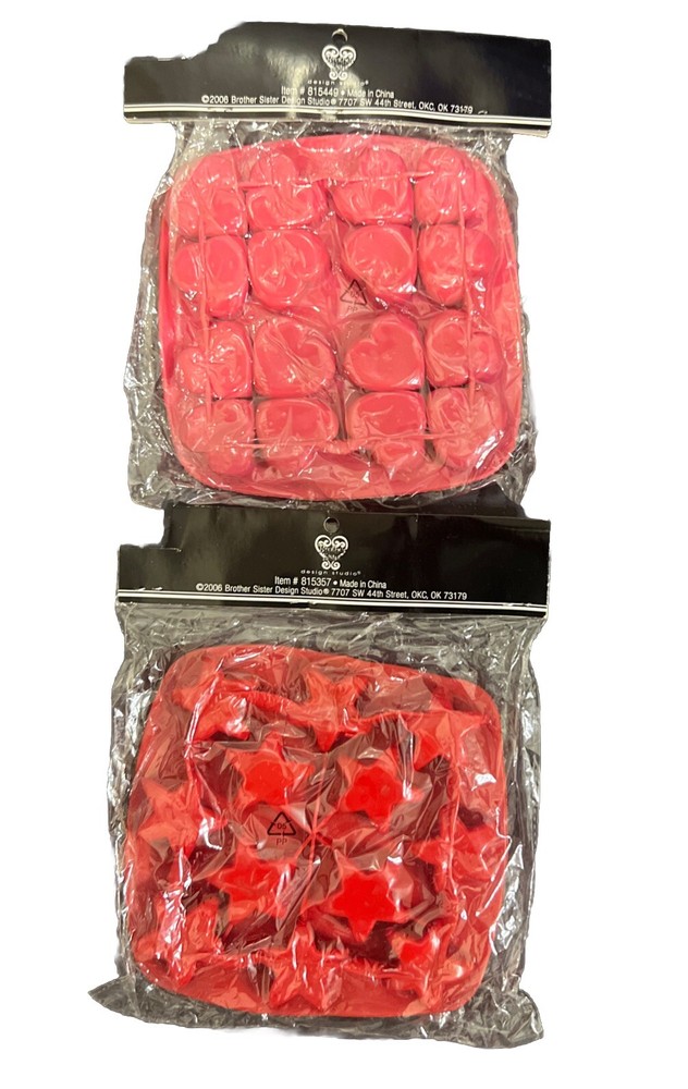 Brother Sister Design Studio Valentine Hearts & 4th of july Stars silicone mold 12 cavities 2pc Lot. Create beautiful gifts and cake decorations with this Stars Silicone Candy Mold. This lightweight silicone mold has an easy-release design and star-shaped openings. You can use this for chocolate, ice, and even candy. Place this in the fridge or freezer to set your treats, and you'll have them ready in no time. Material: Silicone Color: Red Care & Safety: Food Safe; Dishwasher Safe; Microwave, Oven, Fridge & Freezer Safe Quantity: 2 Tray (12 Cavities each) NEW with Tags, factory sealed. Part of tag cut out(See ALL photos).