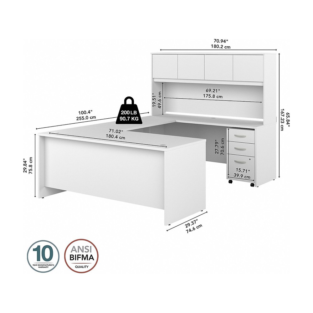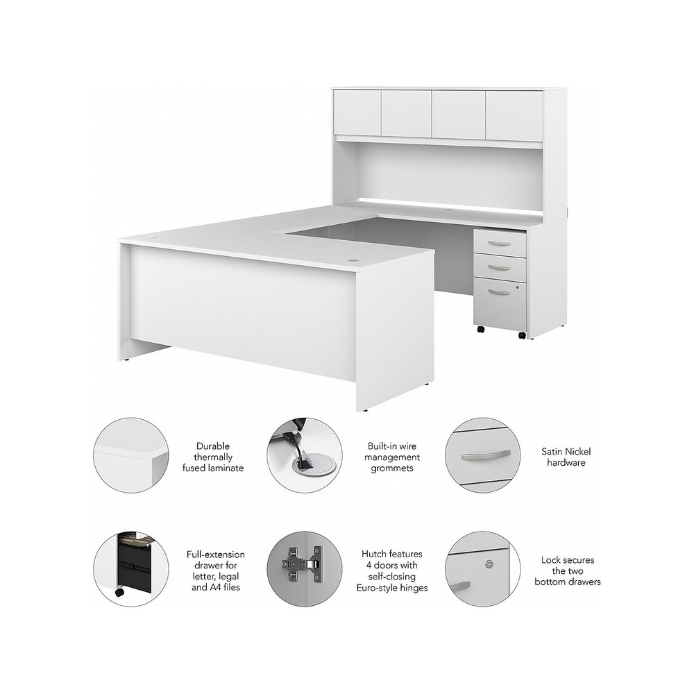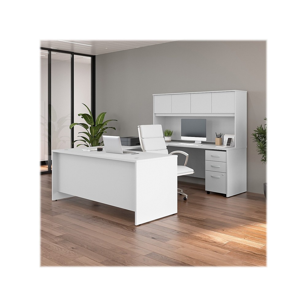 The Bush Business Furniture Studio C U-station with hutch and three-drawer mobile file cabinet offer a stylish, long-lasting workspace solution for today's professionals. The thermally fused laminate finish, durable edge banding, and sturdy end panels resist scratches, stains, or dents while standing up to the rigors of a 40-plus-hour work week. With four doors featuring self-closing Euro-style hinges, the hutch stores supplies, books, and more to keep your desk tidy. The 48"W return attaches to either side to create a right- or left-handed configuration. The locking file cabinet helps store letter-, legal-, A4-size paperwork and supplies... eBay STORE ABOUT US SAVE SELLER CONTACT US Bush Business Furniture Studio C 72" U-Station with Hutch and Mobile File Cabinet, White (STC070WHSU) - Sold as 1 Each The Bush Business Furniture Studio C U-station with hutch and three-drawer mobile file cabinet offer a stylish, long-lasting workspace solution for today's professionals. The thermally fused laminate finish, durable edge banding, and sturdy end panels resist scratches, stains, or dents while standing up to the rigors of a 40-plus-hour work week. With four doors featuring self-closing Euro-style hinges, the hutch stores supplies, books, and more to keep your desk tidy. The 48"W return attaches to either side to create a right- or left-handed configuration. The locking file cabinet helps store letter-, legal-, A4-size paperwork and supplies. This desk set has been meticulously tested to meet or exceed the ANSI/BIFMA standards for safety, durability, and performance and is backed by a 10-year manufacturer limited warranty. American-made with globally sourced materials. • U-shaped station with hutch and three-drawer mobile file cabinet offer a stylish, long-lasting workspace solution for today's professionals. • Modern style bundle is made of engineered wood in a white laminate finish. • Assembled dimensions: 66"H x 72"W x 100"D. • Locking file cabinet's bottom drawer accepts letter-, legal-, and A4-size papers, while two box drawers store small office supplies. • Single lock secures the two bottom drawers to protect sensitive documents and personal items. • Features built-in wire management grommets. • Assembly required. • Meets or exceeds the ANSI/BIFMA standards. • Desk surface offers space to spread out together with the integrated cable management to conceal computer cords. • Thermally fused laminate finish fends off scratches and stains. • Four hutch doors provide plenty of storage room and include self-closing Euro-style hinges. • Return attaches to either side of the office desk to create a spacious left- or right-handed configuration. • Credenza desk surface offers space to spread out materials or books. • Available in your choice of several contemporary and traditional finishes to fit any work environment. • Bundle includes: 72"W x 36"D office desk, 72"W x 24"D credenza desk, 48"W desk return, 72"W hutch, and three-drawer mobile file cabinet. • American-made with globally sourced materials. • Sold as 1 Each. You may be interested in our other listings on eBay.