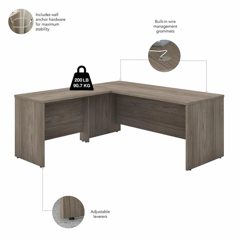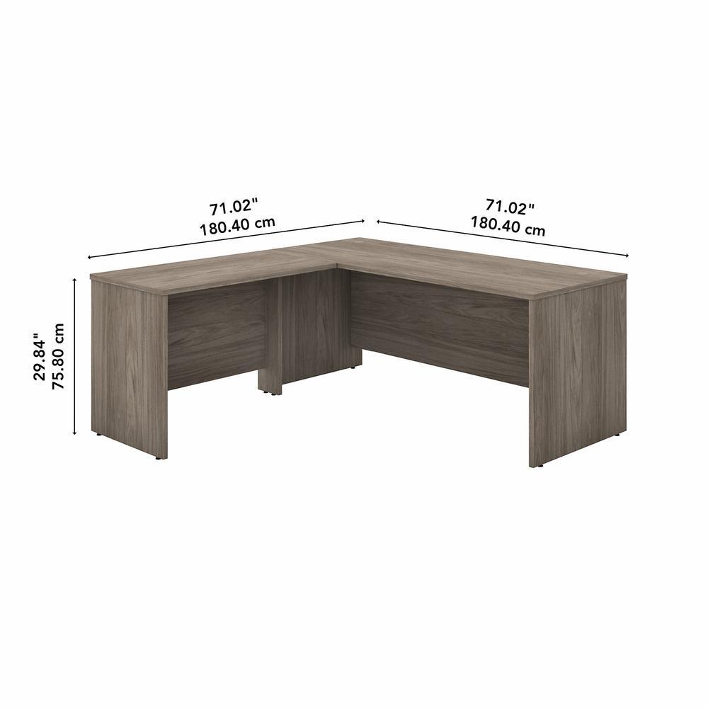 Bush Business Furniture Studio C 72W x 30D L Shaped Desk with 42W Return Bundle includes: 72W x 30D Office Desk, 42W x 24D Desk Return Durable thermally fused laminate surface and sturdy end panels protect the Corner Desk from scratches, stains, dings and dents L Shaped Desk supports multiple monitors and other materials with a weight capacity of 200 pounds Desktop includes built-in wire management grommets to keep cords and cables out of the way while you work Return attaches to either side for a right or left-handed configuration, and the L Desk is finished on all sides to look great facing any direction Available in your choice of several contemporary and traditional finishes Add under desk storage with Studio C's 2 and 3 Drawer Mobile File Cabinets; also accepts coordinating 72W Hutch (sold separately) Tested to meet ANSI/BIFMA quality standards for safety and performance Backed by the Bush Business Furniture 10 Year Manufacturer's Warranty American made with U.S. and imported parts Highlighted by its contemporary style and commercial quality design, the Bush Business Furniture Studio C 72W L Shaped Desk with 42W Return presents an ideal workspace for the modern professional. Take advantage of the spacious surface to spread out with a computer, paperwork and more as you tackle your next big project. The L shaped desktop easily accommodates multiple monitors and other materials with a 200 lb. weight capacity and built-in wire management grommets. Position the L Desk in a corner to save space in a small private office, or make use of the finished back to face outward in an open-plan environment. The Return can be installed on either side of the main work surface for a right or left-handed configuration. This corner desk is tested to meet ANSI/BIFMA standards for safety and performance and is backed by a 10 Year Warranty. American made with U.S. and imported parts. Product Specifications Finish Modern Hickory Weight Capacity 200 Item Depth 71.02 Item Height 29.84 Item Width 71.02 Style Statement Proven quality. Popular designs. Fresh finishes. Studio C updates our best-selling products with a contemporary feel that works for you and your office. Foot Print Depth 71.02 Foot Print Height 29.84 Foot Print Width 71.02 Item Material Laminate Over Engineered Wood (Paper), Steel, Metal, Plastic, Thermally Fused Laminate Over Engineered Wood (Melamine)