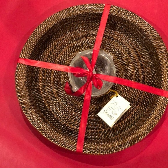 Les Chats Sommeillants Bringing the Very Best from Around the World to our American Homes New with Tags Calaisio Woven Chip & Dip Serving Tray with Removable Glass Bowl Insert 13.75" diameter As with all Calaisio products, this high-end chip & dip server is designed for both elegance and durability making it the perfect way to entertain. About Calaisio - These high-end products are handwoven and handmade by artisans who work and live in the South Pacific. Calaisio items are woven from a unique water wine (vignes d'eau), which only grow in the mountain jungles on remote islands in the South Pacific. The water-vine takes 1-7 days to hand-weave into a finished design yielding a substantially durable, heat-resistant and elegant product. *** Shipment same day as payment
