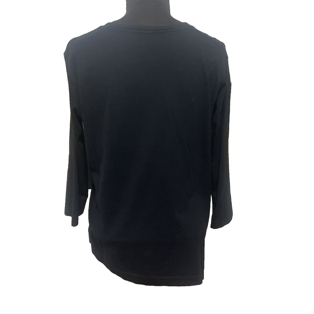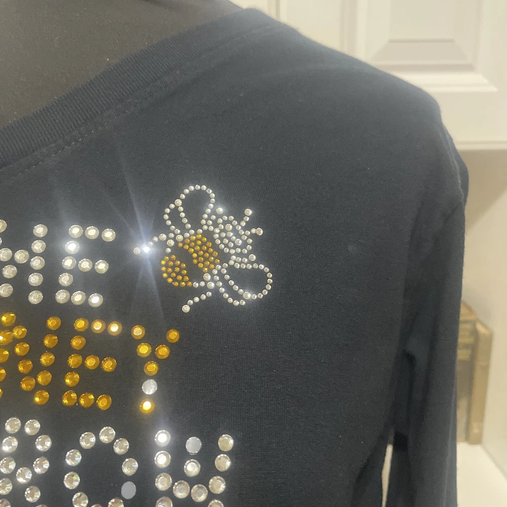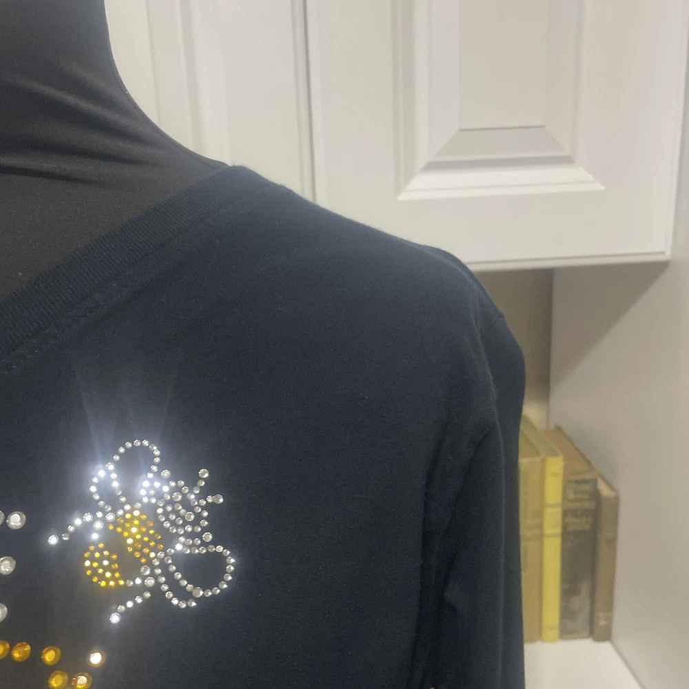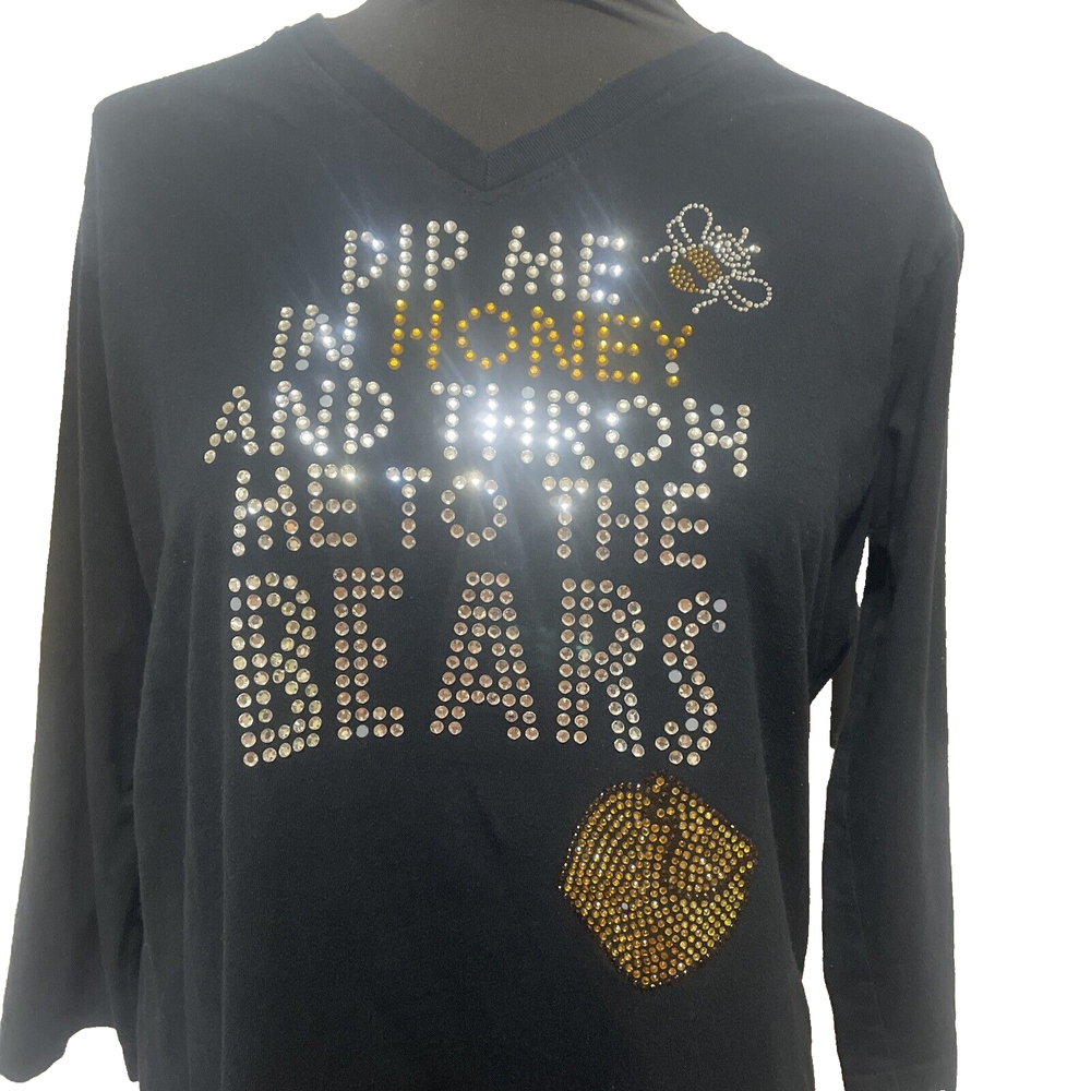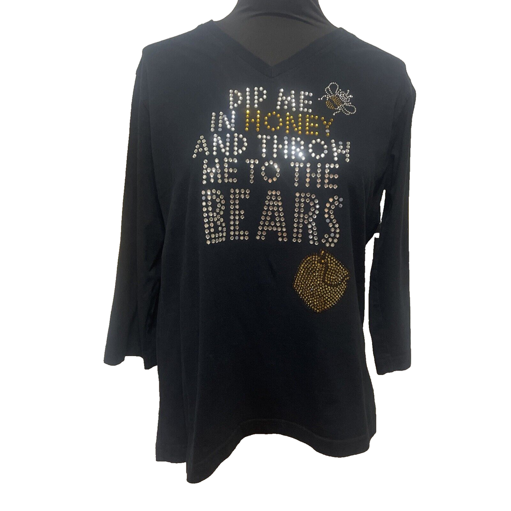 This C/A/T Brand women's t-shirt is a must-have for any fun fashion-forward individual. The black cotton material is accented with beaded bling, giving it a unique and stylish look. The v-neckline and 3/4 sleeves make it suitable for both casual and party/cocktail occasions. The pullover closure ensures a comfortable fit, while the regular fit and size type guarantee a great fit for most individuals. The graphic t-shirt features the phrase "Dip Me in Honey and Throw Me to The Bears" on the front, making it a great choice for those who love bees, honey, and bears. This t-shirt is made in India and is available in size L. Measurements in inches Thank you for your interest Please check out my other items and add us to your favorites. TERMS OF SALE 100% SATISFACTION GUARANTEED! PLEASE, ALWAYS CONTACT US WITH ANY PROBLEMS BEFORE LEAVING FEEDBACK OR INITIATING A RETURN! Every effort is made to describe all our items as honestly and accurately as possible! Our items are previously owned unless stated otherwise. We ship from a smoke free environment. We offer combined shipping to save you money. Please place items in your cart and purchase. Wait for an invoice before sending payment for multiple purchases! We are happy to answer any questions regarding our items, and additional photos are available upon request. We always leave very positive feedback in the Feedback Forum for a smooth transaction and would appreciate you doing the same.